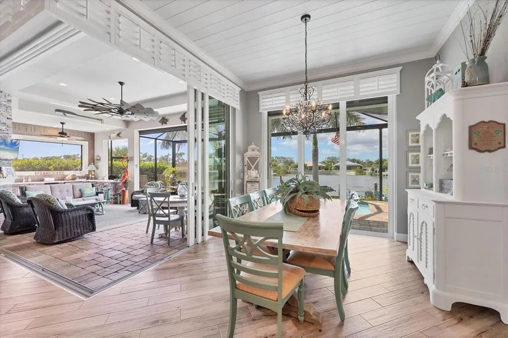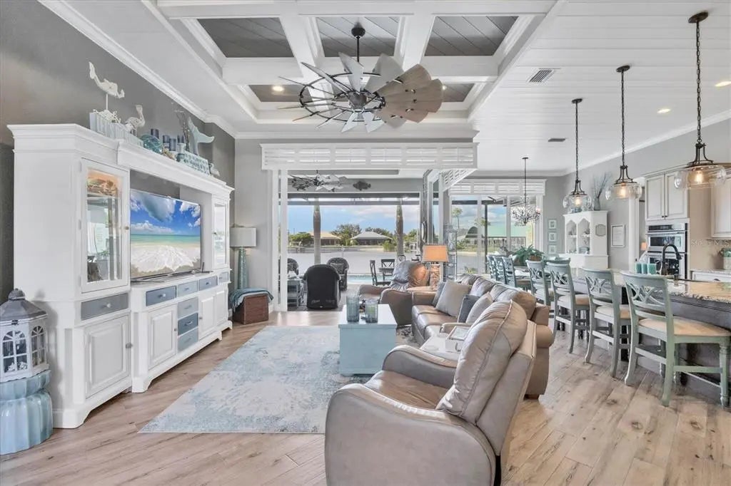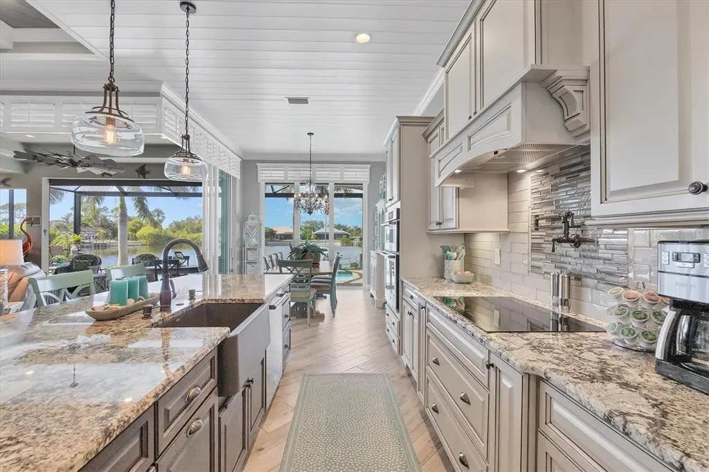 Exceptional 2017 coastal style waterfront home in the highly desirable boating community of South Gulf Cove with access to the Gulf. This stunning residence offers 2,128 sq. ft. under air with 3 bedrooms, 3 full baths, an office/den, and a 3-car garage, perfectly blending elegance, comfort, and craftsmanship. The open floor plan features diagonally laid ceramic plank tile, crown molding, plantation shutters, 8’ doors with custom trim, and wood-accented coffered ceilings. The chef’s kitchen is a showpiece, showcasing a 10’ granite island, stainless-steel appliances, induction cooktop, pot filler, glass tile backsplash, and custom cabinetry with pullouts. The wet bar includes granite counters, sink, wine refrigerator, and glass-front cabinetry, ideal for entertaining in style. Expansive 10', zero-corner sliders open to an oversized lanai featuring a floor-to-ceiling stone fireplace, granite outdoor bar with refrigerator and ice maker, and a heated saltwater pool complete with sun shelf, therapy jets, and LED lighting. The panoramic picture window, no-seeum screen enclosure perfectly frames breathtaking views across the 400-foot-wide Santa Cruz Waterway, offering unforgettable sunsets. Outdoor highlights include a sunken LP gas fire pit, 36' x 8' TREX composite dock with water and electric, 10,000 lb. covered boat lift, and a full seawall. Lush, pro-vista grass and tropical landscaping is maintained by an irrigation system that draws from the canal, no city water bill! Additional features include transferable flood insurance, a new standing-seam metal roof with transferrable warranty, impact windows, generator hookup, security system, tongue-and-groove wood ceilings, and enclosed garage storage with golf cart door. Conveniently located halfway between Sarasota and Fort Myers, this home is minutes from world-class fishing, championship golf courses, two Major League Baseball spring training facilities, pristine Southwest Florida beaches, and an array of shopping and dining options. A perfect blend of luxury and livability, experience true coastal Florida living at its finest! Paradise awaits you!!!