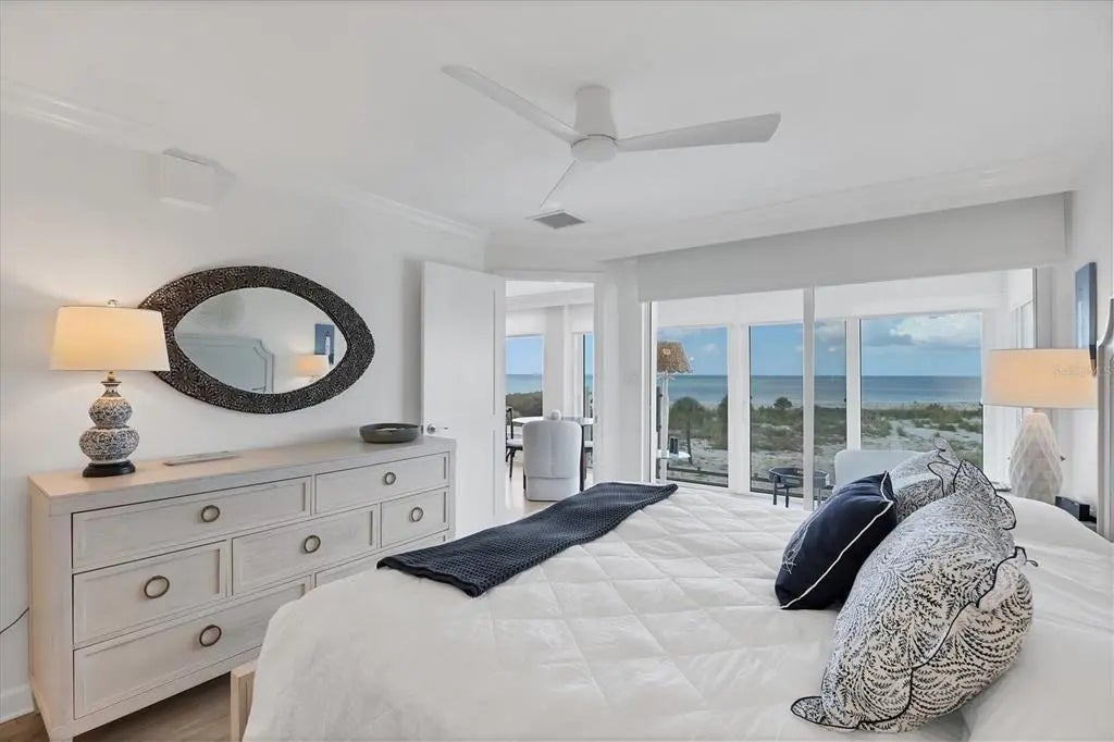 Luxurious Top-Floor Condominium with Gulf Views in Boca Grande Club This stunning top-floor condominium offers an unparalleled retreat with sweeping Gulf views and convenient elevator access. The renovated kitchen features a breakfast bar, custom soft-close cabinetry, sleek white quartz countertops, and stainless appliances. The gulf front bedroom includes a walk-in closet with custom organization system. The spacious primary bathroom has been thoughtfully designed to offer double sinks and expansive countertop space. Additional upgrades include modern lighting, luxury vinyl wide plank flooring, motorized Somfy fabric window shades, full size washer dryer and glass safety railings along the Gulf side to preserve unobstructed beach views. The residence is beautifully furnished and upgraded with impact-resistant windows and sliding doors, along with elegant crown molding throughout. As a member of this beachfront gated community, enjoy access to exceptional amenities, including a recently renovated Gulf-front restaurant, tiki bar, three pools, eight Har-Tru tennis courts, pro shop, and fitness center.