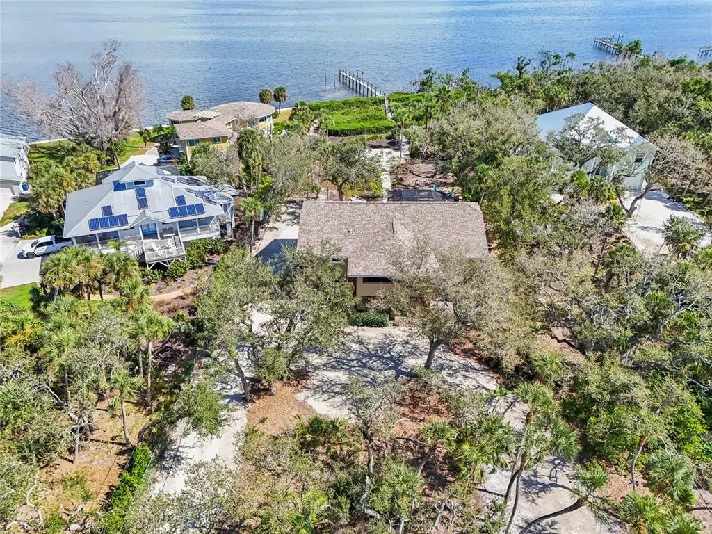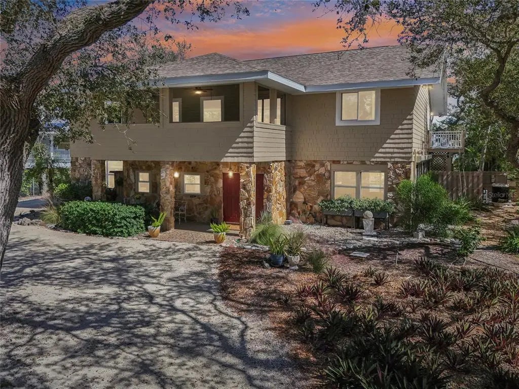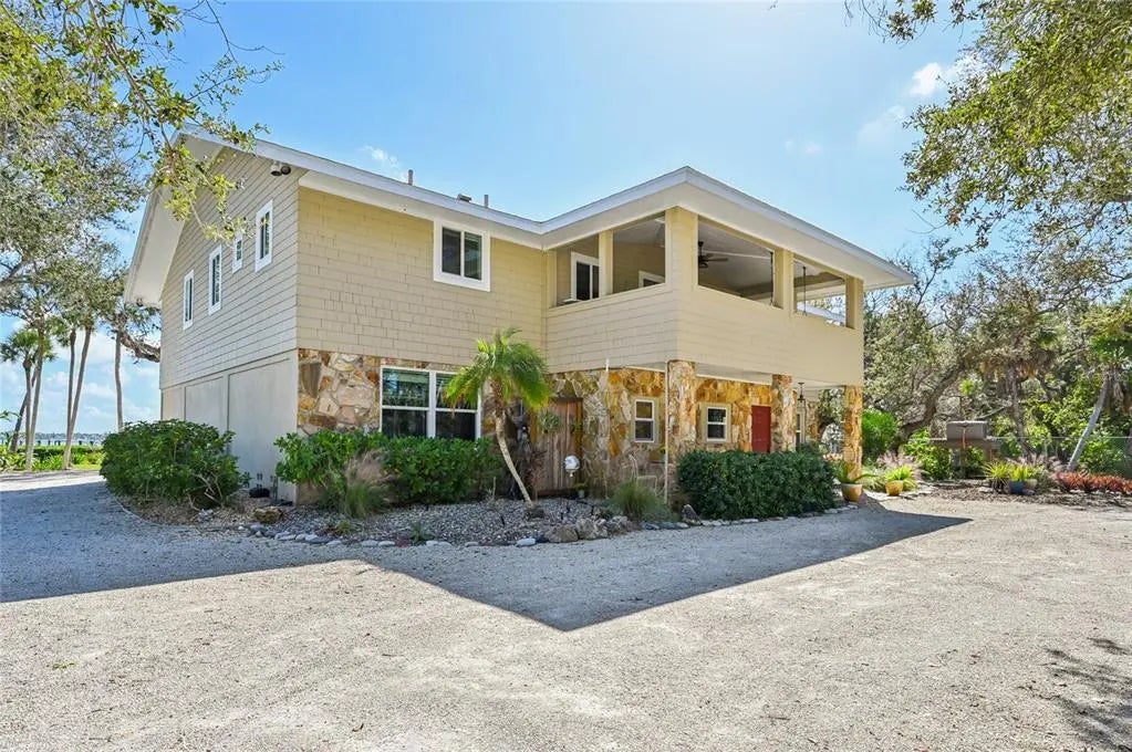 From sunrise on the bay to sunset on the gulf, this beautiful Manasota Key home offers the ultimate Florida lifestyle on nearly 1.5 acres. A long private driveway lined with majestic oaks leads to a two-story, three-bedroom, two-bathroom retreat with deeded beach access. The home is being sold turnkey furnished, so you can simply bring your suitcase and start living the relaxed island life. Stone accents and double doors set the tone for its curb appeal, while spacious elevated front and back porches invite you to enjoy the views from every angle. The elevator makes access to the main living level a breeze. Inside, vaulted ceilings and gleaming wood floors create a bright open feel in the great room, and multiple sliding glass doors frame the peaceful bay views. The dining area has panoramic views of Lemon Bay where you can enjoy watching the boats go by. The kitchen blends coastal style with function, featuring shaker-style wood cabinetry, quartz countertops, a glass tile backsplash, and a breakfast bar. The primary bedroom opens to the rear porch, perfect for morning coffee overlooking the water, and includes a walk-in closet with built-ins, and the en-suite bathroom features a double vanity and a large walk-in shower. Guest bedrooms feature reach-in closets, and the upstairs guest bathroom includes a single vanity and a tiled shower/tub combo. The interior laundry room is thoughtfully designed with cabinetry, shelving, and a utility sink. Downstairs offers a large bonus area with epoxy flooring, 9-foot ceilings, and three sets of sliding glass doors leading to the pool and backyard. This space is ideal for a gym, game room, or extra guest area. Outdoor living shines here, with a 2016 saltwater heated pool, sundeck, and spa surrounded by paver decking and enclosed by a screened lanai for comfort. Beyond the screened area, a charming path winds toward the bay, where a firepit, bench, and fountain create the perfect place to relax. The dock was rebuilt in 2025 and is ready for your boat, with a lift that can be repaired or replaced to fit your needs. From this location, getting out on the water is simple and convenient. Head south to Stump Pass or Boca Grande for a day of boating and fishing, or cruise north toward Venice Beach and Midnight Pass and enjoy many waterfront dining options along the way. This home includes thoughtful upgrades such as restored solid maple flooring, cedar construction on concrete pilings, impact windows and doors, a whole-house generator and buried 500 gallon propane tank, double garage spaces, and a circular driveway. 6091 Manasota Key Road is more than a home; it’s a lifestyle surrounded by the beauty of Lemon Bay and the Gulf.