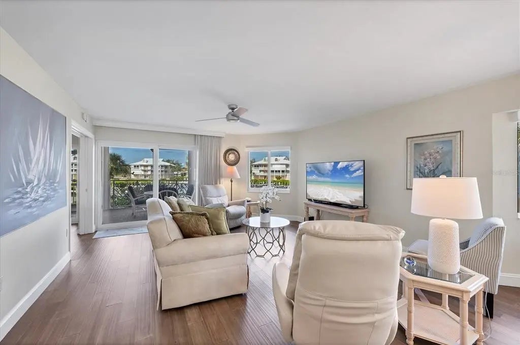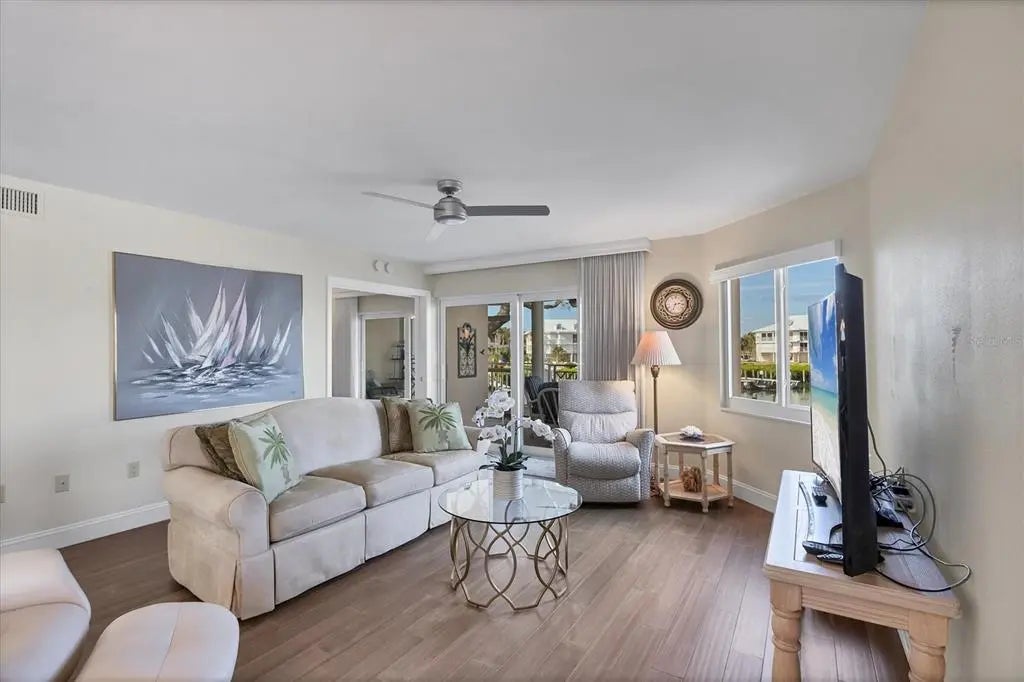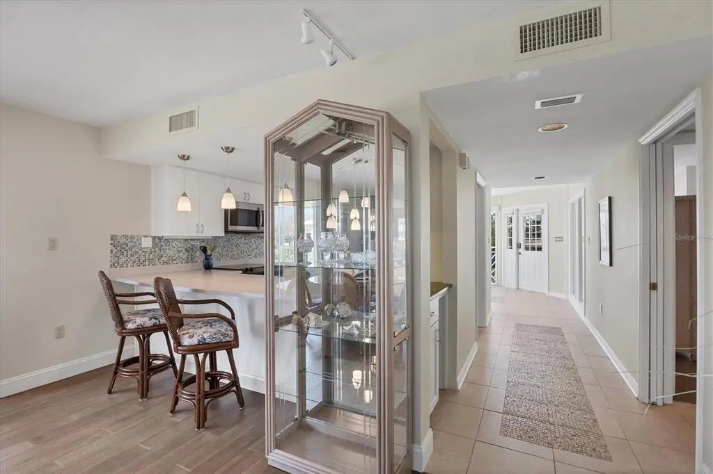 New photos just added! The show the completion of the new boat basin, progress of the main Clubhouse, and much of the new landscaping work complete. Exceptional Coastal Living at Placida Harbour Club! Phenomenal multi-year, community-wide improvements and renovations are nearly complete making Placida Harbour better than ever. From new building roofs, gutters, paint, and elevators. Freshly dredged boat basin with new seawalls, 70 brand new slips with composite docks, waterfront walkways, and kayak launch. New twin-engine, 20-person island ferry to Little Gasparilla Island and its pristine, private Gulf beaches. Fully renovated main clubhouse, spa, and fitness center, card room and resort style cabana. New composite island pier, dock slips and walkways, pickleball/tennis courts, and many more. Enjoy this superb corner residence at the prestigious Placida Harbour Club, a luxury gated boating community offering unparalleled amenities and direct access to the Gulf. This beautifully designed 2-bedroom, 2-bath home with an oversized 2-car tandem garage boasts a prime location offering water views from all rooms. Experience three fantastic, unmatched full water views from the harbor/marina, to a partial bay view, and tranquil vistas of the pond and fountain. Just steps away, the multi-story, bayfront clubhouse and pool invite you to enjoy resort-style relaxation every day. With 1,675 sq. ft. of spacious living, this home features an open floor plan, abundant natural light from newly installed large picture windows and sliding glass doors, and two screened lanais, and a Juliet-balcony. Relax on the large back lanai, overlooking the docks and harbor/marina, and watch the manatees play. The quaint front lanai views the pond and bay. Recent cohesive updates include impact-resistant windows and sliders, new screening, engineered bamboo wood flooring, fresh interior paint, and Quartz countertops in the kitchen and guest bath with a new 60/40 Kraus stainless steel sink, Moen stainless steel faucets, and Insinkerator disposal. The foyer/reading room offers oversized fixed-glass windows perfect for enjoying sunrise views over the bay and pond. The spacious kitchen features a breakfast bar, extensive cabinet and counter space, and open views in every direction.