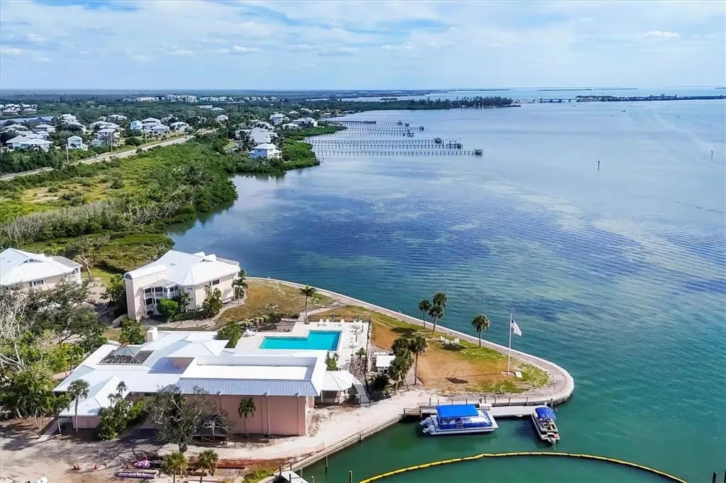 Exceptional Coastal Living at Placida Harbour Club! Phenomenal multi-year, community-wide improvements and renovations are nearly complete making Placida Harbour better than ever. From new building roofs, gutters, paint, and elevators. Freshly dredged boat basin with new seawalls, 70 brand new slips with composite docks, waterfront walkways, and kayak launch. New twin-engine, 20-person island ferry to Little Gasparilla Island and its pristine, private Gulf beaches. Fully renovated main clubhouse, spa, and fitness center, card room and resort style cabana. New composite island pier, dock slips and walkways, pickleball/tennis courts, and many more. Enjoy this superb corner residence at the prestigious Placida Harbour Club, a luxury gated boating community offering unparalleled amenities and direct access to the Gulf. This beautifully designed 2-bedroom, 2-bath home with an oversized 2-car tandem garage boasts a prime location offering water views from all rooms. Experience three fantastic, unmatched full water views from the harbor/marina, to a partial bay view, and tranquil vistas of the pond and fountain. Just steps away, the multi-story, bayfront clubhouse and pool invite you to enjoy resort-style relaxation every day. With 1,675 sq. ft. of spacious living, this home features an open floor plan, abundant natural light from newly installed large picture windows and sliding glass doors, and two screened lanais, and a Juliet-balcony. Relax on the large back lanai, overlooking the docks and harbor/marina, and watch the manatees play. The quaint front lanai views the pond and bay. Recent cohesive updates include impact-resistant windows and sliders, new screening, engineered bamboo wood flooring, fresh interior paint, and Quartz countertops in the kitchen and guest bath with a new 60/40 Kraus stainless steel sink, Moen stainless steel faucets, and Insinkerator disposal. The foyer/reading room offers oversized fixed-glass windows perfect for enjoying sunrise views over the bay and pond. The spacious kitchen features a breakfast bar, extensive cabinet and counter space, and open views in every direction.