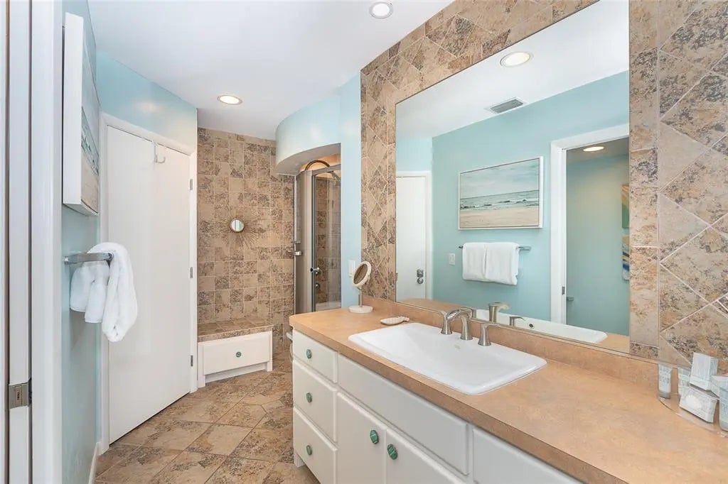 One of the most desirable 3-bedroom, 3 bath beachfront villas ready for Immediate Sale. Completely renovated with crown molding, unique shiplap and designer light fixtures throughout. Newer appliances and sea turtle approved roller shade. Brand NEW air conditioner, hot water heater and roof. This Villa is beautifully decorated and move-in ready. The kitchen is spectacular with an unprecedented center view of the sparkling Gulf. Double ovens and French door refrigerator. Designer granite countertops expand to a large half-moon snack bar or buffet space complete with additional cabinetry and wine fridge. No detail has been overlooked to provide ultimate enjoyment & entertainment possibilities. The main living room is the perfect spot to relax while enjoying phenomenal views. Your screened in patio provides a central location to watch boats along the Gulf or your friends and family frolicking at the pool, hot tub and grilling area steps away. The primary bedroom has a gorgeous ensuite with a highly desirable walk-in closet, private water closet, custom designer Kohler shower with multiple shower heads and jets. The sunny second bedroom has a king bed with designer finishing touches so your guests will feel welcome and pampered. This home has bamboo floors in the main living areas with tile in the kitchen and bathrooms. Fabulous carpeting has been installed up the stairs and throughout the entire upstairs. Upstairs you will be delighted to find expansive living space with lockable storage space. An additional living room is the perfect gathering spot for entertaining or getting some space to relax. The sliding doors lead you out to one of the best views of the Gulf, where you can enjoy our legendary sunsets with your favorite beverage. The third full bath is a high-end designer Kohler Mickey Mouse Theme with a highly desirable tub. This delightful theme carries through to the third bedroom complete with 4 twin beds. You'll also find a large sunshine filled bonus loft area with built-in shelving. The convenient laundry room on the main floor boasts gorgeous cabinetry for endless storage. This Villa is a charming oasis where you can simply relax and enjoy the bounties of nature or graciously entertain loved ones while making incredible lifelong memories. The fabulous pool, hot tub, beach and tennis courts are steps away from your front door. Multi-level porches provide unparalleled water views along with the coastal breeze drifting in from the Gulf and spectacular sunsets! This villa is also one of the most sought-after rental properties within the Palm lsland Resort and can generate an income if so desired. Enjoy the island lifestyle and 7 miles of pristine beach. Join the vibrant tennis and pickleball program or start your shell and sharks tooth collection now!