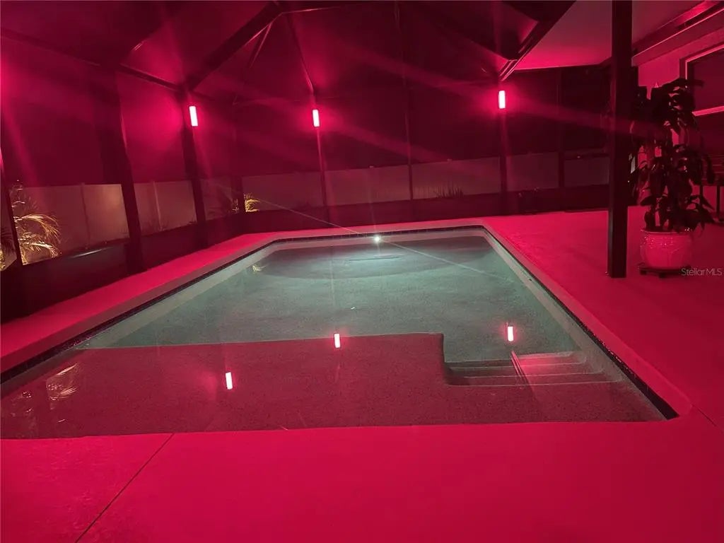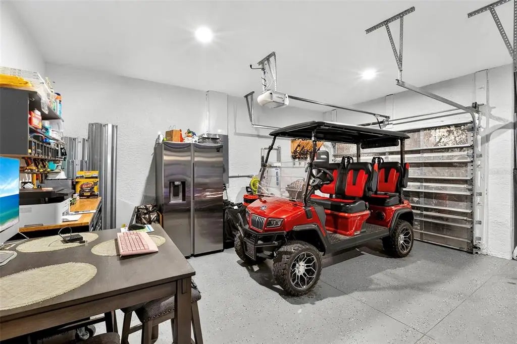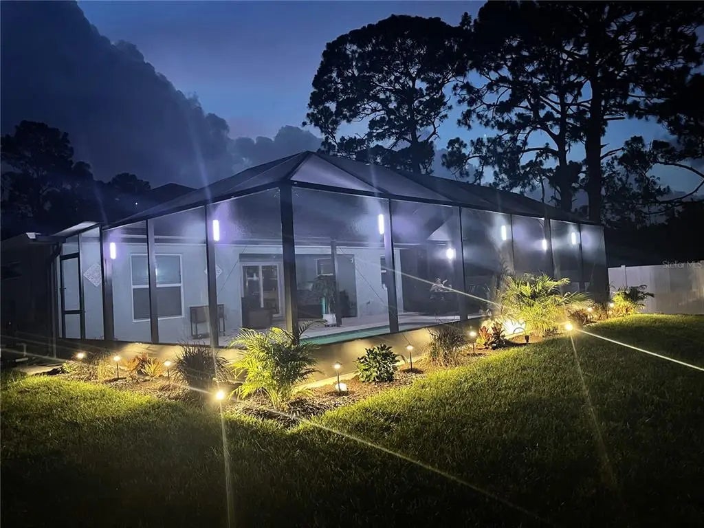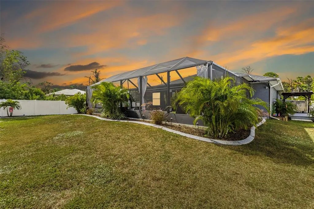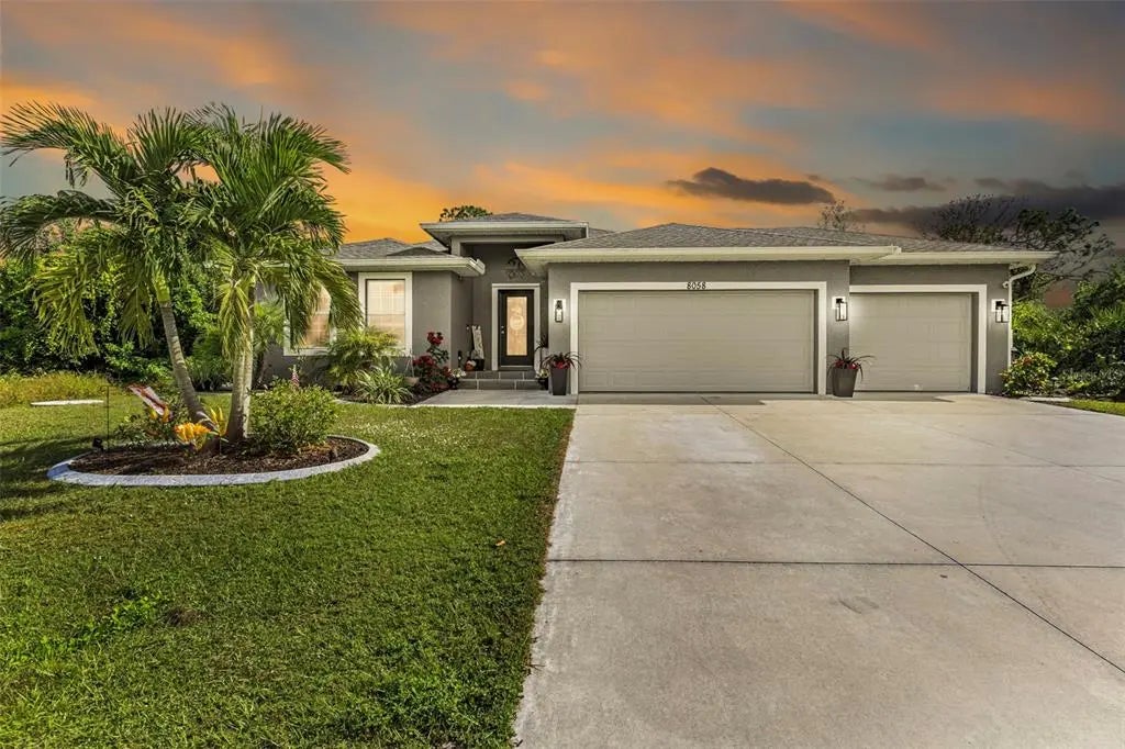 Experience Florida living at its finest in this beautifully maintained 3-bedroom, 2-bath home with an oversized 3-car garage. The spacious open-concept design features tile flooring throughout, cathedral and tray ceilings, granite countertops, and recessed lighting that create a bright and elegant atmosphere. The kitchen is equipped with stainless steel appliances, a large island, a walk-in pantry, and a living room area that opens to the lanai through sliding glass doors, making indoor-outdoor living seamless. Outside, enjoy your private backyard retreat complete with a heated SALT WATER pool, extended lanai with LED lighting, and a mounted TV that stays with the home. A custom 10x24 side deck perfect for your grill that enhances the outdoor entertainment space. The yard is fully enclosed with a vinyl privacy fence and gate, beautifully landscaped with concrete curbing, low-voltage lighting in the front and back, and a 10x10 storage shed. The garage has been upgraded with epoxy flooring, insulated and equipped with a mini-split A/C, and insulation, offering the potential for flexible use. Additional highlights include a WHOLE-HOUSE REVERSE ORMOSIS SYSTEM, pre-wiring for a 13,000-watt generator (included in the sale), and hurricane/storm shutters for added protection. Situated in South Gulf Cove community with convenient access to shopping, dining, and boating, this home was thoughtfully designed for comfort, efficiency, and the Florida lifestyle.