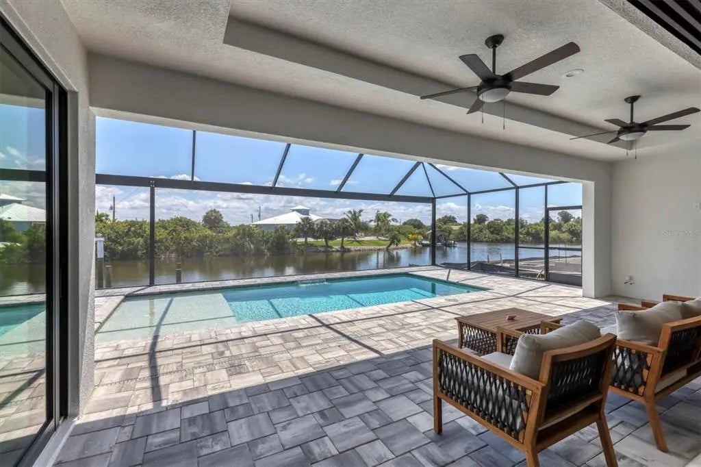 Under Construction. **Stunning Waterfront Home in South Gulf Cove** Welcome to your dream home! This beautiful property features 3 bedrooms, 3 bathrooms, and a den, perfectly designed for modern living. This home is currently under construction, and buyers may still make selections as long as materials have not been ordered. Please note: Photos shown are of similar completed homes, and certain finishes cannot be guaranteed. Situated on a seawalled lot with direct Gulf access, this home offers the best of waterfront living in the sought-after South Gulf Cove community. As you step inside, you'll be greeted by an open and airy floor plan with 14ft ceilings in the great room and 9ft ceilings throughout the rest of the home. The kitchen is a chef's delight, boasting high-quality dove-tailed, soft-closing cabinetry, and stunning granite countertops. Whether you're hosting a dinner party or enjoying a quiet evening at home, the spacious living areas provide the perfect setting. The primary suite is a true retreat, featuring a luxurious en-suite bathroom and ample closet space. Two additional bedrooms offer plenty of room for family or guests. The den can be used as a home office, library, or extra living space, adapting to your needs. Outside, the screened lanai and sparkling pool provide a private oasis for relaxation and entertainment. With a decorative block wall at the water for Dramatic water view! The home is built with impact glass throughout, eliminating the need for hurricane shutters, and R-19 spray foam insulation in the attic ensures energy efficiency and comfort year-round. The 3-car garage offers plenty of space for vehicles and storage. Located in the desirable South Gulf Cove community, this home provides a perfect blend of luxury, convenience, and waterfront living. Buyers still have the opportunity to choose selections and colors, making this home uniquely theirs! Don't miss the opportunity to make this spectacular home yours. Schedule a showing today and experience the best of Florida living