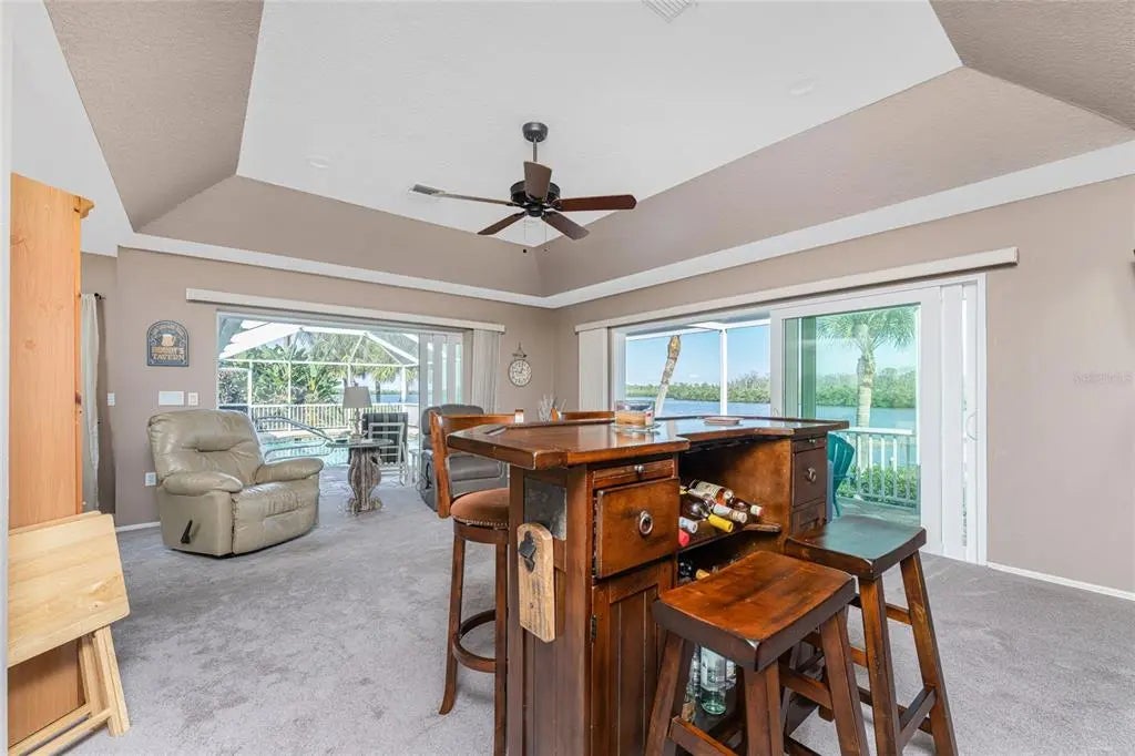 JUST - WOW! What a spectacular panoramic view of Coral Creek, as soon as you enter! Coral Creek is one of the most pristine and natural bodies of water in this entire area! And it's not just about the view - This stunning spacious home is being sold FURNISHED (with just a couple of exceptions) so no need to spend $1000's more on furniture! The open floor plan features a formal living and dining room, with sliding glass doors opening onto the lanai. The kitchen is a cook's delight, with plenty of cabinetry, granite countertops, and stunning backsplash. Appliances include: BRAND NEW French door refrigerator, microwave, smooth top stove, and dishwasher (all GE) There's a pass through to the lanai, making entertaining a breeze! The butler's pantry provides all the storage you might need for your food items or your pots/pans/small appliances! The built in desk area w/tumbled marble backsplash is a great place to set up your laptop and printer, and perhaps a cookbook or two! Dinette/breakfast nook is handily located in between the kitchen and family room with sliding glass doors opening on to the lanai. Speaking of the family room, this is where you are sure to gather and watch a football game or movie! There's an electric fireplace for some extra ambiance, tray ceiling and a decorative bar! The primary bedroom features easy care laminate flooring, tray ceiling and ceiling fan, two walk in closets and another set of sliding glass doors to the lanai, providing a GREAT WATER VIEW, The Primary Bath has updated plank tiled flooring, updated vanity w/granite countertop and double basins, new mirrors, and COMPLETELY UPDATED ROMAN SHOWER. Guest bedrooms both have ample room so your guests won't feel crowded, plus ceiling fans and wall closets. Guest Bath has a combo tub/shower for those who enjoy a nice soak! Inside laundry houses the Samsung washer and dryer, Two car garage has pull down stairs, with access to the attic, and an automatic garage door opener. The lanai and pool area are the HIGHLIGHT of this home, with pavered decking and wrap around seating area. The beautiful solar HEATED pool has a sparkling pebbletec finish (done in about 2020) and the HUGE POOL CAGE WAS REPLACED IN 2023 - built strong to withstand wind! Tile Roof new in 2020, overhead garage door in 2020, and AC in 2018. BEST OF ALL, THERE'S A PHOTOVOTAIC SOLAR SYSTEM FOR WHOLE HOUSE, saving you thousands on your electric bill. (Last month the seller's electric bill was less than $30!) IMPACT WINDOWS provide peace of mind, and the StormSmart screens protect the lanai. CORAL CREEK is perfect for kayaking, paddle boarding and shallow draft boating access on out to Lemon Bay and pristine beaches. Cape Haze Windward is a deed restricted subdivision, with an 18 hole golf course in its midst. Shopping is close by, and famous Boca Grande, known for it's tarpon fishing, white sandy beaches, and celebrity visitors are just minutes down the road and over the causeway. There are numerous airports that provide fast and easy access, depending on where you are travelling from: Punta Gorda Airport (PGD), Sarasota International (SRQ), Fort Myers (RSW), and Tampa International Airport (TPA) are all within a reasonable drive. Homes with this natural scenic view don't come on the market very often, So don't delay!