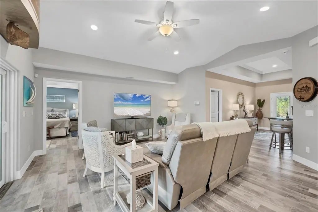 This beautiful home is located in the heart of South Gulf Cove complete with resort style pool with outside oasis. The wonderful home design encompassing 3 bedrooms, 2 baths, and an oversized 3-car garage. The open kitchen includes a walk-in pantry, spacious island, breakfast/dining area, and sliding glass doors leading to the lanai. The master bedroom includes a walk-in closet, walk-in shower, and dual sink vanity. The remaining 2 bedrooms are located by a secondary bath which includes a shower/tub combo. The home features cathedral ceilings, tray ceilings, wood look tile throughout, granite countertops in the kitchen and bathrooms, recessed lighting, ceiling fans in every room, and stainless steel appliances. Ipgrade include Hurricane shutters including automatic Hurricane screens for the front door and patio, Garage air conditioner, Privacy Fence, Stain Glass, Cage Lighting and Alarm System.