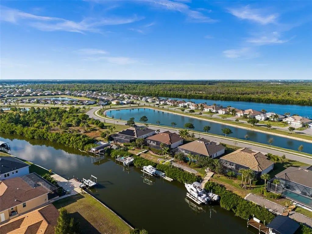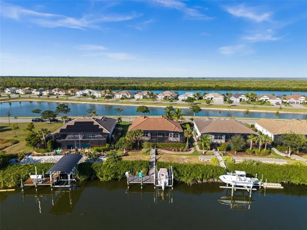 A rare opportunity in Harbor West: the community’s lowest-priced waterfront home with premium sailboat access and a 10,000-lb boat lift—paired with one of the neighborhood’s most sought-after floor plans. This Oakmont model rests gracefully on an expansive 14,476 sq ft homesite, offering an inviting blend of space, comfort, and coastal elegance with 3 bedrooms, 2.5 baths, and a 3-car garage. Step inside and discover a residence that lives like a designer showcase. Coffered ceilings trimmed in crown molding, an elevated coastal palette, and soaring 11’ ceilings create an atmosphere of refined sophistication, enhanced by streams of natural sunlight that fill the home with warmth. Neutral tile plank flooring flows throughout, adding both beauty and practicality, while plantation shutters elevate the home’s timeless coastal charm. The gourmet kitchen stands as the centerpiece with its impressive 11-foot island, sleek cooktop, built-in microwave and oven, and a charming dinette that frames tranquil canal views. Wall-to- wall 8’ sliders dissolve the boundary between interior comfort and outdoor serenity, opening to the pool and lanai for seamless Florida-style living. Outside, the southern-exposure pool area feels like a private retreat—sun-drenched and thoughtfully designed with an expansive pool deck, a fully appointed outdoor kitchen, and a heated pool and spa, perfect for gatherings both intimate and grand. The spacious primary suite offers an indulgent haven with an oversized walk-in closet and a spa-inspired en suite showcasing dual vanities, a soaking tub, and a luxurious walk-in shower. Guest accommodations are ideally placed on the opposite wing of the home, each enjoying their own bath and convenient pool bath access, ensuring comfort and privacy for all. Refined finishes continue throughout with a tile roof, impact-resistant windows and doors, and a beautifully crafted paver driveway and walkway leading to the dock and lift. At the water’s edge, the dock is fully outfitted with a fish cleaning station and an underwater fish light, enhancing both convenience and enjoyment for boating and fishing enthusiasts. This home embodies the essence of the Florida waterfront lifestyle—a harmonious blend of elegance, relaxation, and exceptional boating access.