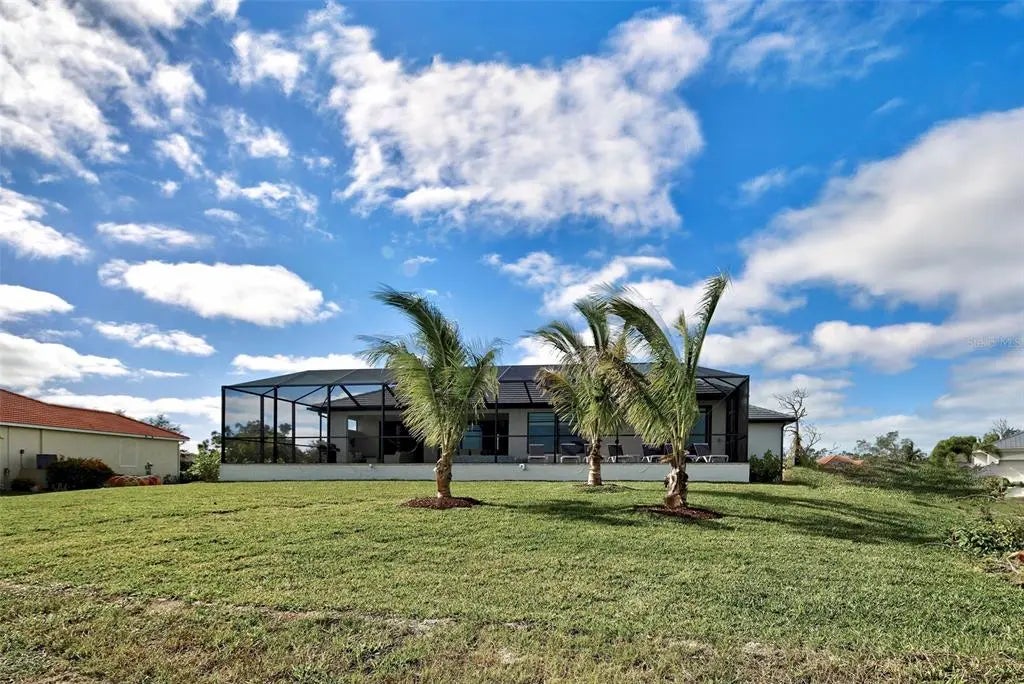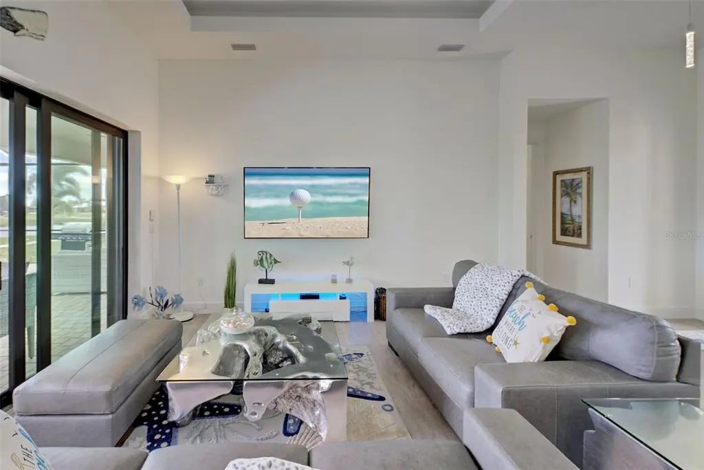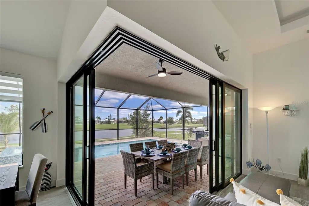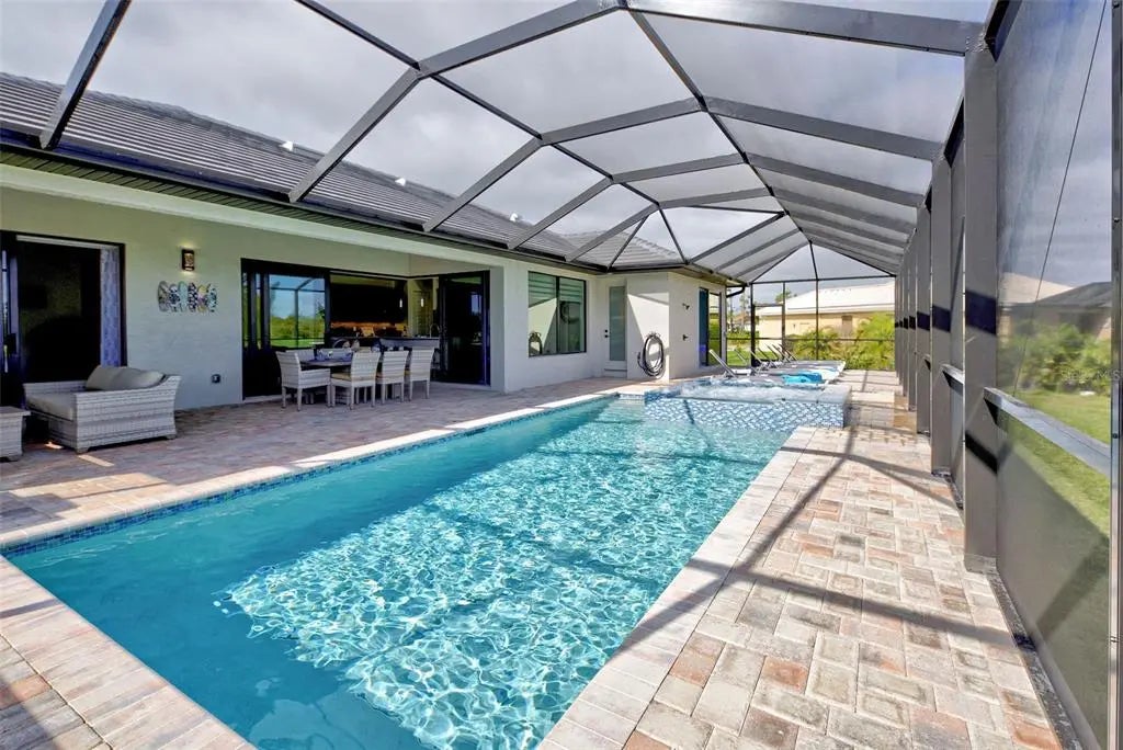 YOU can have it all: PANORAMIC GOLF COURSE AND POND VIEWS! AN ALMOST NEW 4 BEDROOM (1 Main & and 1 Junior Suite) / 3 BATH / 3 CAR GARAGE HOME! HEATED POOL WITH HOT TUB EMBEDDED IN A LARGE PAVER COATED POOLDECK! A COMBINED EASEMENT OF MORE THAN 90 FOOT LEFT AND RIGHT OF THE HOME FOR EXTRA PRIVACY! If you are seeking uniqueness in a perfect location - you'll find it here in the prestigious Golfing Community of Cape Haze with its distinct positive lifestyle. From the privacy of your screened lanai you are overlooking the game of Golf on the Links Golf Course with its nice Pond with all kind of wildlife. Built in 2023 with an open split floorplan with a generous living space, this home has only been gently used by it's European owners. It offers a seamless blend of contemporary elegance and functionality. It is located very close to the Boca Grande Beaches. You will instantly be greeted by the welcoming, open-concept Great Room with soaring 11 FT Tray Ceilings with LED Mood Light, the sun-drenched split floorplan with open Pool and Pond views. Dramatic Kitchen with 3cm Phoenix sparkling Diamond Quartz, with waterfall left & right of island, great breakfast bar, lots of counter space, pantry with wood shelving, stainless steel appliances, upgraded MAPLE ESPRESSO cabinetry, soft close doors and drawers, integrated microwave, a wine refrigerator and silver canvas glass tile backsplash with undercabinet lighting. It's the perfect place to prepare delicious meals while enjoying panoramic views of the Golf Course. Entertain with ease as the flow out to the lanai has 3 stacking 8 FT glass sliders on one side and a 90-degree slider on the other so you can bring the outside in. Large covered lanai with pool with rectangular hot tub is embedded in a brick pavered pool deck. Whirlpool functions can be handled easily by a handheld remote control. All water features can be heated on cooler days. Start your day sipping coffee on the spacious lanai, gazing at the calm water glowing in the morning sun. Spacious Main Suite with direct access to the pool deck. Great Master bath with his and her vanity, freestanding Mermaid tub plus walk-around shower both with Turquoise Mosaic accents, privacy toilet and his and hers walk-in closet. Junior Suite with a large walk-in-closet and an en-suite bathroom with walk-in shower. A pocket door separates the guest quarters from the main living area with two Guest bedrooms. They share a bathroom with a single vanity and walk in shower. This bathroom also serves as a pool bath. Junior Bath and Guest come with the new elegant LED lighted vanity mirrors. All flooring is wood look Luxury Vinyl. The inside laundry room comes with sink and frontloading washer and dryer. The durable Dark Charcoal Blend SAXONY Tile Roof is designed to withstand the elements. There is a 2 car garage plus an enclosed single garage with a door with coded lock to the double garage. Both garages come with the durable Epoxy floor. Windows and the 8 FT Sliding Doors are Impact Resistant for added security and protection. If Golf is your Game – this is your ideal Home.