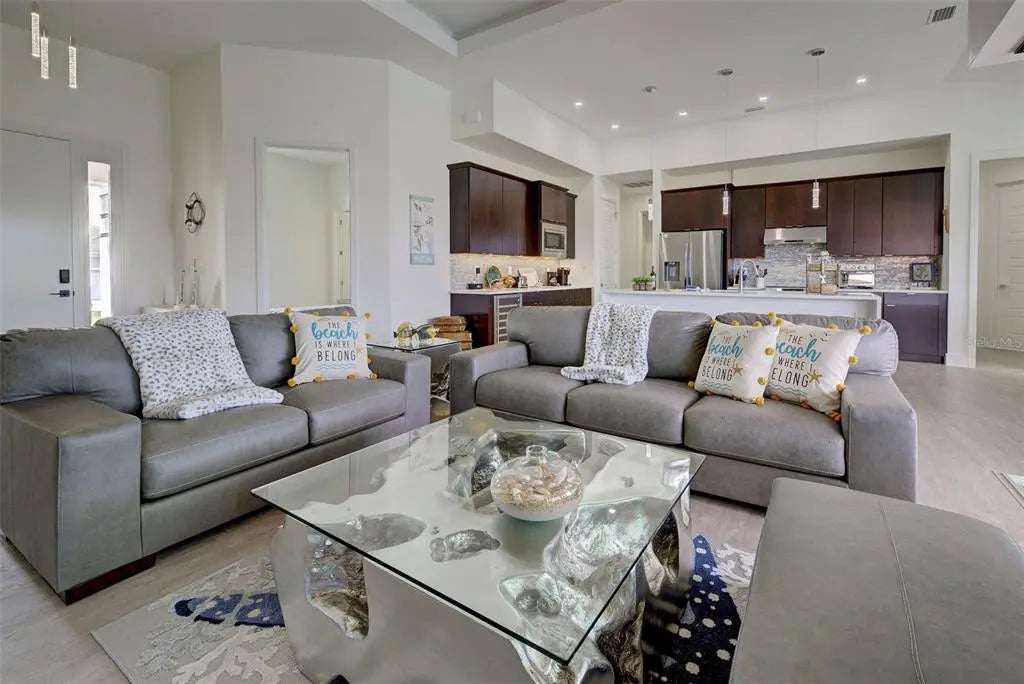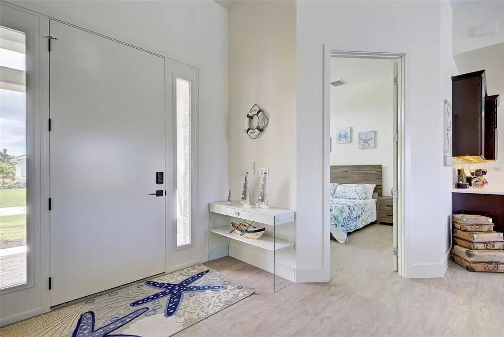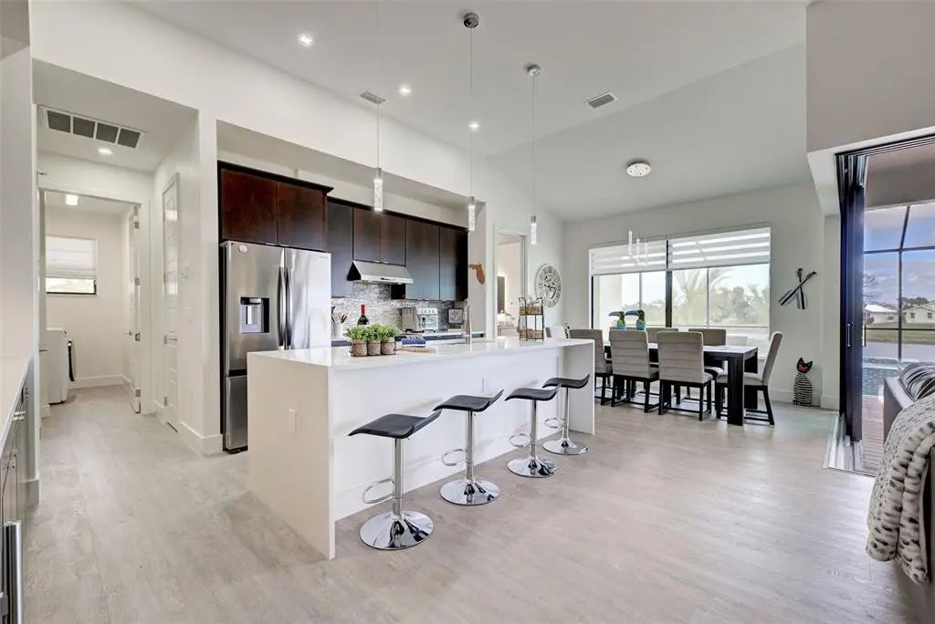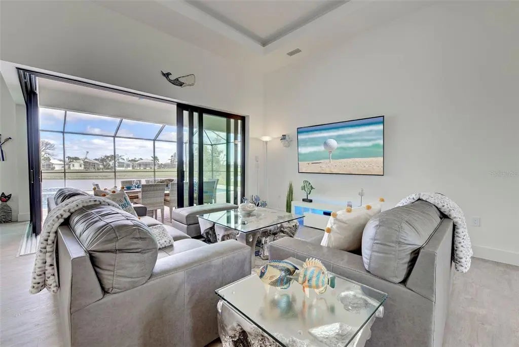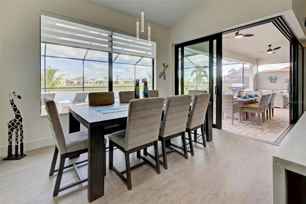YOU can have it all: PANORAMIC GOLF COURSE AND POND VIEWS! AN ALMOST NEW 4 BEDROOM (1 Main & and 1 Junior Suite) / 3 BATH / 3 CAR GARAGE HOME! HEATED POOL WITH HOT TUB EMBEDDED IN A LARGE PAVER COATED POOLDECK! A COMBINED EASEMENT OF MORE THAN 90 FOOT LEFT AND RIGHT OF THE HOME FOR EXTRA PRIVACY! If you are seeking uniqueness in a perfect location - you'll find it here in the prestigious Golfing Community of Cape Haze with its distinct positive lifestyle. From the privacy of your screened lanai you are overlooking the game of Golf on the Links Golf Course with its nice Pond with all kind of wildlife. Built in 2023 with an open split floorplan with a generous living space, this home has only been gently used by it's European owners. It offers a seamless blend of contemporary elegance and functionality. It is located very close to the Boca Grande Beaches. You will instantly be greeted by the welcoming, open-concept Great Room with soaring 11 FT Tray Ceilings with LED Mood Light, the sun-drenched split floorplan with open Pool and Pond views. Dramatic Kitchen with 3cm Phoenix sparkling Diamond Quartz, with waterfall left & right of island, great breakfast bar, lots of counter space, pantry with wood shelving, stainless steel appliances, upgraded MAPLE ESPRESSO cabinetry, soft close doors and drawers, integrated microwave, a wine refrigerator and silver canvas glass tile backsplash with undercabinet lighting. It's the perfect place to prepare delicious meals while enjoying panoramic views of the Golf Course. Entertain with ease as the flow out to the lanai has 3 stacking 8 FT glass sliders on one side and a 90-degree slider on the other so you can bring the outside in. Large covered lanai with pool with rectangular hot tub is embedded in a brick pavered pool deck. Whirlpool functions can be handled easily by a handheld remote control. All water features can be heated on cooler days. Start your day sipping coffee on the spacious lanai, gazing at the calm water glowing in the morning sun. Spacious Main Suite with direct access to the pool deck. Great Master bath with his and her vanity, freestanding Mermaid tub plus walk-around shower both with Turquoise Mosaic accents, privacy toilet and his and hers walk-in closet. Junior Suite with a large walk-in-closet and an en-suite bathroom with walk-in shower. A pocket door separates the guest quarters from the main living area with two Guest bedrooms. They share a bathroom with a single vanity and walk in shower. This bathroom also serves as a pool bath. Junior Bath and Guest come with the new elegant LED lighted vanity mirrors. All flooring is wood look Luxury Vinyl. The inside laundry room comes with sink and frontloading washer and dryer. The durable Dark Charcoal Blend SAXONY Tile Roof is designed to withstand the elements. There is a 2 car garage plus an enclosed single garage with a door with coded lock to the double garage. Both garages come with the durable Epoxy floor. Windows and the 8 FT Sliding Doors are Impact Resistant for added security and protection. If Golf is your Game – this is your ideal Home.