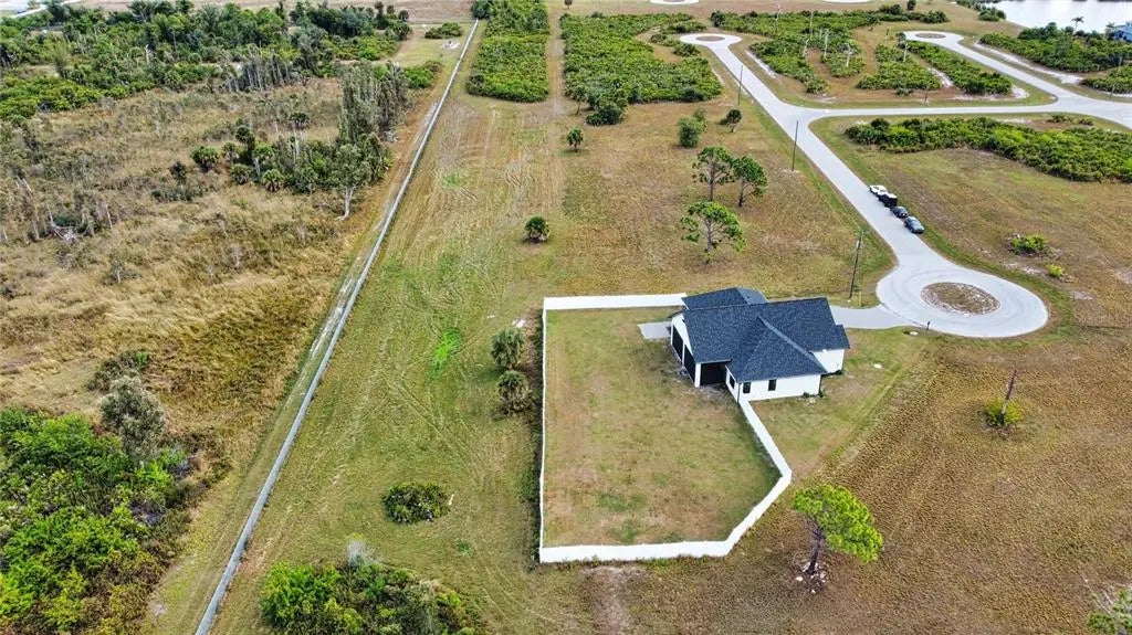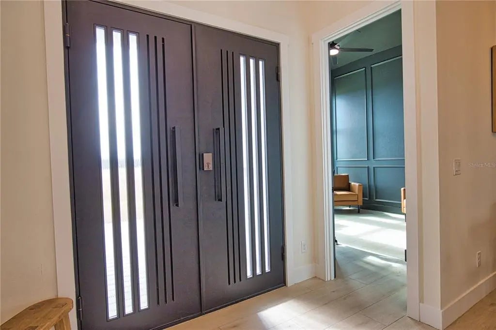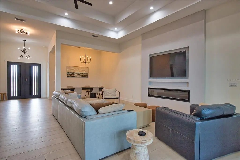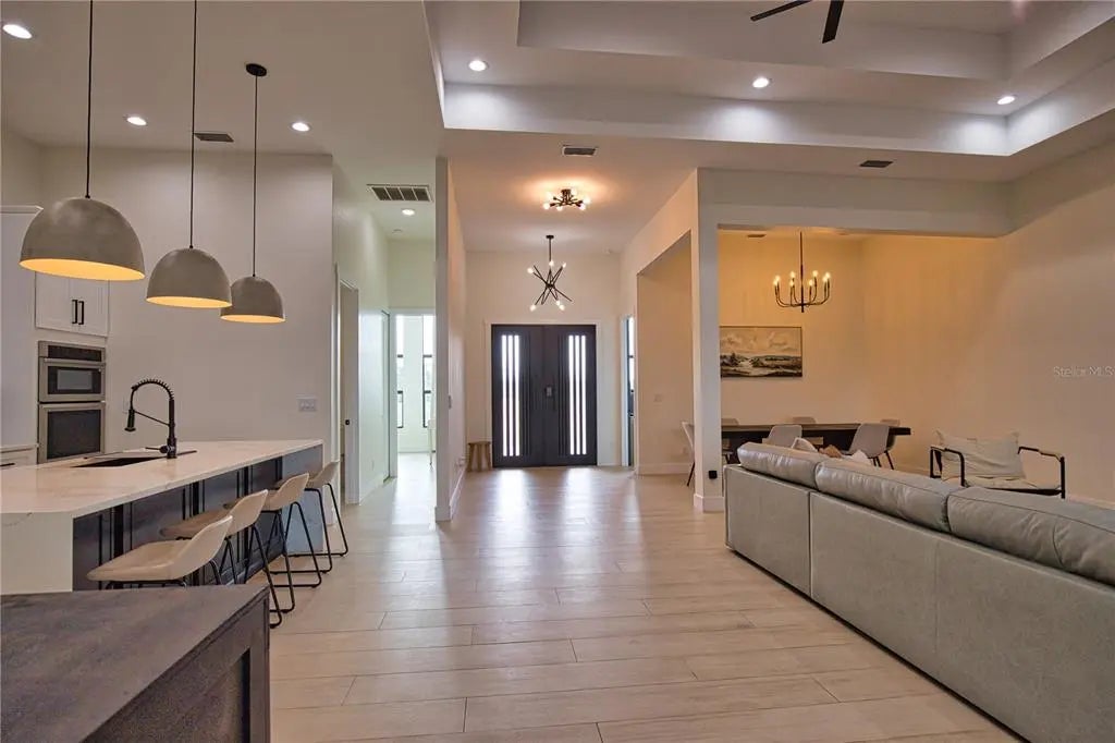 Step into refined modern luxury in this stunning, 3 bedroom, 2 bathroom custom, one-year-young home designed to impress at every turn. The expansive great room creates a breathtaking focal point, enhanced by soaring tray ceilings and an abundance of natural light. High-end finishes are showcased throughout, reflecting exceptional craftsmanship and attention to detail with one of the bedrooms thoughtfully transformed into a private office, complete with custom built-in bookshelves and a cleverly hidden closet, ideal for today’s work-from-home lifestyle while maintaining flexibility for future needs. The chef’s kitchen is truly perfect for entertaining, featuring a striking center island with waterfall quartz countertop, sleek, soft close cabinetry, and premium finishes that blend beauty with functionality. 8-foot doors, oversized windows and a dramatic 12-foot sliding glass door seamlessly connect indoor and outdoor living, ideal for gatherings or quiet evenings at home. Perfectly positioned on a quiet cul-de-sac, this home sits on an impressive .45-acre lot that backs up to and borders HOA-designated conservation land, offering privacy and serene natural views. The property is beautifully fenced, providing both elegance and peace of mind. This exceptional residence blends modern sophistication with a tranquil setting, delivering luxury, space, and privacy in a home that truly stands apart.