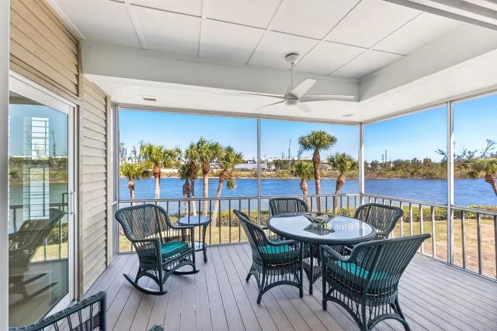 Newly renovated with luxury wide plank hardwood floors throughout, impact windows and doors throughout, composite decking and fresh interior paint. The paver driveway into the gated community of Seawatch is framed by majestic Ficus trees that introduces a charming lakefront spacious 3 bedroom, 3 and one-half bath Villa graced by Lake Gasparilla. The solarium entry with a circular staircase comes complete with an open floor living/dining area, wood cathedral ceilings, and a screened lanai with excellent lake views. The kitchen showcases wood cabinets, wainscot backsplash and plenty of counter space. Other features include plantation shutters throughout, turret style guest bedroom with beadboard vaulted ceiling, one car garage, and ample storage. The spacious master suite offers a vaulted ceiling, and open balcony with easterly lake views. Seawatch is a waterfront gated community of 49 residence surrounded by mature landscaping, 4 beach accesses, 2 tennis courts and 2 pools and located between Lake Gasparilla and the Gulf of Mexico.