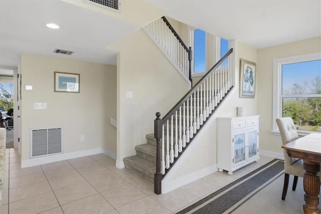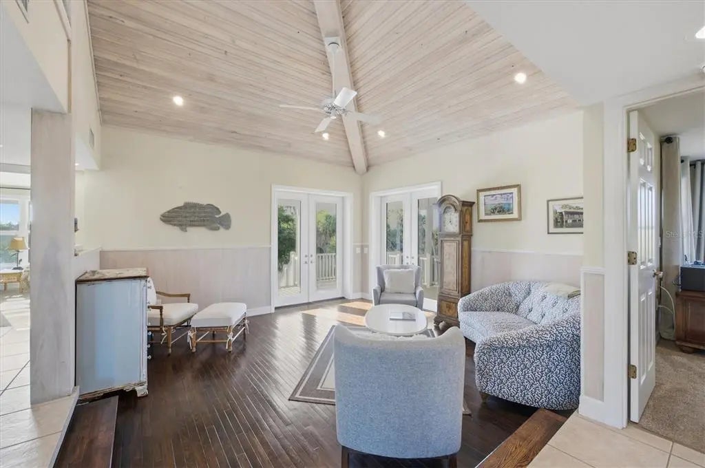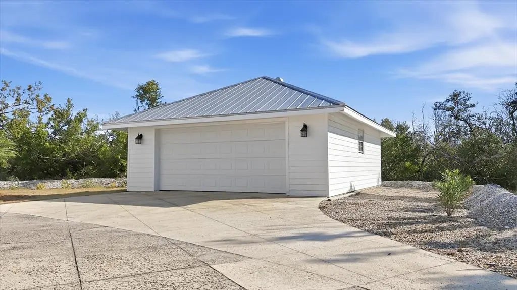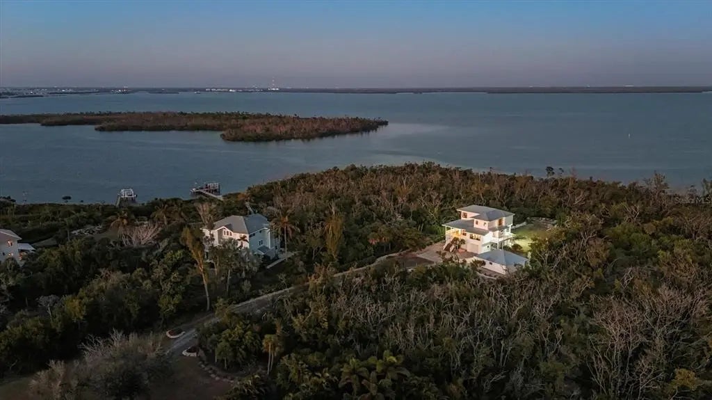 Tucked away on a quiet cul-de-sac and set well back on a private shelled driveway, this elevated two-story residence offers a rare blend of acreage, privacy, and timeless Florida craftsmanship. The home’s welcoming entry is framed by two stately columns, creating an elegant sense of arrival. Situated on 1.7 acres private estate the property enjoys tranquil water views through the mangroves with partial views of Gasparilla Sound, offering a serene Old Florida setting. The location also provides close proximity to the Boca Grande Club, combining privacy with convenient access to island amenities. Built in 1986 by respected builder Dick Yusk, this four-bedroom, two-and-a-half-bath single-family home features a thoughtfully designed floor plan, including two primary bedrooms, ideal for multigenerational living or hosting guests. The great room is a standout, showcasing vaulted ceilings, tongue-and-groove oak hardwood flooring, beadboard detailing, and chair rail accents that create warmth and architectural character. Bedrooms are comfortably carpeted, while the bathrooms are finished with tile. The open kitchen is dramatic and light-filled, highlighted by a vaulted ceiling with atrium windows, tile flooring, and a breakfast bar that opens to the dining area—perfect for everyday living and entertaining. A versatile den provides additional flexibility and may be used as a home office, library, or sitting room. The outdoor setting embraces the property’s natural surroundings with mature landscaping, an irrigation system, and a peaceful, private atmosphere that complements the creekside location. An outdoor shower adds coastal practicality, while the expansive grounds offer ample opportunity to enjoy the outdoors or further customize the property to suit your lifestyle. The home is constructed with a HardiPlank Cement Siding, topped with a metal roof, and equipped with 175mph rated PGT hurricane windows for durability and peace of mind. Additional features include zoned 2.5-ton central air conditioning, an indoor laundry room, French door entry, and an inviting front porch. Completing the property is an oversized 24’ x 28’ detached two-car garage with workshop, ideal for storage, hobbies, or recreational equipment. The home is serviced by a private pre-treatment effluent pump. Public water and sewer is onsite. Furnishings are negotiable, offering a potential turnkey opportunity. This is a rare offering for those seeking privacy, acreage, and waterfront tranquility—where classic Florida architecture, natural beauty, and thoughtful design come together in a peaceful and sought-after setting.