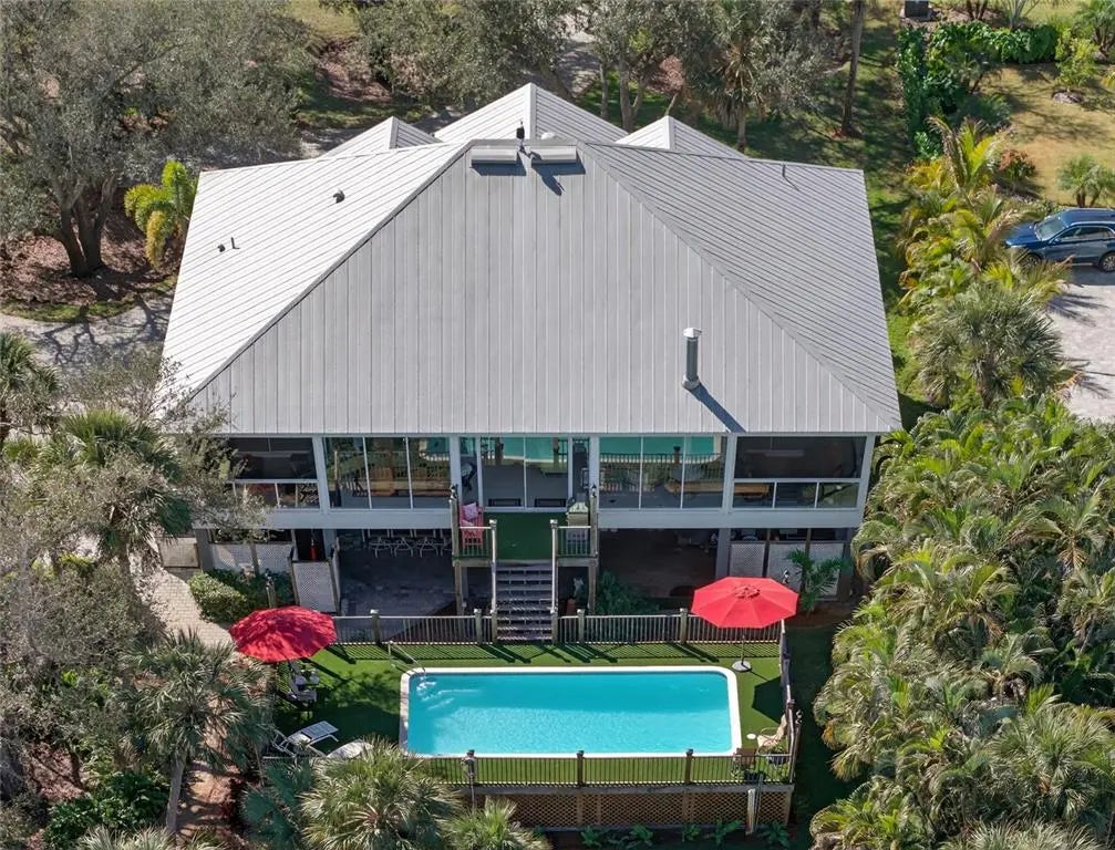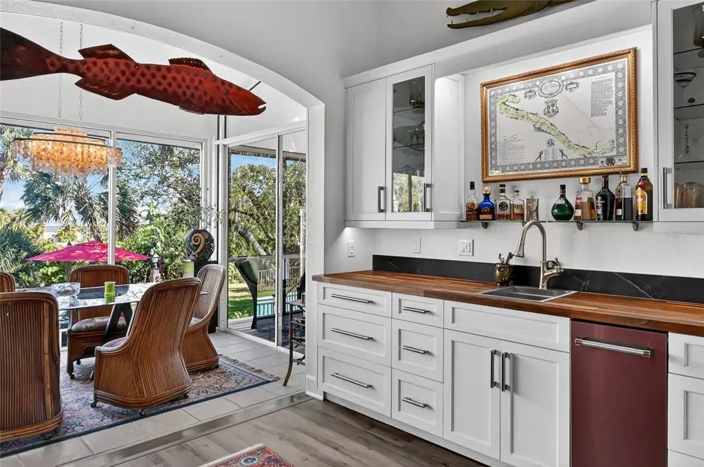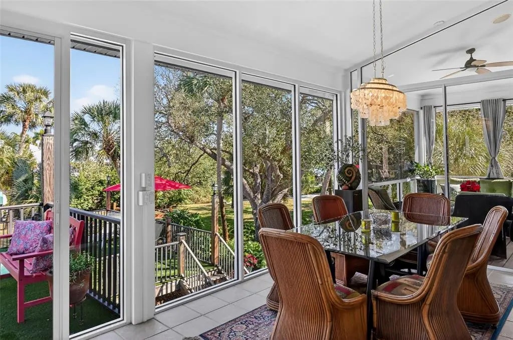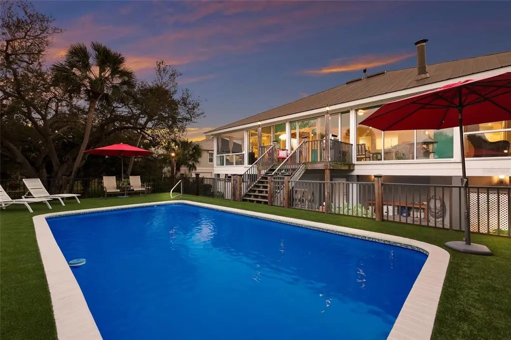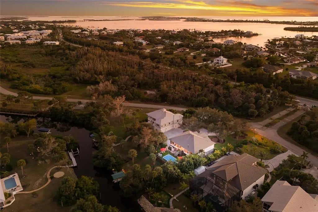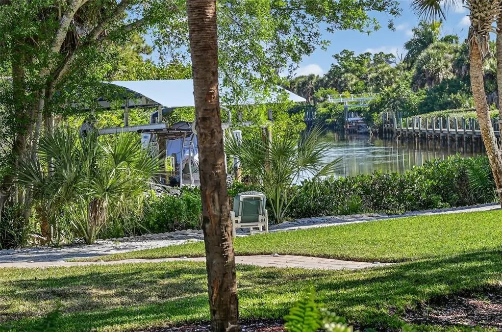 Luxury custom waterfront home in the secluded gated community of Coral Cove. A true tropical oasis, the property is situated on a large .62-acre lot with thoughtful landscape design that includes enchanting oak trees, mature palms, and refined gardens. This updated 3 bedroom, 2.5 bath, plus an office/den offers luxurious enhanced interior, boat dock and lift, stunning swimming pool, elevator, and incredible outdoor living space. The property has a sensational open floorplan with an impressive great room, magnificent gourmet kitchen, and expansive Florida Room with floor to ceiling glass that brings the gorgeous backyard scenery into the home. The great room offers towering 14' tall vaulted ceilings and built-in niches. The grand Florida room offers a vintage Malm brand gas fireplace and 2 additional screened-in side porches. The primary suite includes a sizable bedroom, built-in cabinetry, large renovated bath and walk-in closets. There's a large pantry room where the elevator is positioned to service the garage below. A generous office/den offers superb built-in cabinetry and desks. The stunning elevated pool deck area offers serene privacy and is perfect for lounging and swimming while enjoying views of the creek and tropical surroundings. Premium coastal construction quality includes Metal roof, impact resistant windows and sliders, plus automatic roll down storm shutters. Private boat dock and lift along Amberjack Creek offers access to Charlotte Harbor and the Gulf. Enjoy world-class fishing and boating excursions to countless fun destinations. A massive lower-level totaling 2,300 sq.ft. that includes a 2+ car garage, room for a golf cart, air-conditioned workshop and large storage area. The home and neighborhood offer an outstanding location with proximity to State Parks, marinas, private and public golf clubs, historic Boca Grande, excellent restaurants, miles of pristine sandy beaches, and just walking distance to essential shopping.