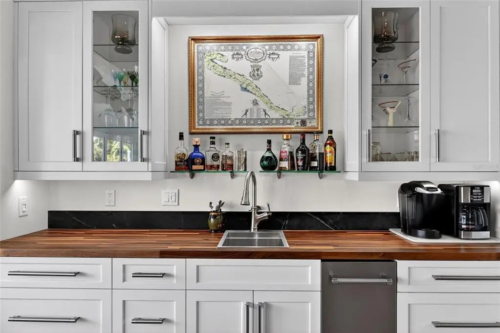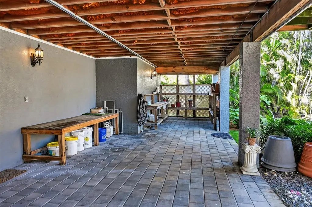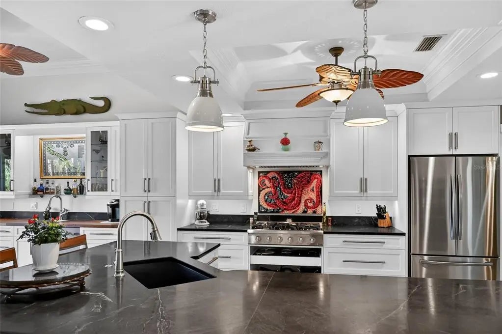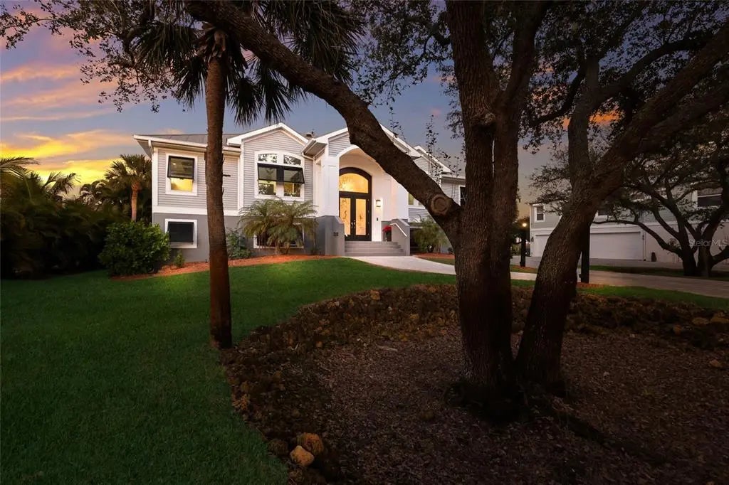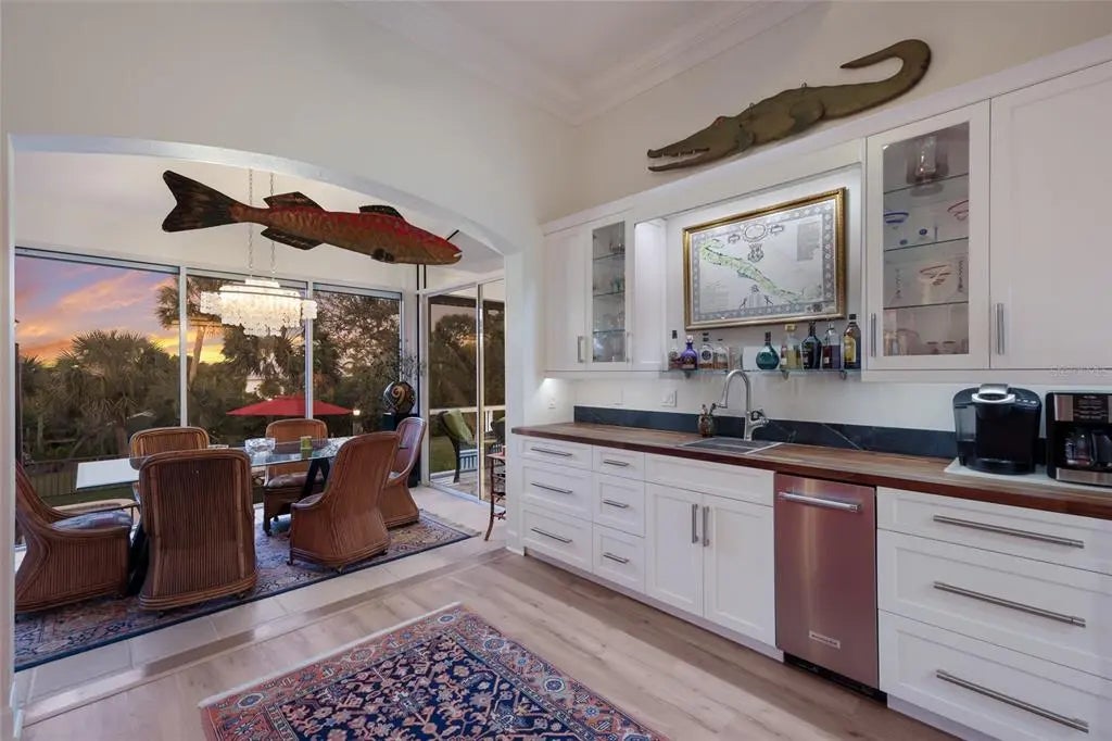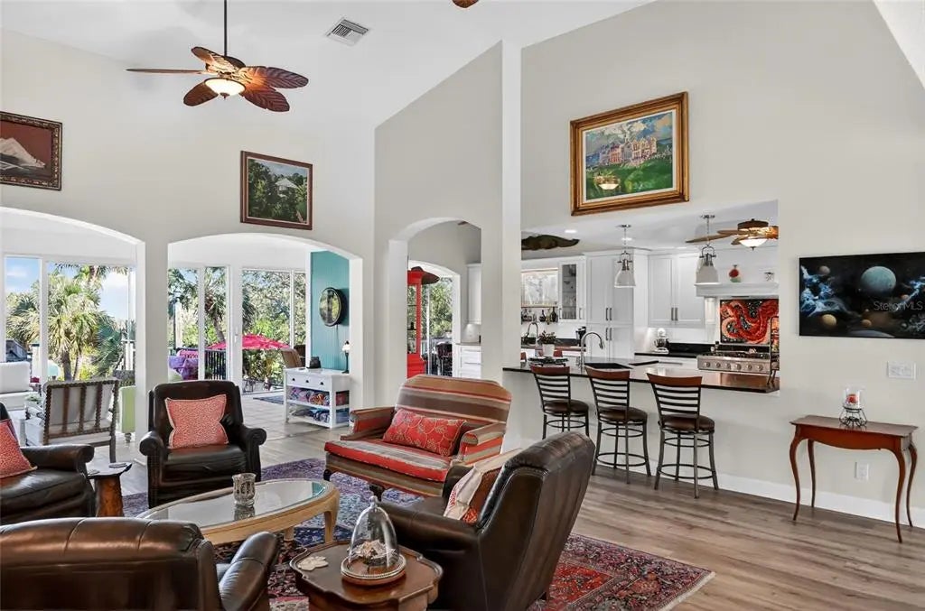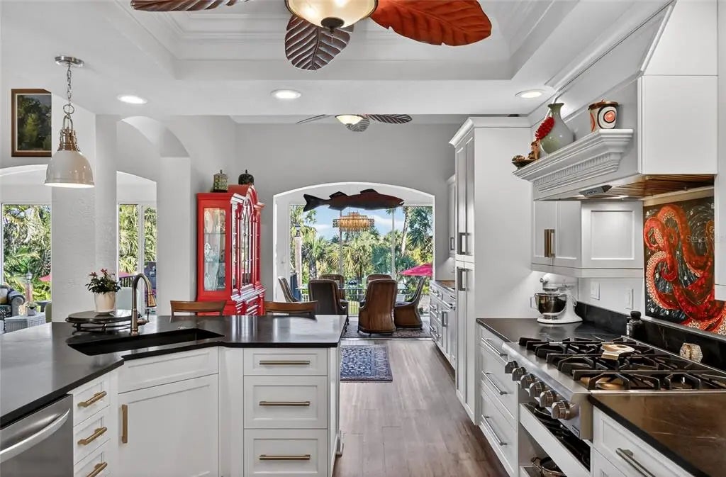 Luxury custom waterfront home in the secluded gated community of Coral Cove. A true tropical oasis, the property is situated on a large .62-acre lot with thoughtful landscape design that includes enchanting oak trees, mature palms, and refined gardens. This updated 3 bedroom, 2.5 bath, plus an office/den offers luxurious enhanced interior, boat dock and lift, stunning swimming pool, elevator, and incredible outdoor living space. The property has a sensational open floorplan with an impressive great room, magnificent gourmet kitchen, and expansive Florida Room with floor to ceiling glass that brings the gorgeous backyard scenery into the home. The great room offers towering 14' tall vaulted ceilings and built-in niches. The grand Florida room offers a vintage Malm brand gas fireplace and 2 additional screened-in side porches. The primary suite includes a sizable bedroom, built-in cabinetry, large renovated bath and walk-in closets. There's a large pantry room where the elevator is positioned to service the garage below. A generous office/den offers superb built-in cabinetry and desks. The stunning elevated pool deck area offers serene privacy and is perfect for lounging and swimming while enjoying views of the creek and tropical surroundings. Premium coastal construction quality includes Metal roof, impact resistant windows and sliders, plus automatic roll down storm shutters. Private boat dock and lift along Amberjack Creek offers access to Charlotte Harbor and the Gulf. Enjoy world-class fishing and boating excursions to countless fun destinations. A massive lower-level totaling 2,300 sq.ft. that includes a 2+ car garage, room for a golf cart, air-conditioned workshop and large storage area. The home and neighborhood offer an outstanding location with proximity to State Parks, marinas, private and public golf clubs, historic Boca Grande, excellent restaurants, miles of pristine sandy beaches, and just walking distance to essential shopping.