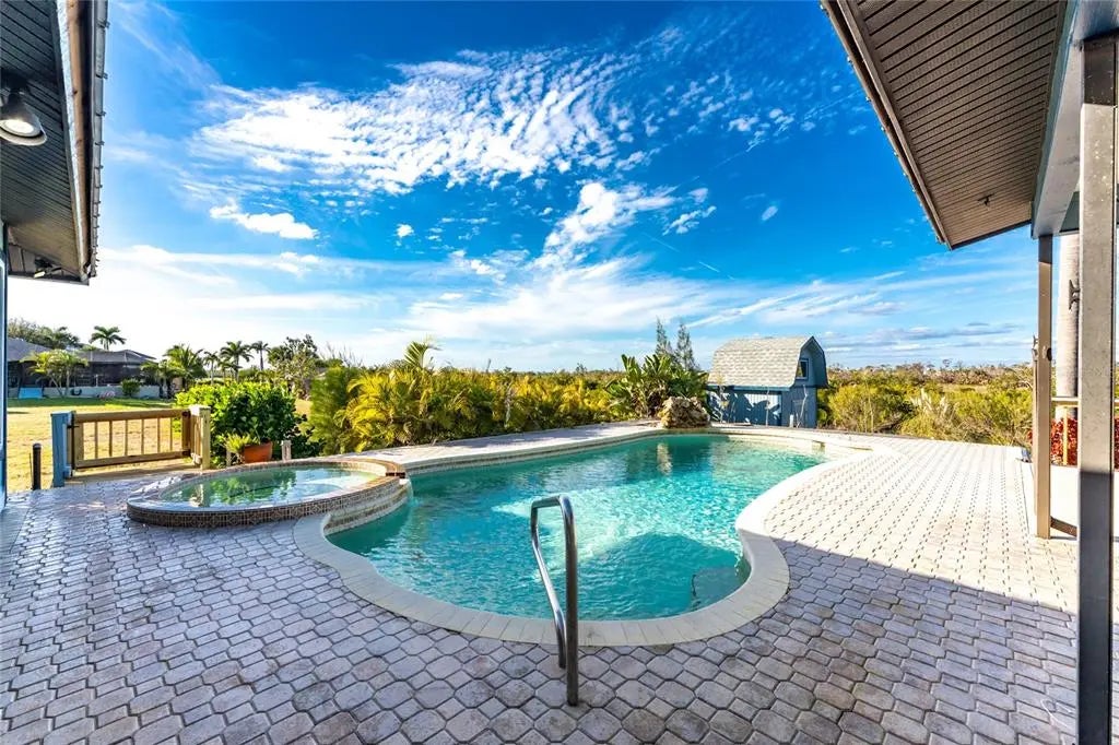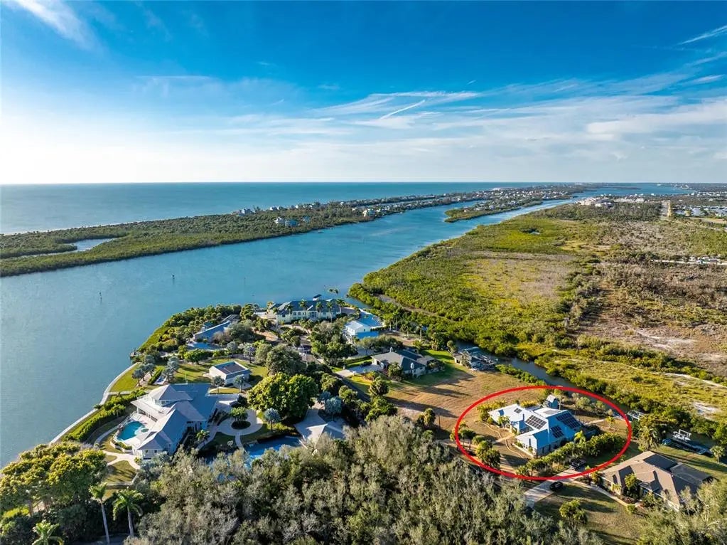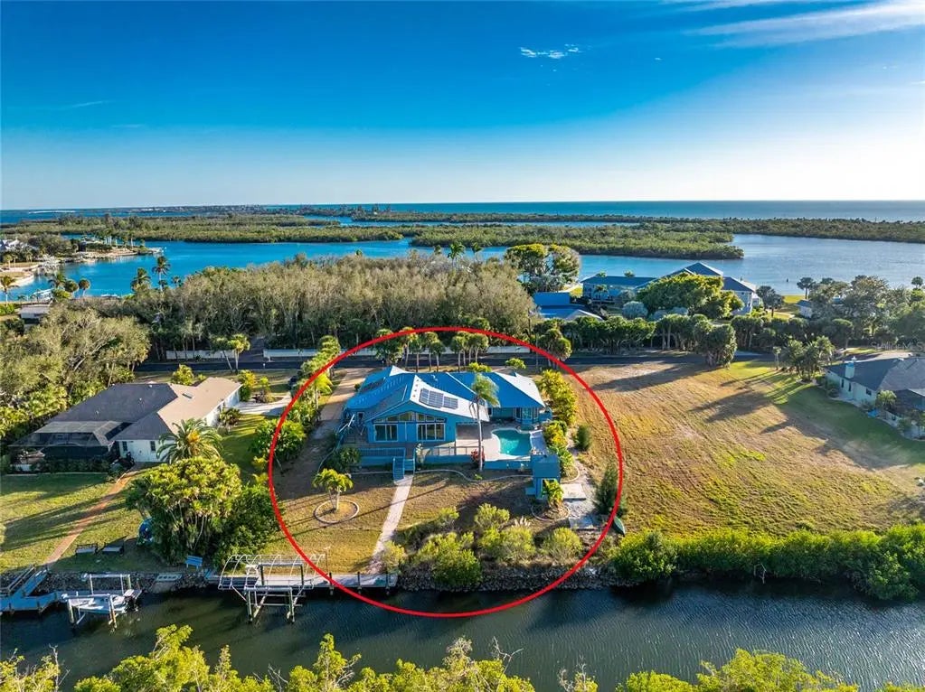 Don’t let this opportunity pass you by. Welcome to a rare waterfront, no-bridges-to-the-Bay home backing directly onto Don Pedro Land Base State Park. This stunning 4-bedroom, 3-bath, 2-car garage pool home delivers the ultimate Florida lifestyle. Offering over 3,500 square feet of living space, the spacious open floor plan provides room for everyone and is designed to seamlessly blend indoor and outdoor living. Multiple IMPACT RESISTANT sliding glass doors open to expansive outdoor areas, creating the perfect setting for entertaining or simply enjoying the surrounding natural beauty. The updated kitchen features granite countertops, pendant lighting, a double wall oven, Sub-Zero refrigerator, breakfast bar, and a cozy breakfast nook. Just off the kitchen, enjoy a dry bar with a 100+-bottle wine cooler, ideal for hosting guests. The primary suite is a true retreat, featuring two sets of sliders leading to the lanai, a large walk-in closet, and a double-sided decorative fireplace for added ambiance. The luxurious primary bath includes an updated vanity w/solid surface countertop and double basins, updated walk-in shower, Privacy commode and a Jacuzzi tub. Bedrooms two and three share a Jack and Jill Guest Bath #2 (with vanity w/double basins and private toilet/combo tub/shower area) on the opposite side of the home, while the fourth bedroom, located adjacent to the primary suite, makes an excellent office or den. Guest Bath #3 also serves as the pool bath and features a new vanity w/solid surface countertop, new mirror, linen closet and combo tub/shower. SOLAR PHOTOVOLTAIC SYSTEM has provided the current owner with EXTREMELY LOW ELECTRIC BILLS all year round! This is an OWNED OUTRIGHT SYSTEM! Additional features include travertine flooring throughout, all IMPACT DOORS AND WINDOWS for your peace of mind and a big insurance credit, metal roof new in 2020, and three-zone central heating and air for energy efficiency,(two of them were new in 2021) plus two mini splits (new in 2020) in Guest bedrooms 2 & 3. Outdoors, the pool and spa provide the perfect place to relax, cool off, or exercise, while the expansive deck is ideal for enjoying Florida’s sunshine. A pathway leads to a private dock with a 6,000-pound boat lift, offering immediate access to miles of incredible waterways. Privacy and tranquility are assured with protected state park wetlands directly behind the home. Enjoy daily wildlife sightings including eagles, ospreys, water birds, otters, and manatees. A private beach is also available with association membership. If you love nature, boating, and waterfront living, this truly one-of-a-kind offering is ready to be called home. Call today to schedule your private showing.