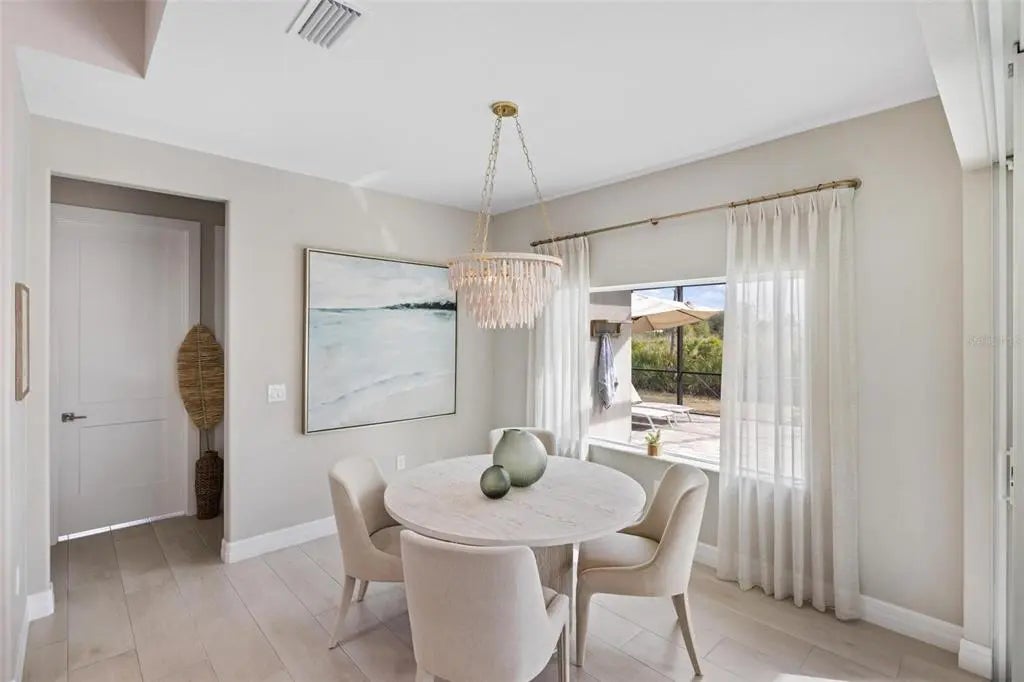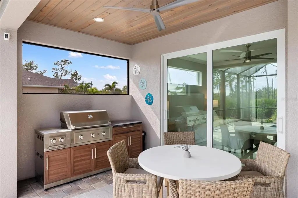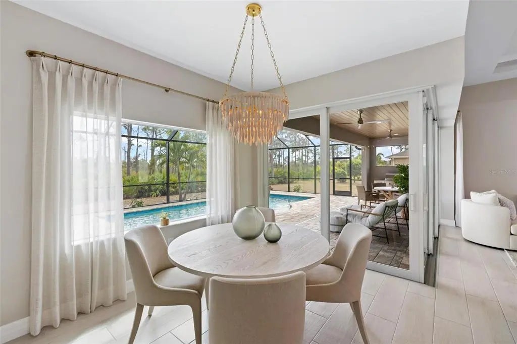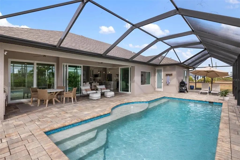 Elegance abounds in this stunning 2020-built home in Rotonda Sands, perfectly situated on a double lot in an X flood zone. This beautifully designed 3-bedroom + den, 2-bath, 3-car garage home features a heated saltwater pool and exceptional curb appeal with a paver driveway, tropical landscaping, a 2023 multidimensional roof, and impact-resistant double entry doors. Inside, soaring ceilings, tile flooring throughout, and corner pocketing sliding glass doors create a bright, open layout with stunning pool views. The modern kitchen offers white shaker cabinetry with glass accents, granite countertops, center island, glass tile backsplash, walk-in pantry, built-in beverage refrigerator, and an aquarium window in the dining area. The spacious primary suite includes lanai access, crown molding, walk-in closets, and a spa-like bath with dual granite vanities and a large walk-in tiled shower. Two guest bedrooms—one with pool access—share a full bath that also serves as a pool bath. A versatile den/office adds flexible living space. Enjoy Florida living on the oversized paver lanai with a 2023 extended pool cage, cypress wood ceiling, ceiling fans, recessed lighting, and an oversized heated saltwater pool with sun shelf. Additional upgrades include Icynene spray foam insulation, reverse osmosis system, landscape irrigation and lighting, Ring security system, epoxy garage floors, workshop space, and smart garage door openers. Conveniently located near beaches, golf, shopping, dining, parks, and boating. Schedule your private showing today. Car parked in the garage does NOT convey with the home!