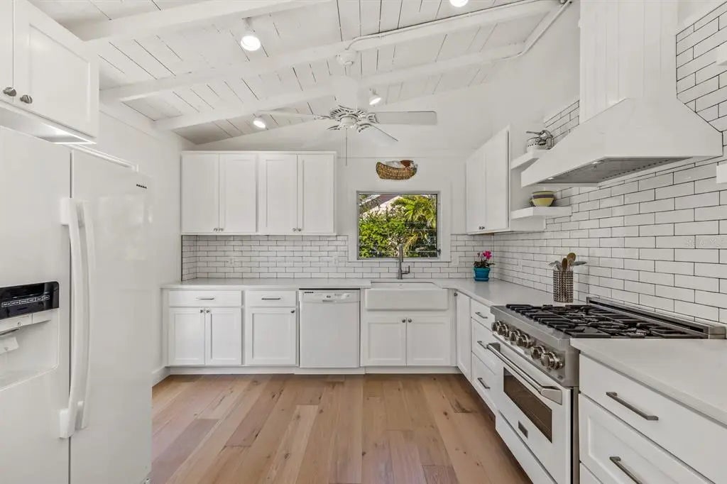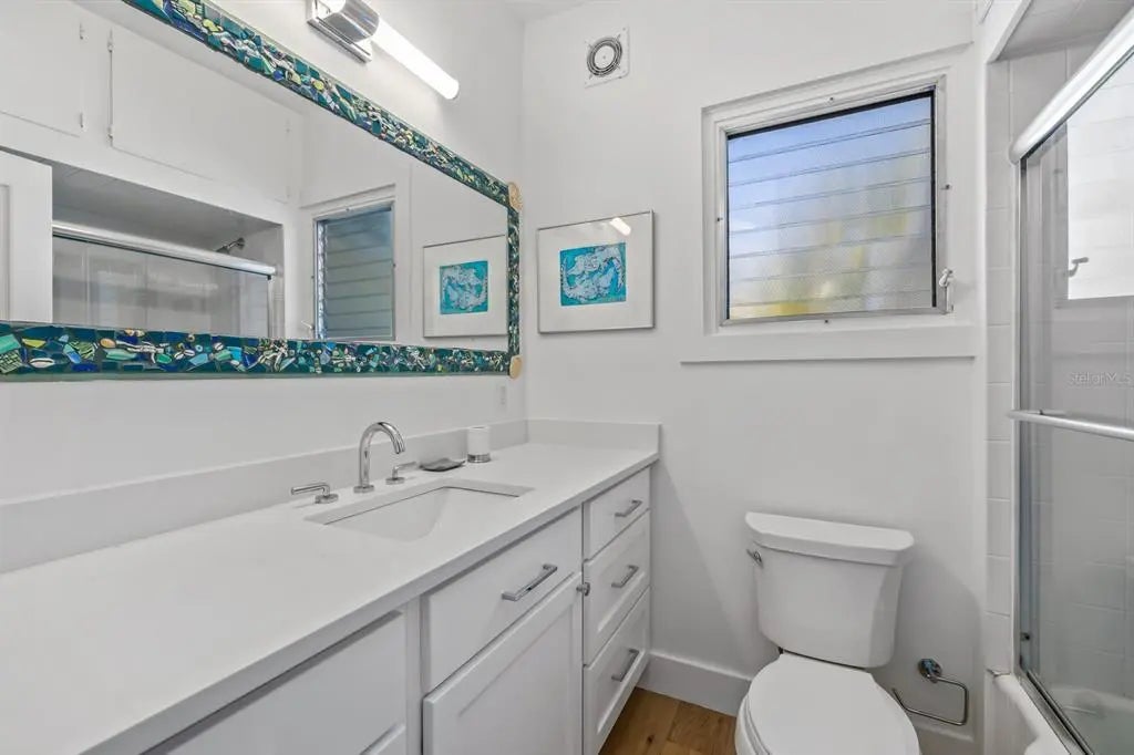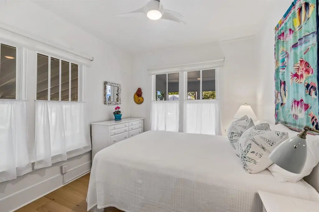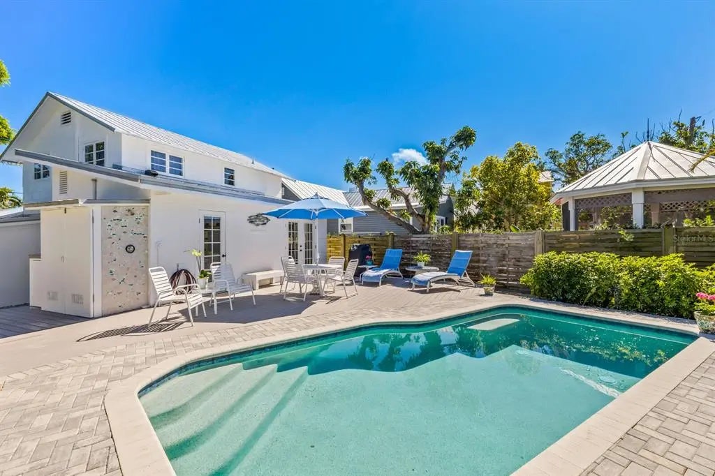 Experience the charm of Old Florida living in the heart of the historic village of Boca Grande. This enchanting four bedroom, two full bath cottage offers 1,284 Sq. Ft. of thoughtfully designed living space and features a private heated pool, making it a true village gem. Ideally located on one of the most desirable streets in the historic district, the home sits just one and a half blocks from the iconic Gasparilla Inn. With an impressive rental history, this artsy cottage blends timeless character with tasteful modern updates, perfect as a full time residence, vacation retreat, or investment property. From the moment you arrive, you’re welcomed by artistic touches created by local artisans, beginning with the colorful tiled entry that leads into a light filled enclosed sun porch, an inviting space to enjoy morning coffee while watching the sunrise. The sun porch flows seamlessly into the bright living area, featuring new engineered hardwood flooring that continues throughout the home. The updated kitchen is both stylish and functional, offering generous counter space and storage, stone countertops, solid wood cabinetry, a Zline gas range, and classic subway tile backsplash. Two separate access points from the kitchen open to the patio, creating effortless indoor outdoor living ideal for entertaining. The primary bedroom, conveniently located on the main level, sits just off the living area and is complemented by a full bath with solid stone countertops. Upstairs, three guest bedrooms are thoughtfully grouped together and share a full bathroom, providing comfort and privacy for family and guests. Outdoor living shines with new Hardie Plank siding, an enclosed outdoor shower, private pool, fenced yard, and mature landscaping that enhances privacy and the tranquil island atmosphere. Whether you’re searching for your dream Boca Grande cottage or a proven investment opportunity, this exceptional home delivers the perfect balance of location, charm, and modern coastal living.