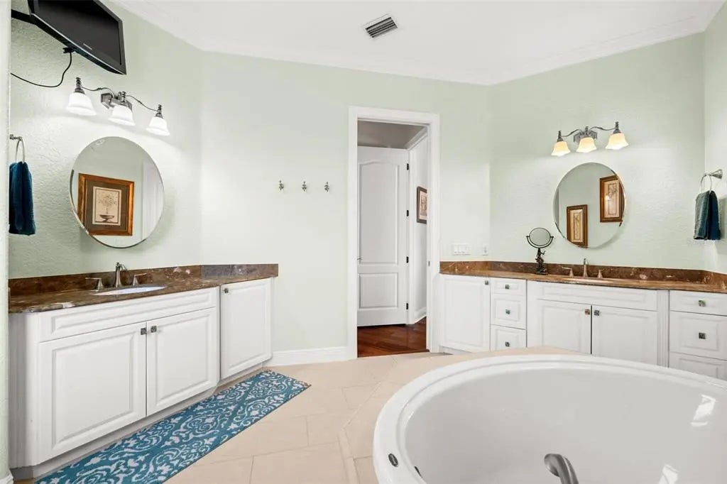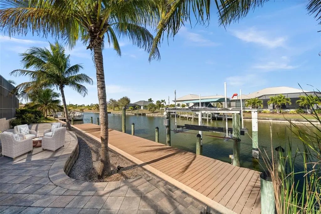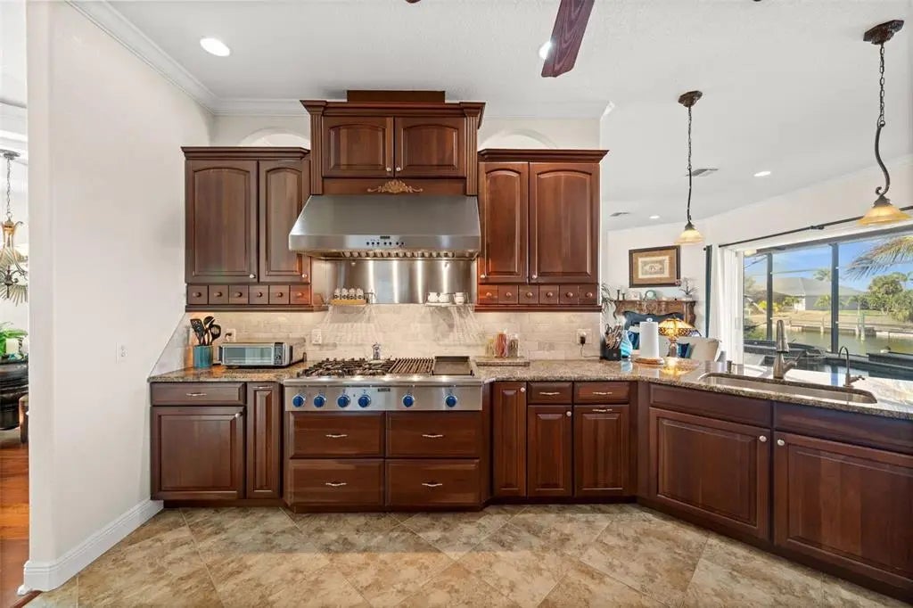 Exceptional custom-built waterfront estate with 3,351 sq ft on SAILBOAT water offering 84 feet of CONCRETE SEAWALL, QUICK direct Gulf access, and NO FIXED BRIDGES. Boater’s dream with a 70’ x 8’ composite dock and 10,000-lb boat lift for quick access to open water. This meticulously maintained home features coffered tray and volume ceilings, Brazilian cherry hardwood flooring, gorgeous tile, crown molding, plantation shutters, SPRAY FOAM INSULATION, IMPACT WINDOWS, SLIDERS, AND FRENCH DOORS(excluding aquarium glass), plus two separate A/C systems. Chef’s kitchen includes THERMADOR STAINLESS STEEL APPLIANCES with GAS COOKTOP, grill, griddle, built-in convection oven, warming drawer, microwave, commercial-grade hood with heat lamps, and custom wood cabinetry with wine/glass storage and spice pull-outs. Spacious layout offers a study with a built-in desk, a luxurious primary suite with dual custom walk-in closets, dual vanities, a soaking tub, and an oversized walk-in shower with dual shower heads, guest bedrooms with walk-in closets and custom built-ins, plus an upstairs bonus/media room with a beverage center and a full bath. Outdoor living includes SALTWATER HEATED POOL AND SPA with two waterfalls, paver lanai and walkways, REAR PAVER WATERFRONT PATIO, pool bath, outdoor shower, and storage closet. Additional features include a tile roof, an irrigation well, built-in pest control, a water softener, a reverse osmosis system at the kitchen sink, mature landscaping, and a 100-gallon propane tank. Current homeowner’s insurance is $2,753 annually, and flood insurance is $1,562 annually, transferable to the new owner.