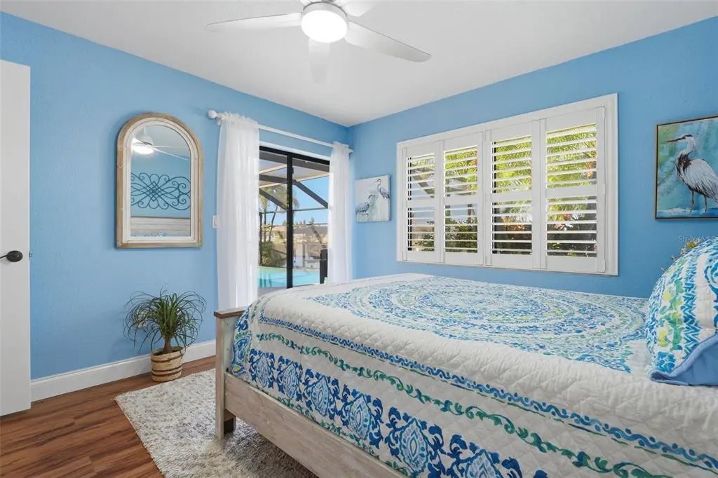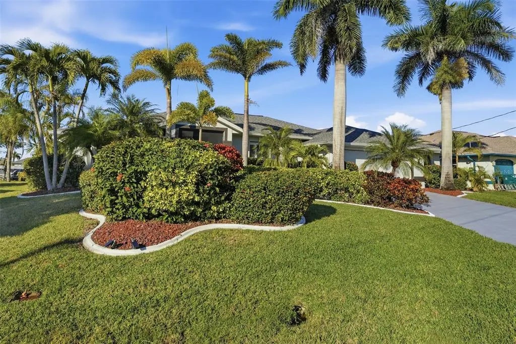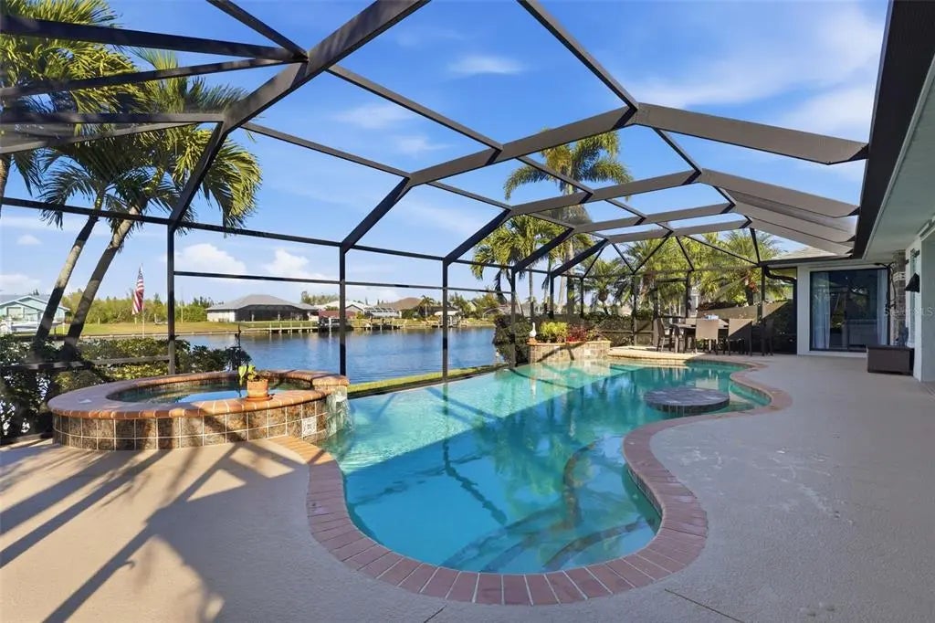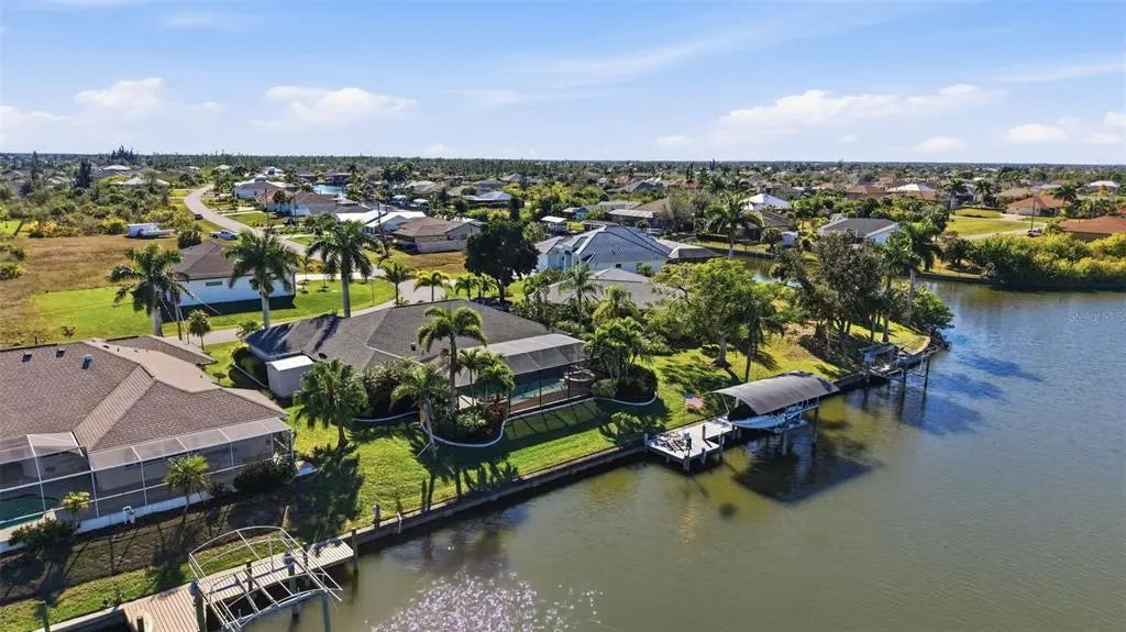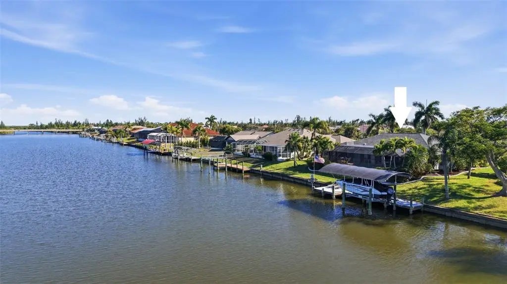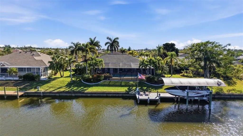 Rarely available waterfront home on one of South Gulf Cove’s widest and most active waterways, offering approximately 250 feet of breathtaking water views and 116 feet of prime waterfrontage. Boating enthusiasts will appreciate the covered dock and lift with only one bridge to open water. From the moment you step through the front door, the view is nothing short of astonishing—your eyes are drawn through the open living space to the expansive lanai, infinity-edge pool and spa, and the scenic Zephyr Waterway beyond. Designed for the Florida lifestyle, this 3-bedroom, 2-bath residence features a wet bar off the kitchen, perfect for entertaining, and an oversized garage plus a separate storage shed for added convenience. Outdoor living shines with a recently upgraded pool area, including a new salt injector (2025), pool pump (2025), pool heater (2024), and a new spa controller (2026). The lanai structure and screen were replaced in 2023, creating an ideal space to relax and enjoy lush tropical landscaping and tranquil water views. Inside, the home offers numerous recent upgrades: a beautifully refreshed kitchen with new granite countertops, refrigerator, cooktop, and dishwasher (all 2025), along with upgraded cabinetry (2022). Faux wood vinyl flooring was installed in 2022, complementing the home’s coastal feel. Additional major improvements include a new roof (2022), HVAC system (2022), and a recently rebuilt and upgraded irrigation system. This exceptional waterfront property delivers panoramic views, direct boating access, and thoughtful upgrades throughout—an ideal blend of comfort, functionality, and Florida waterfront living.