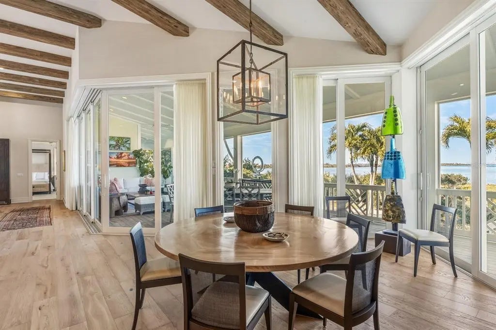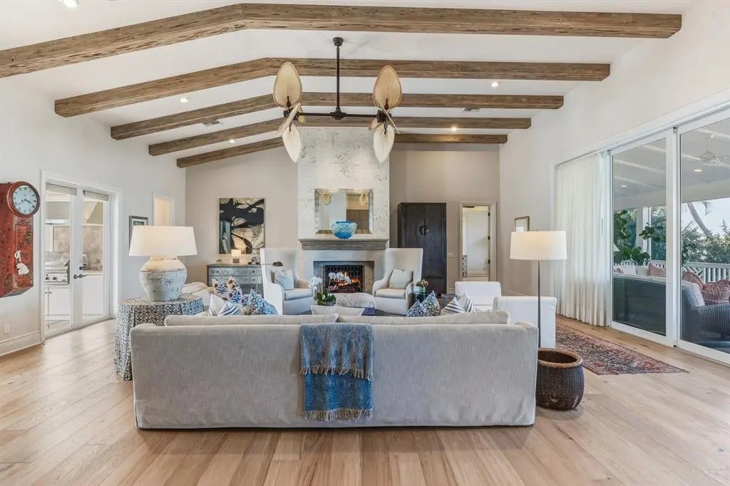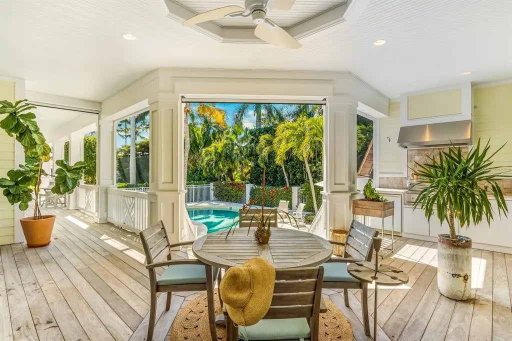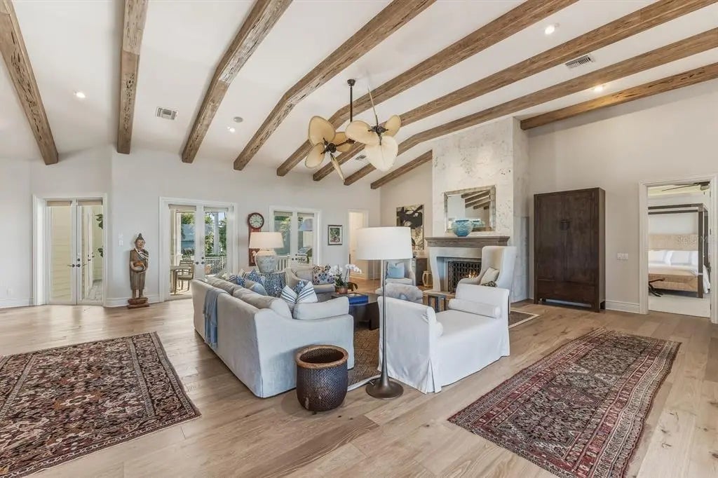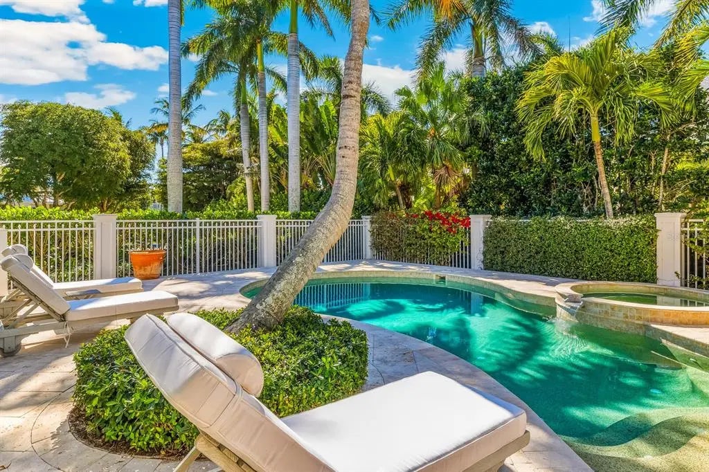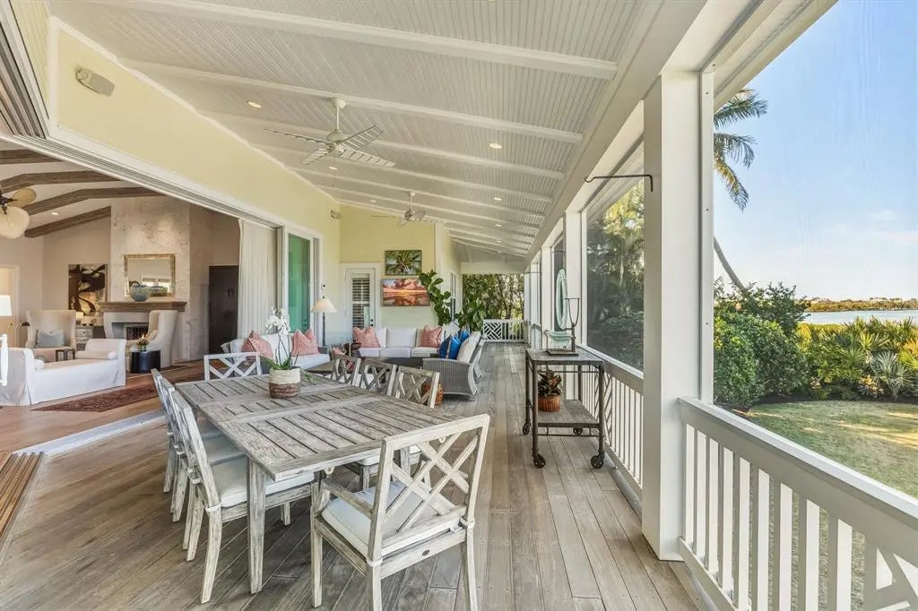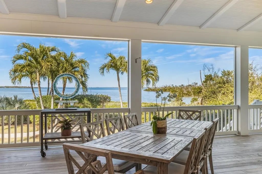 Unparalleled waterfront living awaits at 1689 Jose Gaspar Drive, ideally located on Boca Grande Isles with 122’ of private elevated frontage. This 4 bedroom, 4.5 baths with 4,500+/- square feet home offers a grande yet effortless indoor-outdoor lifestyle. A sweeping motor court with brick pavers, mature landscaping for privacy, and a double-glass mahogany door entry creates an immediate sense of arrival. The great room and adjacent dining area, bathed in natural light, is anchored by a coral accented gas fireplace, engineered white oak hardwood flooring, Pecky Cypress beams and a shiplap tray ceiling. The focal point delivers a large wall of retractable sliding glass doors accessing a substantial screened lanai presenting indoor comfort and outdoor splendor with serene views of Sunset Flats and Gasparilla Sound. The residence features a family room with a wet bar and four ensuite bedrooms meticulously designed with luxurious finishes, plantation shutters, custom millwork, ensuring guests experience unrivaled comfort. The primary suite is a sanctuary unto itself, complete with a spa-inspired ensuite bath, Jacuzzi tub, oversized shower, and unobstructed northerly water views. The kitchen is a triumph of craftsmanship, featuring honed Mont Blanc quartzite countertops, design lighting, Sub-Zero refrigerator, Thermador double oven, Monogram induction cooktop, U-Line wine refrigerator, a built-in bar with plug-ins and a substantial island anchors the open flow into the living and dining spaces. While thoughtfully designed, outdoor areas transition effortlessly to a generous custom designed pool/patio, fully equipped outdoor kitchen, ideal for alfresco dining, accessed by multiple doors and walkways. This residence has been thoughtfully curated to deliver effortless luxury, serene seclusion and an unparalleled waterfront living experience. In addition to its commanding bayfront presence, the property includes Hardy siding, standing-seam metal roof, hurricane-impact windows and sliders, controlled One-Touch lighting system, central vacuum system, a whole-home water filtration system, portage, three-car garage, waterfront dock with Ipe decking and shelled walkways surrounded by tropical landscaping.