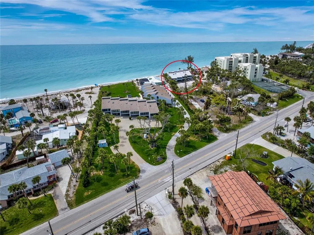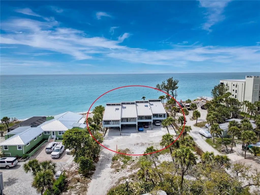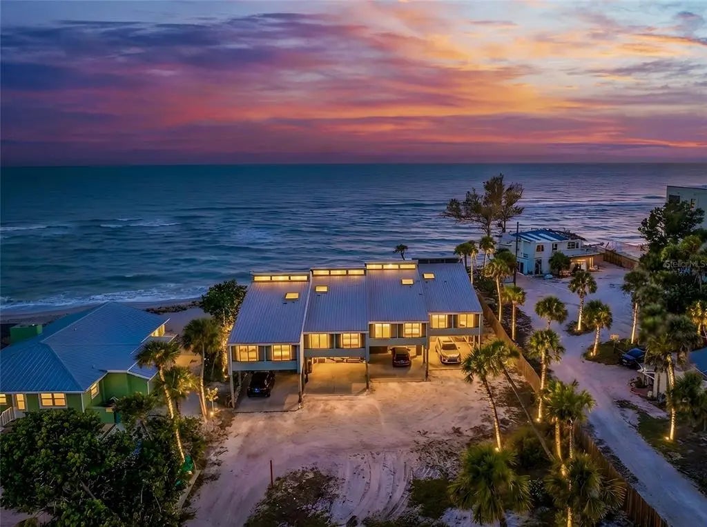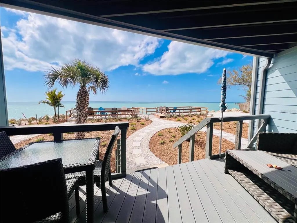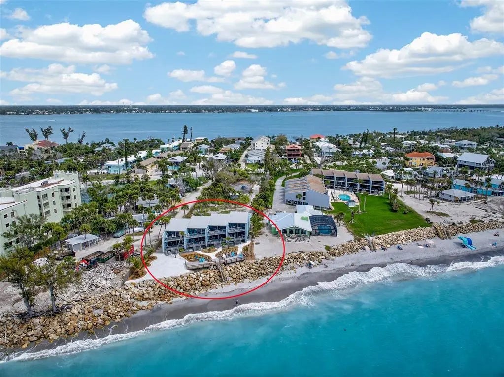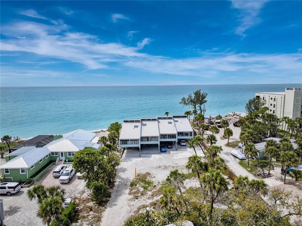 Welcome to Banyan Bluff Condominiums, a private four-residence townhome community set directly along the Gulf front of Manasota Key in Englewood, Florida. This lovely 3-bedroom, 2-bath multi-level townhome offers privacy and a tranquil atmosphere, positioned on more than an acre and comfortably set back from North Beach Road for added seclusion. The first living level is elevated on pilings approximately 16 feet above sea level, and the layout maximizes sweeping Gulf views and breathtaking sunsets from most rooms. A covered balcony off the main living area creates an inviting indoor-outdoor living space, ideal for dining outside or unwinding at day’s end. The beautifully updated kitchen includes new stainless steel appliances and quartz countertops. Upstairs, the top floor primary bedroom suite offers a vaulted ceiling, walk-in closet, an updated en-suite bathroom, and recently replaced storm-rated sliders that open to a private open balcony overlooking the Gulf. Both guest bedrooms include storm-rated windows and the guest bathroom is located just beyond the kitchen and adjoining dining area. Convenient parking includes two under-building spaces and an EV charging port. The tiled entry foyer includes an adjoining utility room with a new washer/dryer, utility sink and room for storage. The townhome is being offered turnkey furnished. Whether you choose to make it your own or place it in a rental program, this condo offers outstanding versatility. Banyan Bluff residents also enjoy a Gulf-front wooden deck, perfect for soaking up the sun or enjoying evening sunsets. Other notable updates include a metal roof in 2023, a newer electrical panel, and tankless water heater. A rare opportunity to own a stunning beachfront townhome in a quiet, exclusive setting.