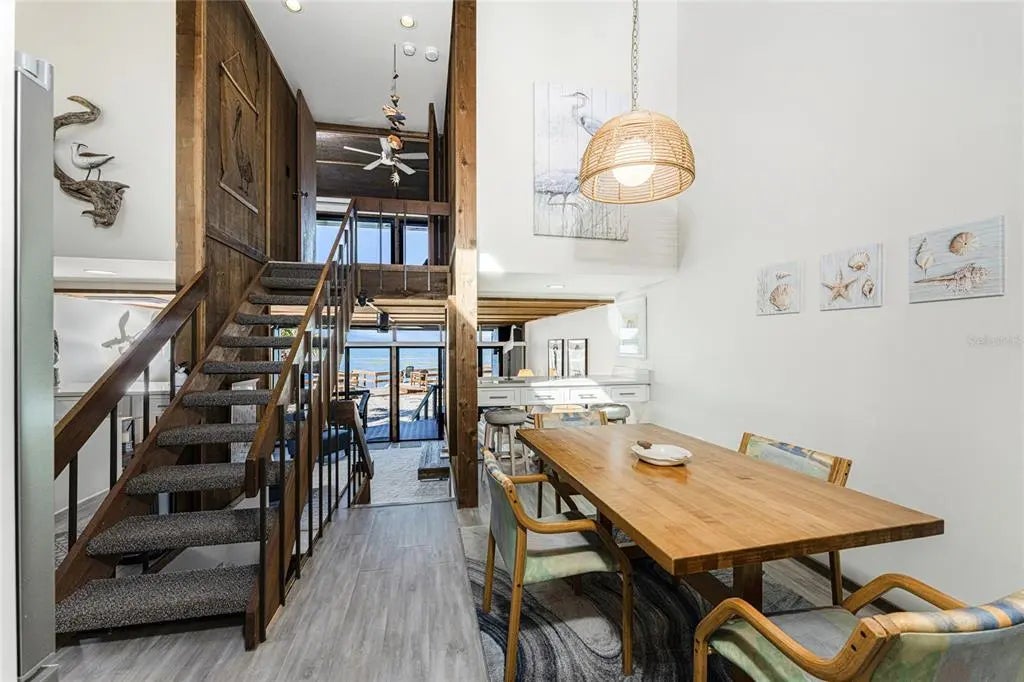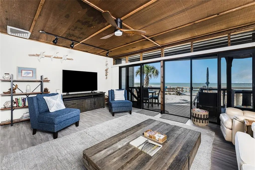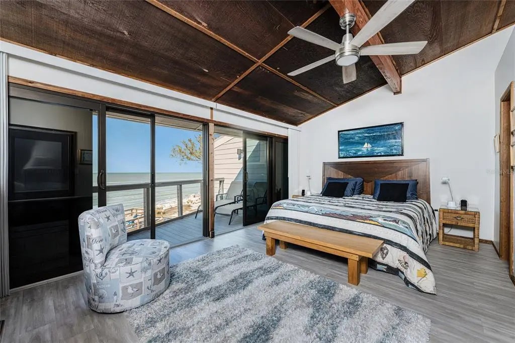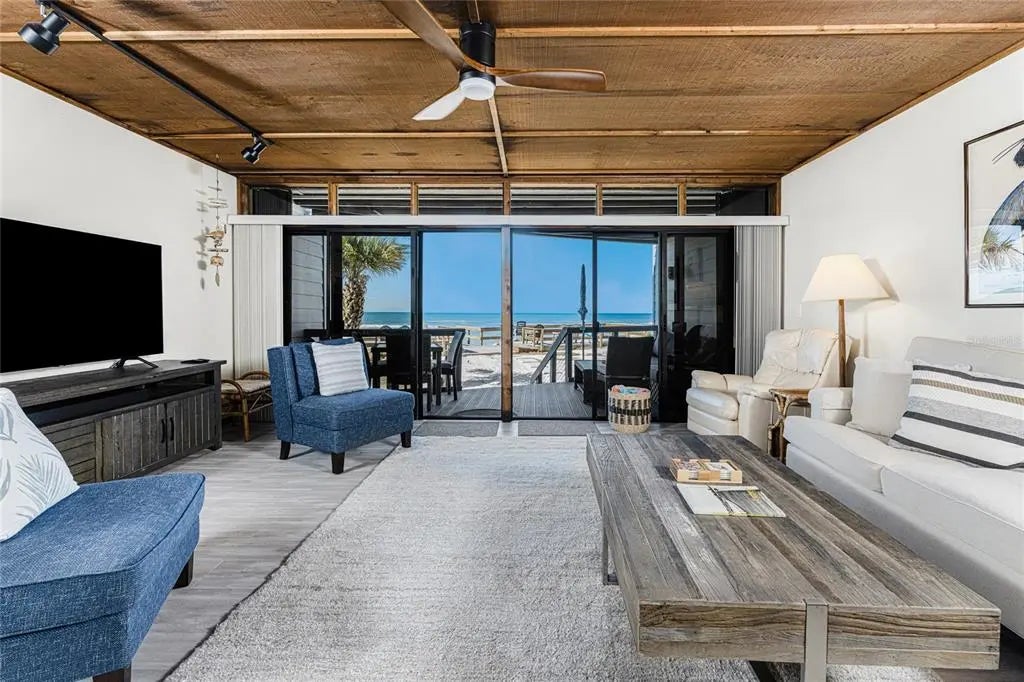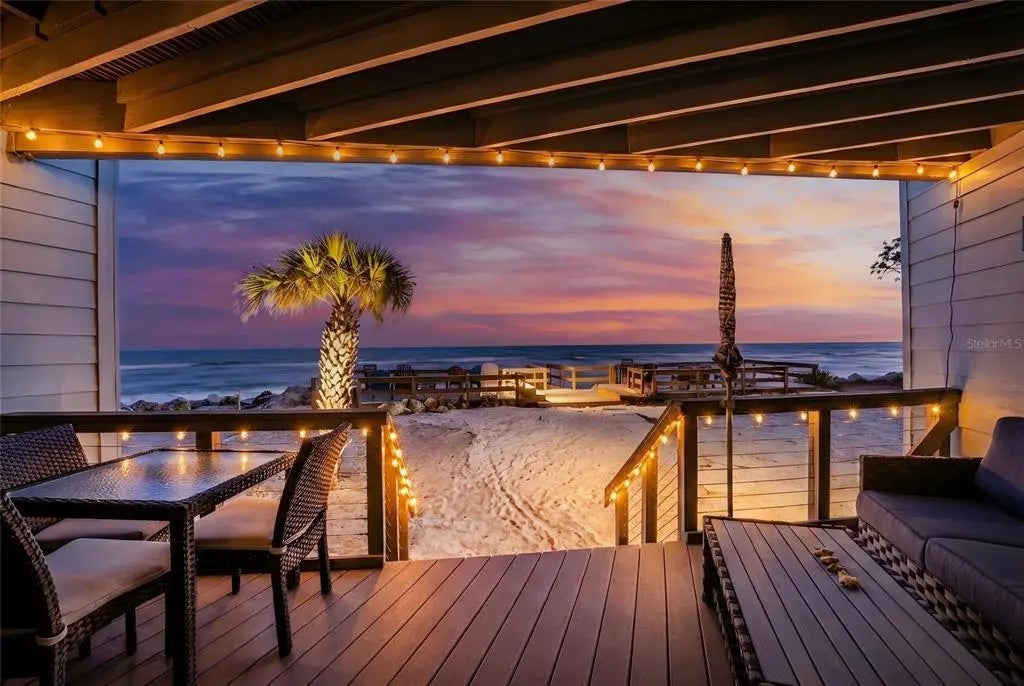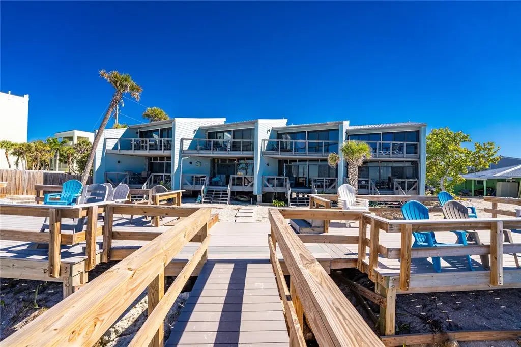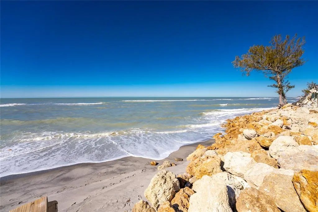 Welcome to Banyan Bluff Condominiums, a private four-residence townhome community set directly along the Gulf front of Manasota Key in Englewood, Florida. This lovely 3-bedroom, 2-bath multi-level townhome offers privacy and a tranquil atmosphere, positioned on more than an acre and comfortably set back from North Beach Road for added seclusion. The first living level is elevated on pilings approximately 16 feet above sea level, and the layout maximizes sweeping Gulf views and breathtaking sunsets from most rooms. A covered balcony off the main living area creates an inviting indoor-outdoor living space, ideal for dining outside or unwinding at day’s end. The beautifully updated kitchen includes new stainless steel appliances and quartz countertops. Upstairs, the top floor primary bedroom suite offers a vaulted ceiling, walk-in closet, an updated en-suite bathroom, and recently replaced storm-rated sliders that open to a private open balcony overlooking the Gulf. Both guest bedrooms include storm-rated windows and the guest bathroom is located just beyond the kitchen and adjoining dining area. Convenient parking includes two under-building spaces and an EV charging port. The tiled entry foyer includes an adjoining utility room with a new washer/dryer, utility sink and room for storage. The townhome is being offered turnkey furnished. Whether you choose to make it your own or place it in a rental program, this condo offers outstanding versatility. Banyan Bluff residents also enjoy a Gulf-front wooden deck, perfect for soaking up the sun or enjoying evening sunsets. Other notable updates include a metal roof in 2023, a newer electrical panel, and tankless water heater. A rare opportunity to own a stunning beachfront townhome in a quiet, exclusive setting.