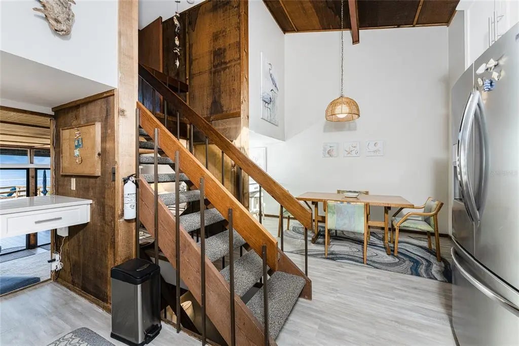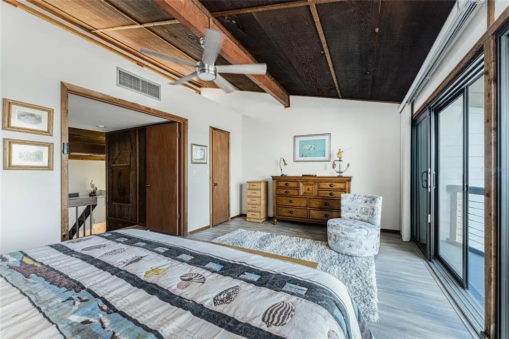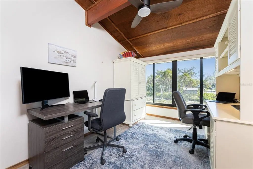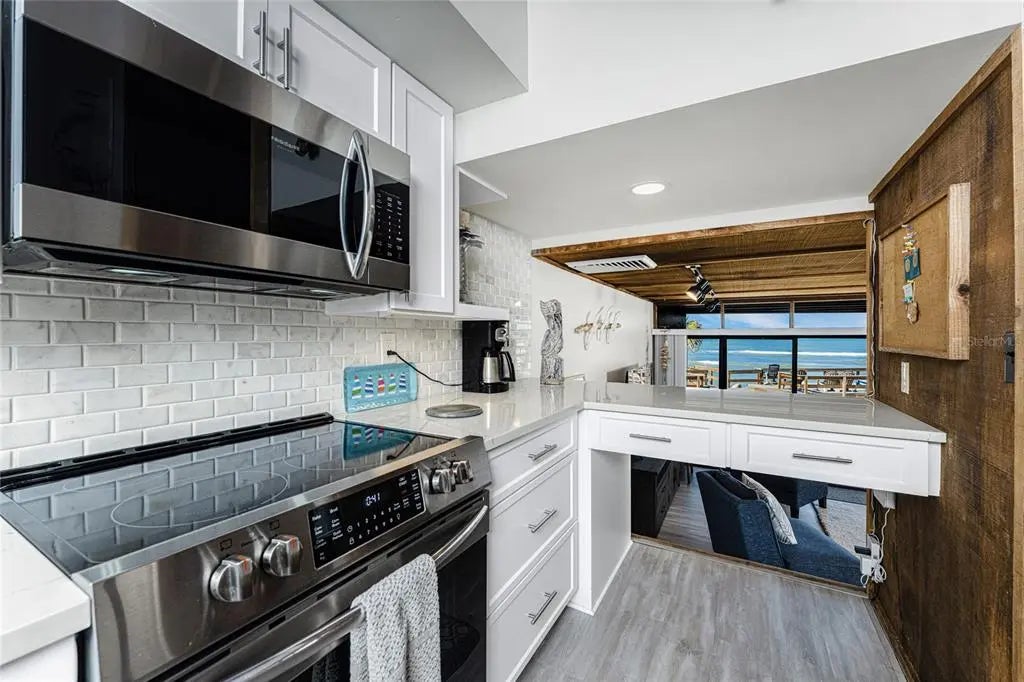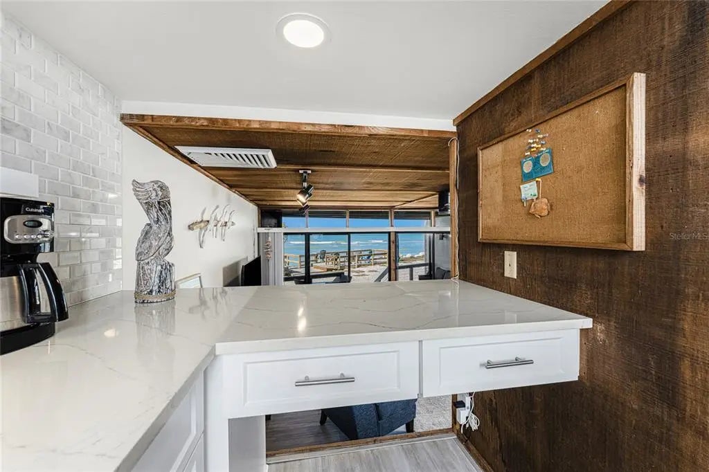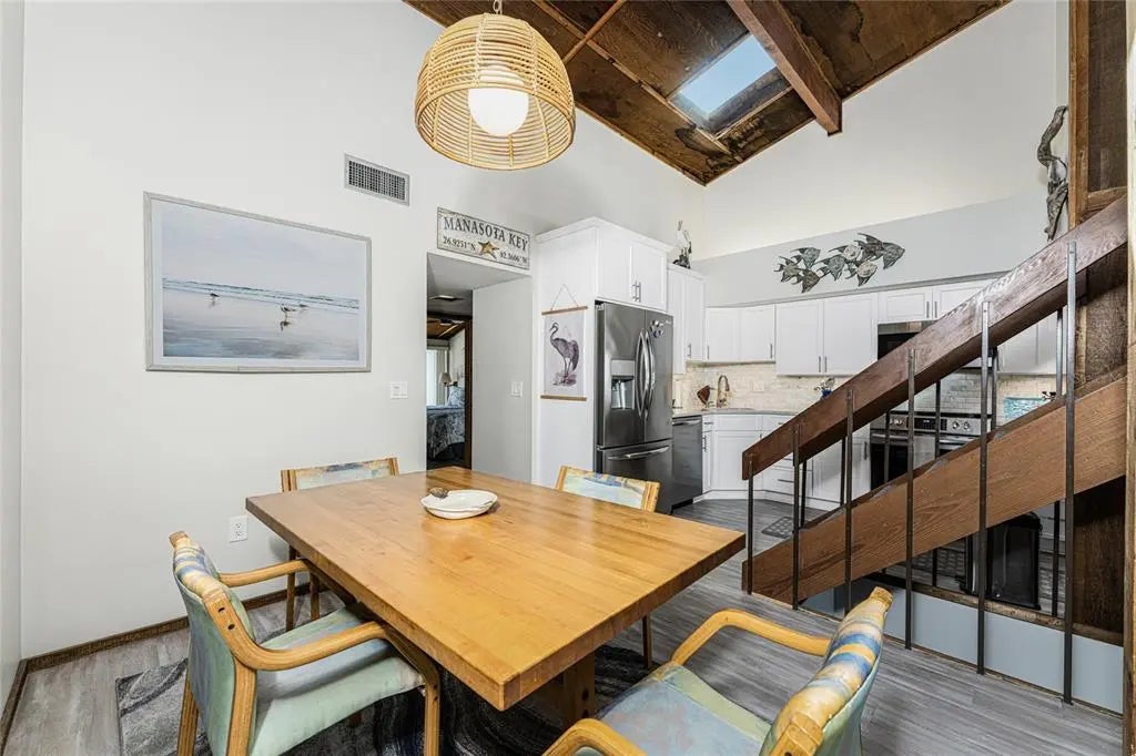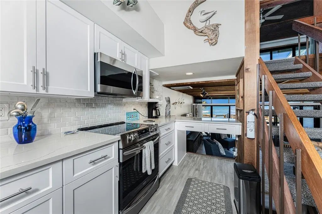 Welcome to Banyan Bluff Condominiums, a private four-residence townhome community set directly along the Gulf front of Manasota Key in Englewood, Florida. This lovely 3-bedroom, 2-bath multi-level townhome offers privacy and a tranquil atmosphere, positioned on more than an acre and comfortably set back from North Beach Road for added seclusion. The first living level is elevated on pilings approximately 16 feet above sea level, and the layout maximizes sweeping Gulf views and breathtaking sunsets from most rooms. A covered balcony off the main living area creates an inviting indoor-outdoor living space, ideal for dining outside or unwinding at day’s end. The beautifully updated kitchen includes new stainless steel appliances and quartz countertops. Upstairs, the top floor primary bedroom suite offers a vaulted ceiling, walk-in closet, an updated en-suite bathroom, and recently replaced storm-rated sliders that open to a private open balcony overlooking the Gulf. Both guest bedrooms include storm-rated windows and the guest bathroom is located just beyond the kitchen and adjoining dining area. Convenient parking includes two under-building spaces and an EV charging port. The tiled entry foyer includes an adjoining utility room with a new washer/dryer, utility sink and room for storage. The townhome is being offered turnkey furnished. Whether you choose to make it your own or place it in a rental program, this condo offers outstanding versatility. Banyan Bluff residents also enjoy a Gulf-front wooden deck, perfect for soaking up the sun or enjoying evening sunsets. Other notable updates include a metal roof in 2023, a newer electrical panel, and tankless water heater. A rare opportunity to own a stunning beachfront townhome in a quiet, exclusive setting.