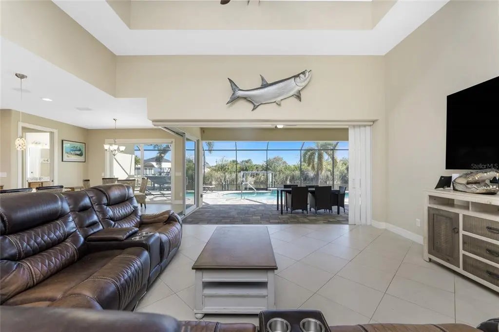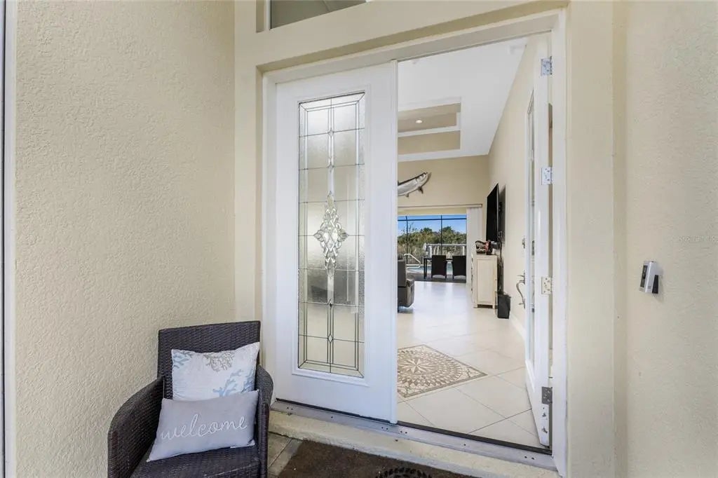 Boating days, poolside or dockside nights, and the best of Florida living come together in this exceptional waterfront home in South Gulf Cove, with the option to purchase the adjacent lot! Designed for relaxed coastal living, this three bedroom, two bathroom, three car garage DM Dean built residence offers a thoughtful layout and an impressive list of features including impact windows and doors, a Sonos surround sound system, interior and exterior security cameras, 8 foot interior doors, tile flooring throughout, and a fully fenced yard. A paver driveway and walkway lead to the screened double door entry and welcoming leaded glass doors. Inside, the great room is highlighted by a tiered coffered ceiling, while zero corner pocketing sliding doors with automatic blinds create seamless indoor and outdoor living. Natural light and water views set the tone throughout the main living space. The spacious kitchen is ideal for everyday living and entertaining, featuring abundant wood cabinetry, generous granite countertop space, a center island, tumbled stone backsplash, pantry, and an eat-in area. Additional sliding glass doors open to the lanai, all overlooking the pool and tranquil waterway beyond. The ensuite primary bedroom is a peaceful retreat with a tray ceiling, plantation shutters, sliding glass doors to the pool area, and dual walk-in closets. The primary bathroom offers a fully tiled Roman style walk through shower with seating and dual separate granite topped vanities. A split bedroom floor plan provides privacy for guests, with a pocket door separating the guest wing. Guest bedrooms are spacious with reach in closets, and one offers direct lanai access through sliding glass doors. The guest bathroom includes a tub and shower combination, a large granite topped vanity, and convenient pool access. At the front of the home, a flexible bonus space with double French doors and plantation shutters is perfect for a home office, workout room, playroom, or additional guest suite. The interior laundry room is well appointed with a built-in granite folding counter. Outdoor living is where this home truly shines. The large screened and partially covered pavered lanai features newer ceiling fans and a heated pool, creating the perfect setting to unwind while enjoying peaceful water views. The dock with lift offers easy access to the water, while the underwater light turns evenings into a peaceful fish watching experience. Simply step aboard and head out to Charlotte Harbor, the Gulf, Stump Pass, or Punta Gorda, where waterfront restaurants and tiki bars await. This home is tucked away in the quiet waterfront community of South Gulf Cove, where the HOA is optional and offers a low cost membership with access to a clubhouse, playground, and a variety of activities. A public boat ramp is also conveniently nearby. An additional opportunity exists to purchase the vacant lot next door separately. Make sure 9386 Arrid Circle is on your list of homes to see and experience true waterfront Florida living firsthand.