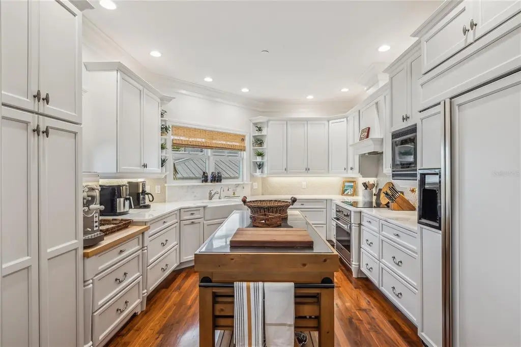 Experience exceptional waterfront living in this Coral Creek Anglers Club residence by Safety Harbor Builders, offering 3,886 sq ft with 4 bedrooms and 4.5 baths. The entry level features a spacious family/media room, two guest suites with en-suite baths, and a charming bunk cubby, plus expanded private guest accommodations above the garage. The main living level includes elegant living and dining areas, a recently updated kitchen, and a luxurious primary suite. Custom details throughout include granite and quartzite countertops, wood floors, crown moldings, and beadboard accents. Waterside decks and porches on every level provide stunning views and sunset enjoyment, while the top-floor office offers panoramic water vistas. Outdoors, a deepwater dock with 16,000 lb. and 8,000 lb. boat lifts delivers outstanding boating access. Located in a gated community with pool and clubhouse, and close to bike trails, fishing, and nearby islands. Sold tastefully furnished and move-in ready.