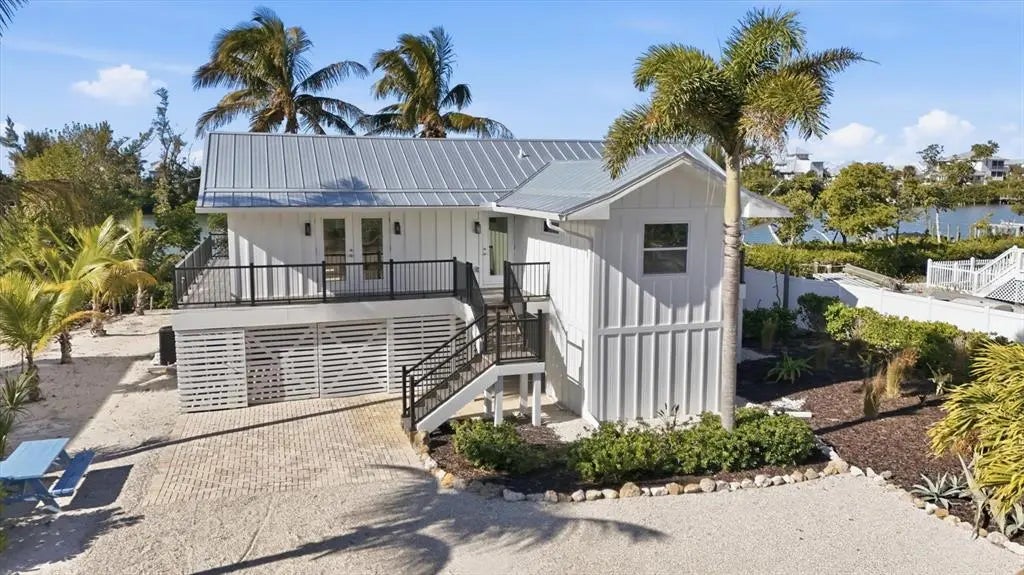 This like new home is ready to move into located on Don Pedro/Palm Island overlooking Bocilla Lagoon. On your approach to the home, you'll see it has a recently updated metal roof. This Key West Style Home is finished in a board and baton hardy board siding with black aluminum railings. The stairs and all decks are built with gray composite material. The waterside open deck is12 x 24. This offers a seating area with full waterfront views over Bocilla Lagoon for enjoying Florida sunsets with sounds of the Gulf. There are 2000 sq feet of pavers under the home and pool area, which is great for outdoor entertaining. There is a private wooden dock with boat lift pilings in place for a future lift. Lush landscaping, beautifully trimmed mangroves, rip rap and large mature coconut palms are aligning the pool area. On entering the home, the first thing you'll notice is the abundance of impact windows and glass doors which offer natural light with an open floor plan and 12' vaulted ceilings throughout. The flooring consists of Andare almond porcelain tile with the bathrooms done in opal white hexagon porcelain tile. The great room which includes the kitchen that has a 4.5' x 12' long waterfall style island/breakfast bar and stainless-steel sink. All countertops in this home are made of solid white/sparkle white quartz. All appliances are matching LG stainless steel, including the stack washer and dryer. The wooden cabinets offer soft close cabinets. The 12 x 20 waterfront dining area is surrounded by glass doors and windows. The primary bedroom has water views and a private bath with floor to ceiling walk in shower with Lenox Caspian porcelain tile walls and cobalt sea pebbles hot glass mosaic flooring. The second bedroom is directly across the hall from a full bath. The third bedroom has its own private full bath with a tub and shower combination. Home measures 1,347 sf - A/C, provided by Seller. If you're looking for high end finishes and island living, you certainly don't want to miss out on this one.