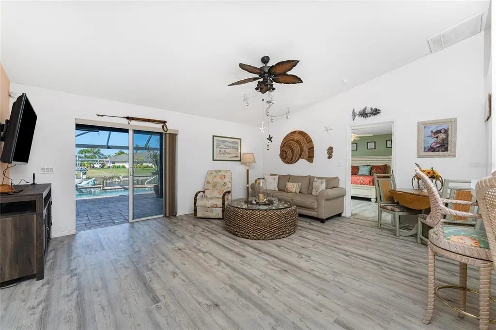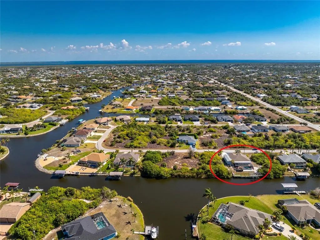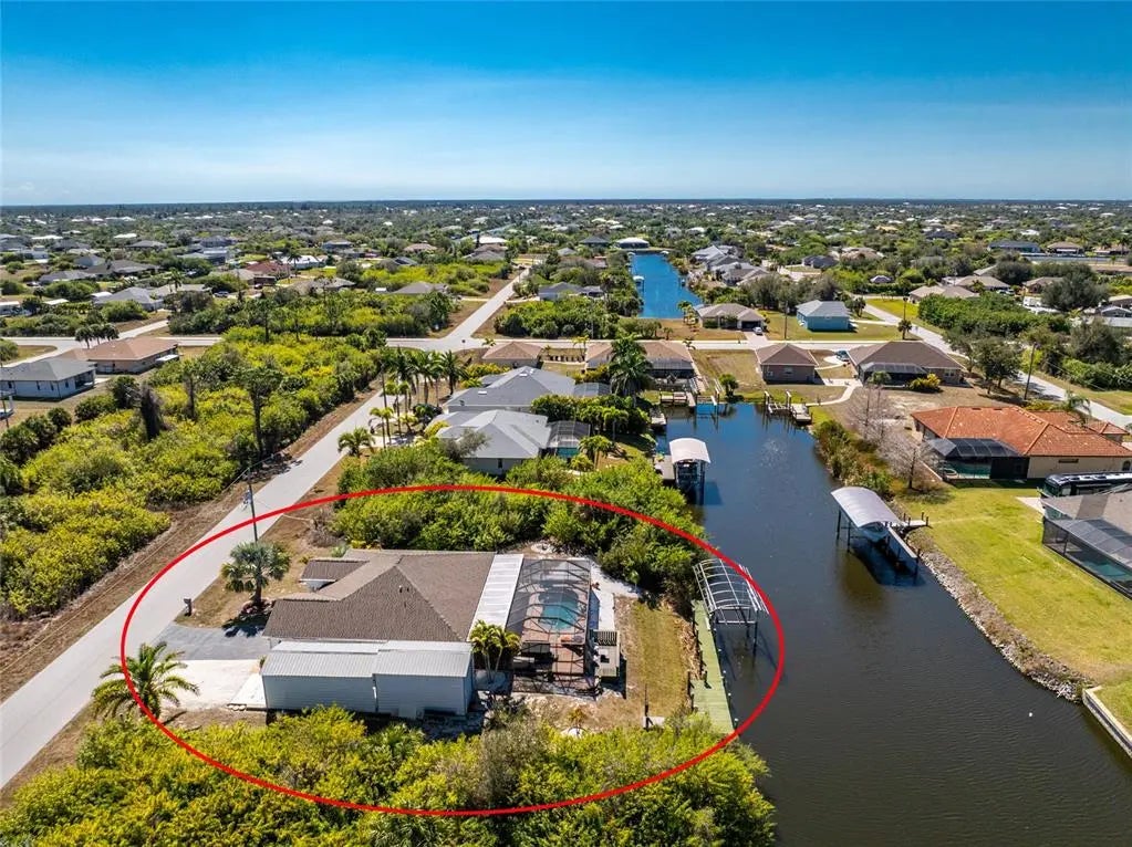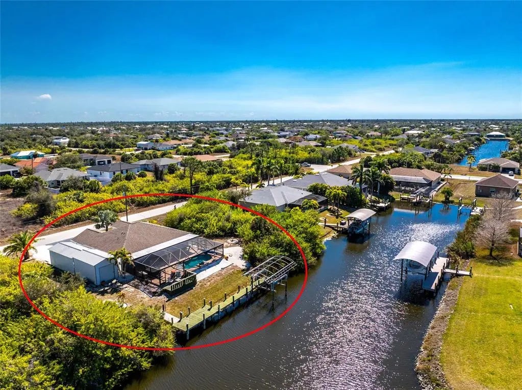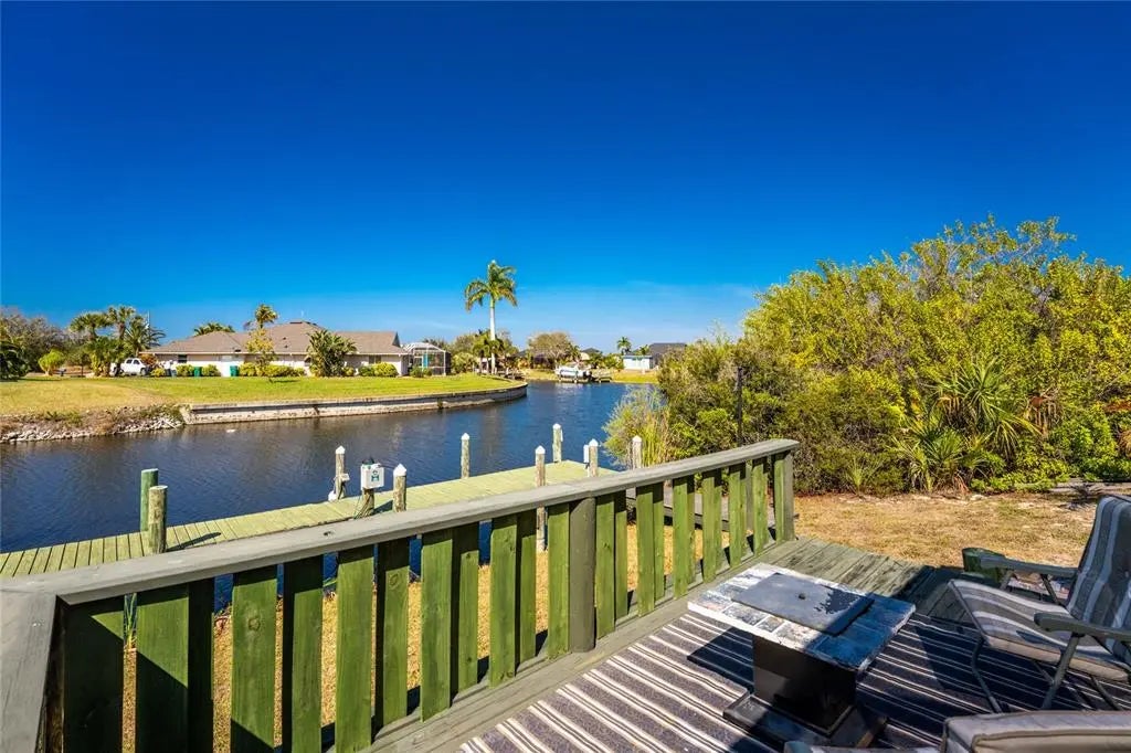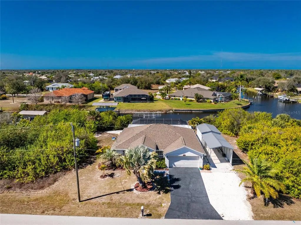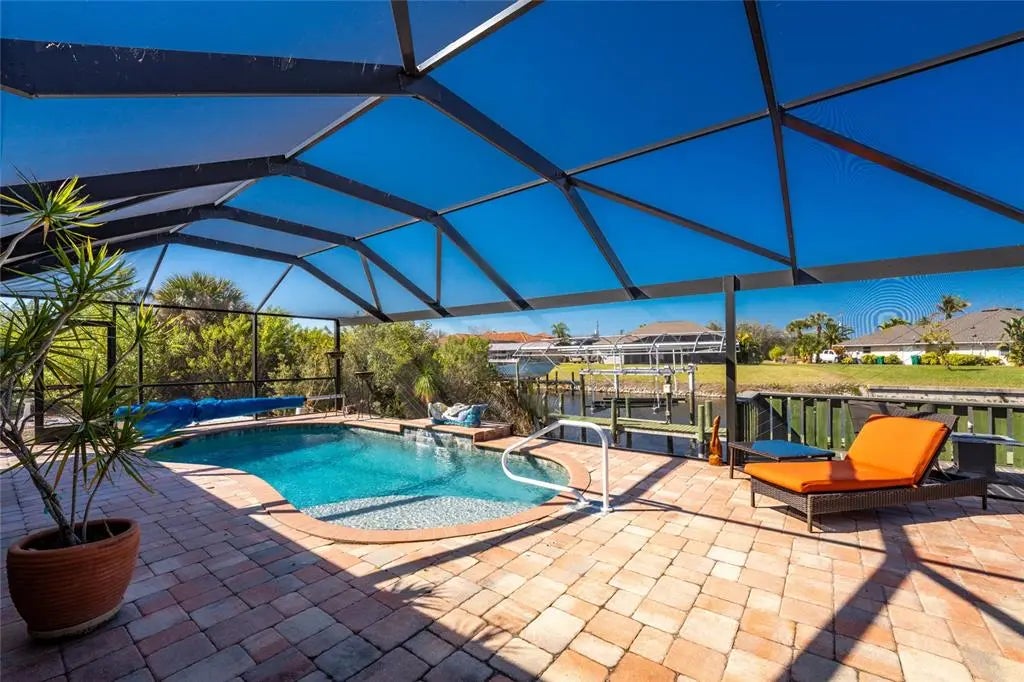 Live the Ultimate Southwest Florida Waterfront Lifestyle with Gulf Access, Sunset Views, a Heated Saltwater Pool, Tiki Bar and 10,000 lb Boat Lift in South Gulf Cove! This three bedroom, two bathroom home was designed for everyday living, entertaining, and all the toys that come with a Florida waterfront lifestyle. In addition to the two car attached garage, you have a detached 12x20 garage with doors on both ends for easy pull through access that connects to a 12x30 carport. Bring the boat gear, kayaks, golf cart, or even an RV with the 30 amp hookup already in place. The tropical pink front door sets the mood before you even step inside. The open floor plan feels welcoming and comfortable, with cohesive wood look LVP flooring throughout the main living areas and tile in the bathrooms for easy care. Formal living and dining rooms with vaulted ceilings greet you at the entry and offer great space for hosting holidays or relaxed dinners with friends. The kitchen sits right in the center of the home with access on both ends, making it easy to move between rooms. You will find plenty of white cabinetry, a breakfast bar, reach-in pantry, and plant shelves. Just beyond, the large family room continues the vaulted ceilings and opens to the lanai through sliding glass doors. From here, you can watch boats go by on the canal or catch the sun setting over the pool while dinner is on the stove. The primary bedroom is spacious and peaceful, with a walk-in closet and a large window overlooking the pool area. The bathroom has been beautifully remodeled with a custom tiled shower in water inspired tones and a dual sink vanity. Two guest bedrooms with reach in closets share a guest bathroom with a shower and tub combo and fun flamingo inspired decor that keeps the coastal feel going. An interior laundry room with a newer stackable washer and dryer makes daily tasks simple. Out back is where this home really shines. The large paver lanai offers both covered space and clear view screening so you never lose sight of the water. There is a built-in bar for easy entertaining, a 2017 heated saltwater pool with a waterfall feature, a separate hot tub, and an open air deck overlooking the canal. The dock is spacious and equipped with a 10,000 lb boat lift. Additional updates include a 2019 HVAC system and a 2025 garage door opener. Located in the quiet waterfront neighborhood of South Gulf Cove, the HOA is optional with a low annual fee if you would like to participate in community activities, enjoy the clubhouse, or use the playground. There is also a public boat ramp nearby. You are convenient to Boca Grande, Port Charlotte, Englewood, local marinas, beaches, restaurants, major league baseball spring training centers, and golf. If your idea of a good day includes fishing in the morning, a boat ride in the afternoon, and winding down in the pool while the sky turns shades of orange and pink, 9300 Miami Circle is ready for you.
