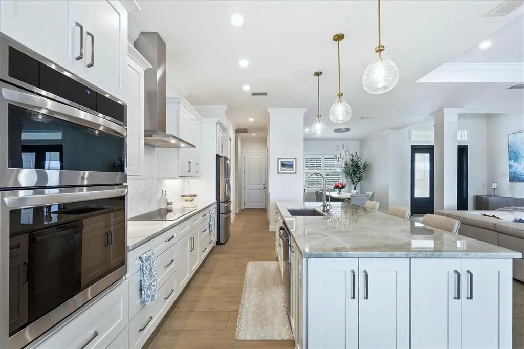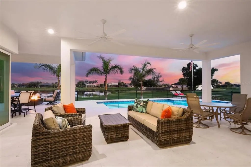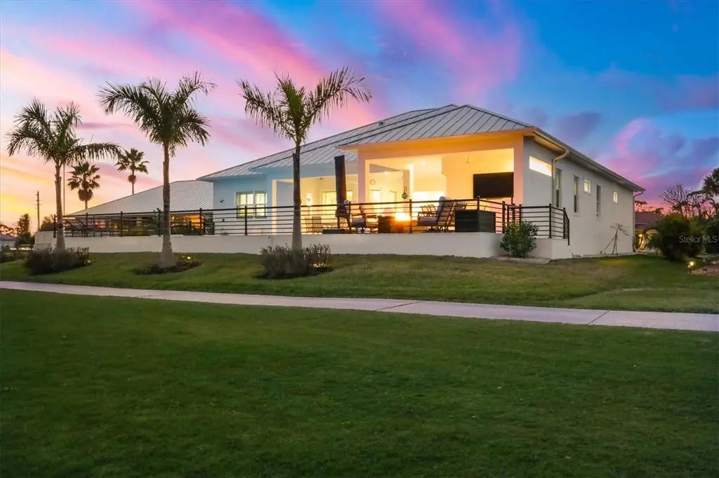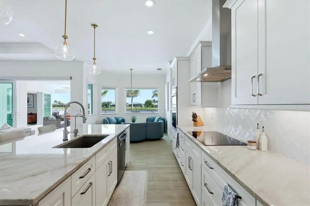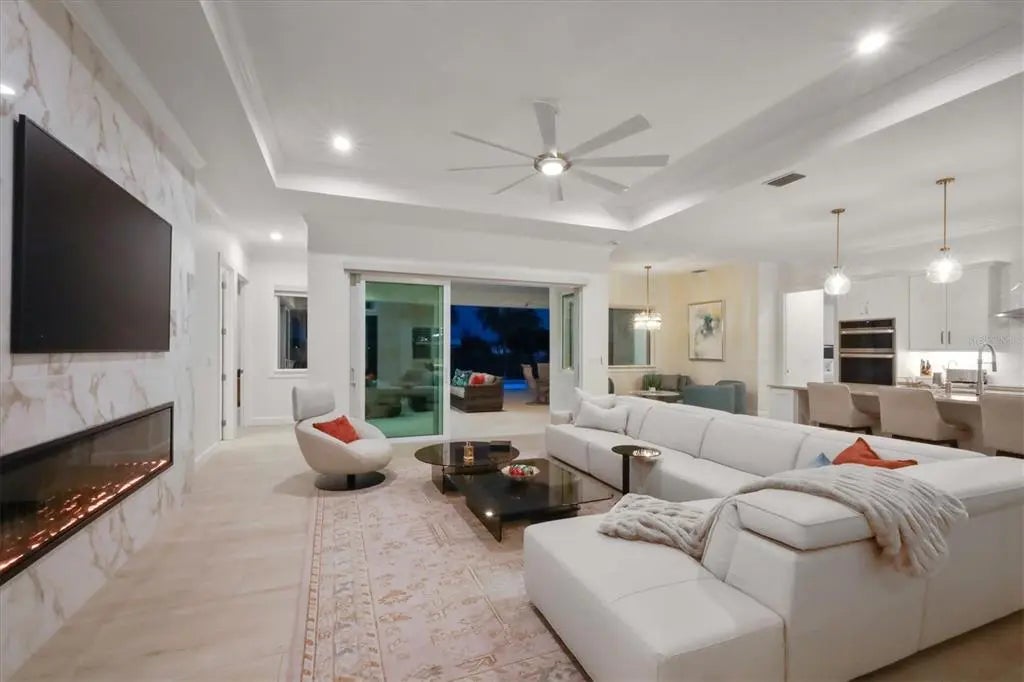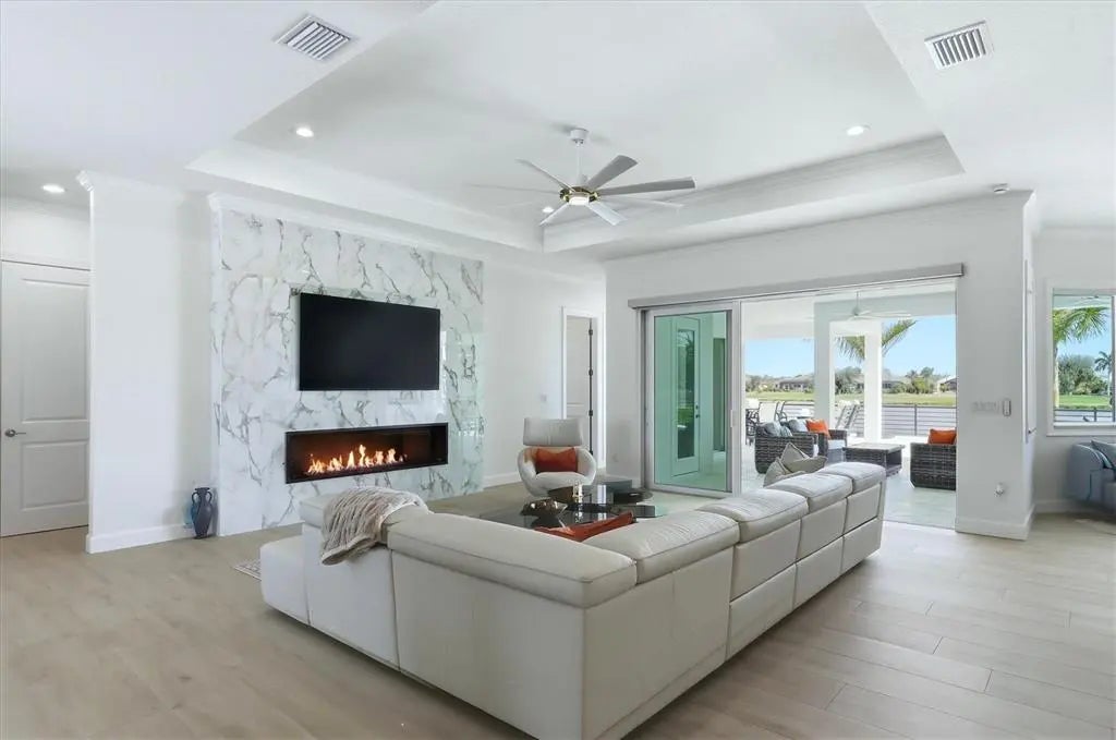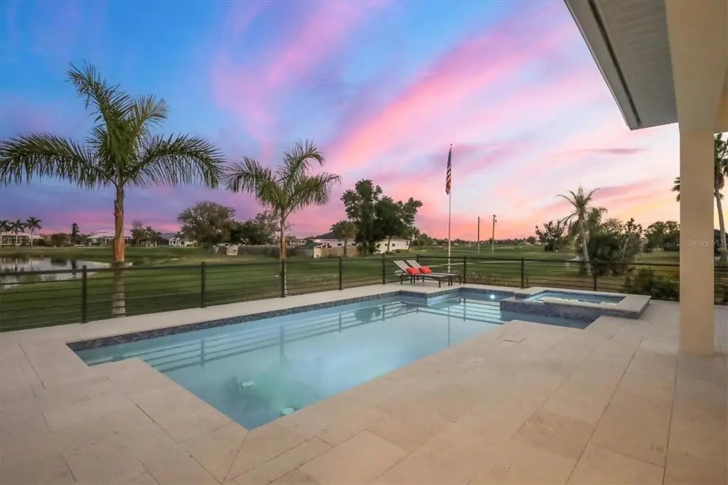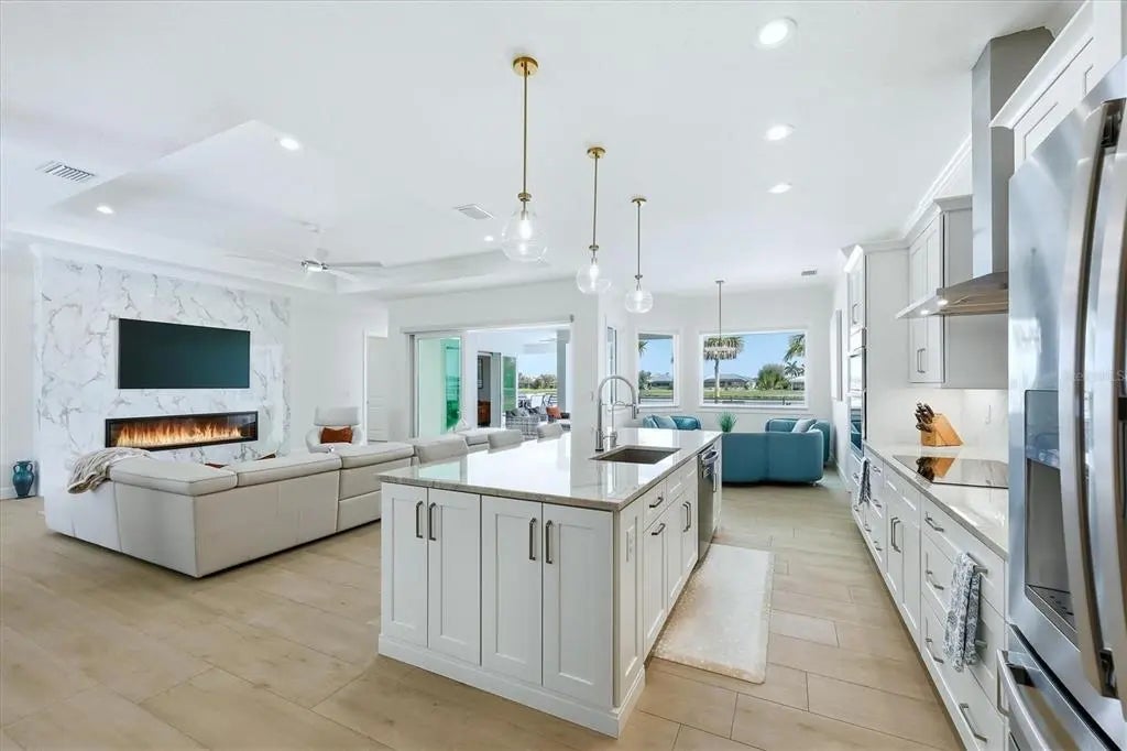 Perfectly positioned on a prime golf course front homesite with breathtaking lake and fairway views, this 2025-built luxury residence showcases awe-inspiring design and uncompromising construction quality. Offering 3 bedrooms plus a spacious den/family room, 3 full baths, and nearly 3,000 square feet under air (approximately 4,700 total square feet), this exceptional home blends elegance, comfort, and superior craftsmanship. A grand double-door entry opens to a dramatic foyer with instant, mesmerizing views of the golf course, lake, and spectacular pool lanai. Expansive living areas are enhanced by soaring 12+ foot ceilings, large-pattern plank tile flooring throughout, and premium designer finishes at every turn. The impeccably appointed kitchen is a true showpiece, featuring stunning Taz Mahal stone countertops, an oversized island wrapped in additional cabinetry, designer tile backsplash, built-in stainless steel appliances, and a generous butler's pantry. The adjoining great room impresses with a towering tray ceiling and a striking large marble feature wall with grand inlay fireplace. A spacious den/family room offers secluded comfort with direct pool access and tranquil views - perfect for relaxing or entertaining. Bathrooms boast exquisite tile work, complemented by premium lighting and plumbing fixtures throughout the home. A bright, oversized laundry room just off the butler's pantry provides abundant storage and workspace. Outdoor living is nothing short of sensational. The heated pool and spa are surrounded by an immense covered lanai, an open-air sitting area with fire pit, and beautiful stone pavers - creating the ultimate setting for quiet evenings or vibrant gatherings. Additional highlights include a metal roof, impact-resistant windows and sliders, a grand circular driveway, and a three-car garage with epoxy-coated flooring and a convenient lift system to the spacious attic. Ideally located in a superb coastal setting just minutes from three marinas, the pristine sandy beaches of Palm Island and Boca Grande, world-class fishing and boating, outstanding private and public golf courses, and within golf cart distance to essential shopping and dining.