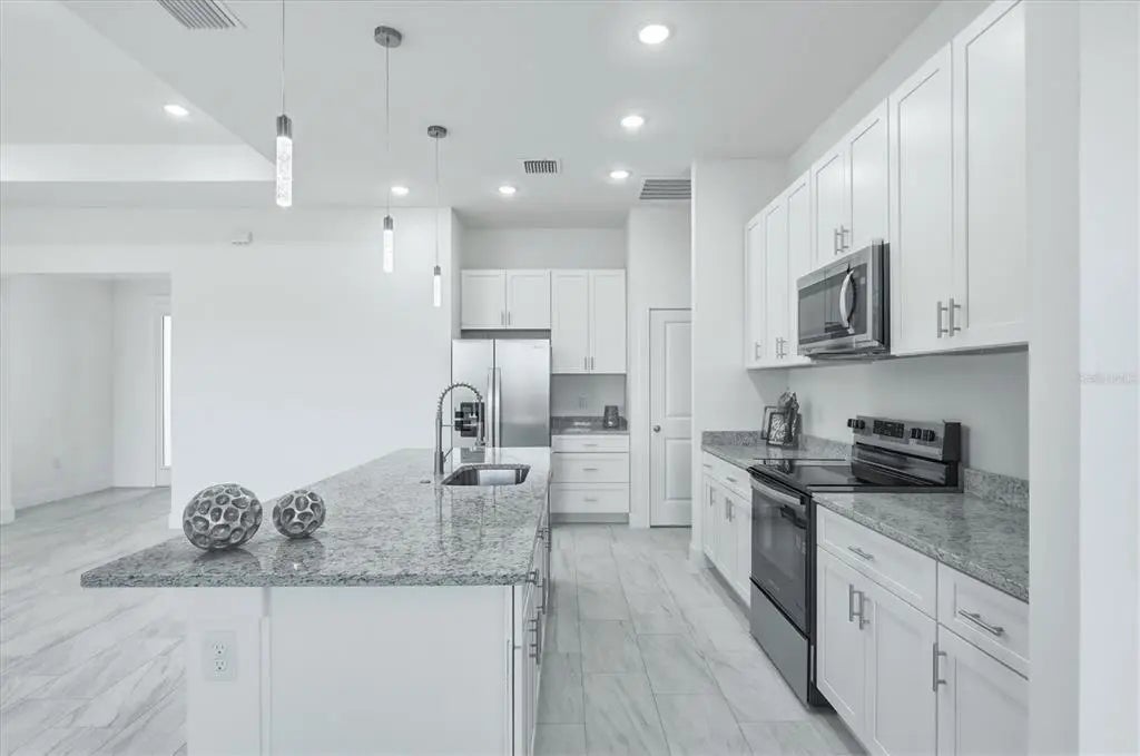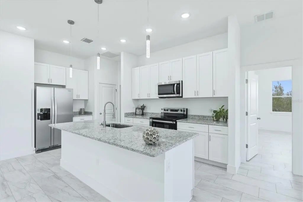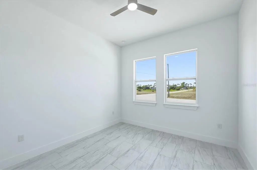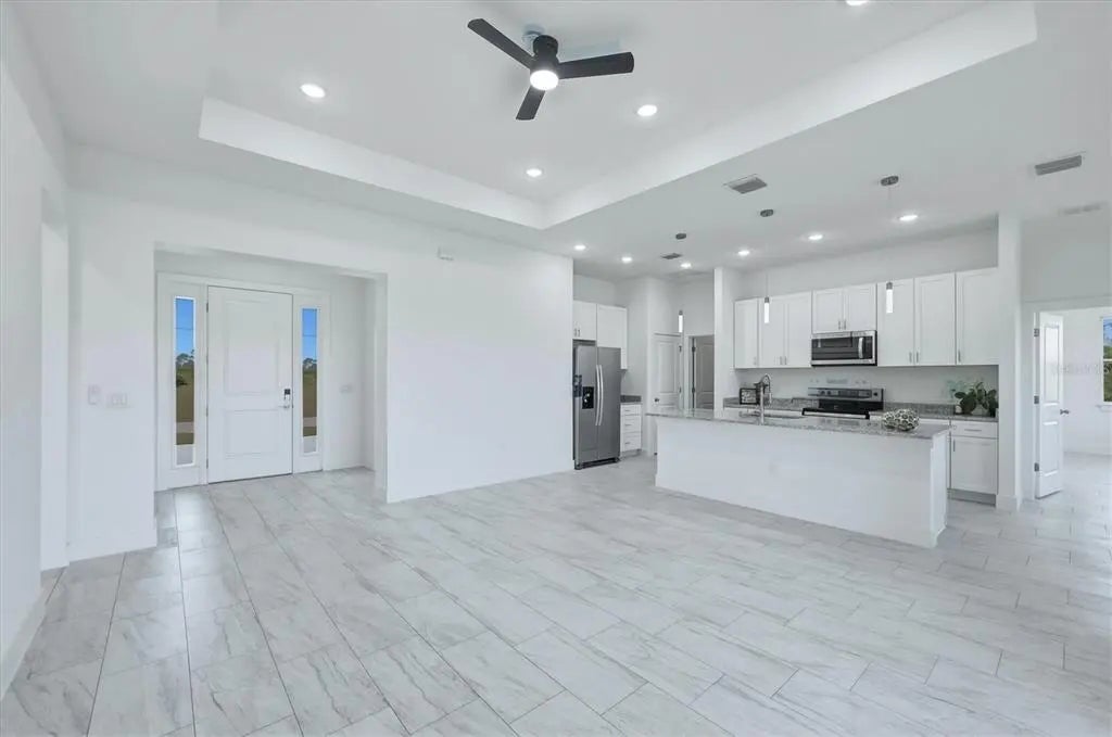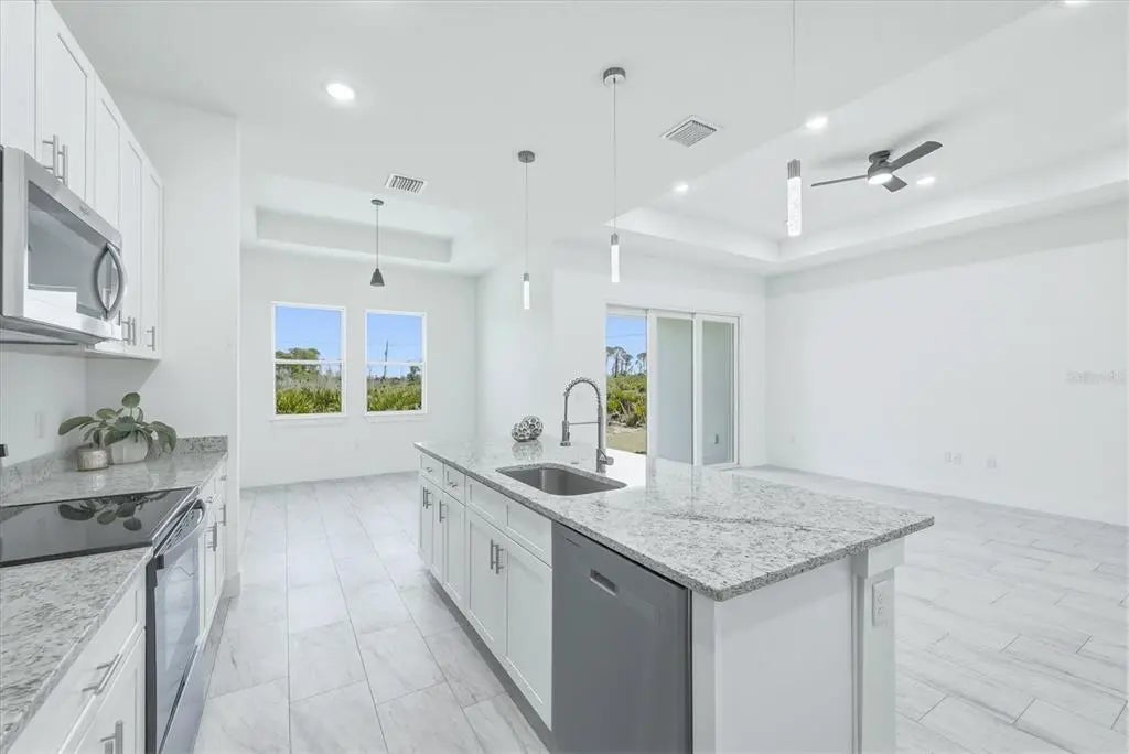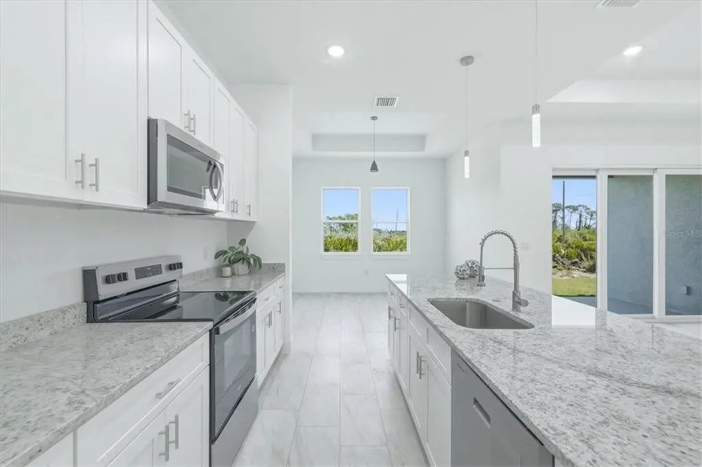 Step into modern Florida living with this brand-new 4-bedroom, 2-bath, 2-car garage home offering 1,855 sq ft of bright, open, thoughtfully designed space in the highly loved Rotonda Sands community. Built in 2026, this home blends quality craftsmanship with clean, contemporary style. Inside, you’ll find all-tile flooring throughout, stone counters, and soft-close cabinetry. The kitchen features all-new stainless appliances, and the home even includes an interior laundry with cabinets and a washer and dryer—truly move-in ready. High ceilings, gracious front entry, and abundant natural light create an inviting, airy feel from the moment you walk in. Both bathrooms are beautifully appointed with double-sink vanities, and the split floor plan offers privacy and functionality. Storage is abundant, with multiple closets throughout and a huge walk-in closet in the primary suite. Every window and door is impact-rated, giving you peace of mind year-round. Enjoy outdoor living with a covered front porch and a covered back patio, perfect for relaxing or entertaining. The backyard offers ample space to add a pool, giving you room to expand your Florida lifestyle exactly the way you want it. Located in a quiet, well-kept neighborhood, this home is just minutes from Gulf beaches, boating, shopping, and dining. Rotonda Sands is known for its friendly atmosphere, public water and sewer, low annual HOA fee, and moderate deed restrictions that help maintain the community’s charm without being overbearing. Whether you’re looking for a full-time residence, seasonal escape, or a strong rental investment, this home checks every box. Priced to sell and ready for its first owner.