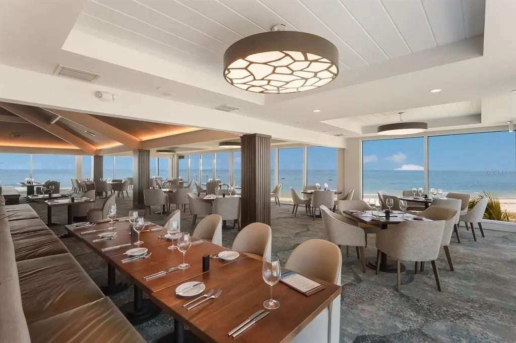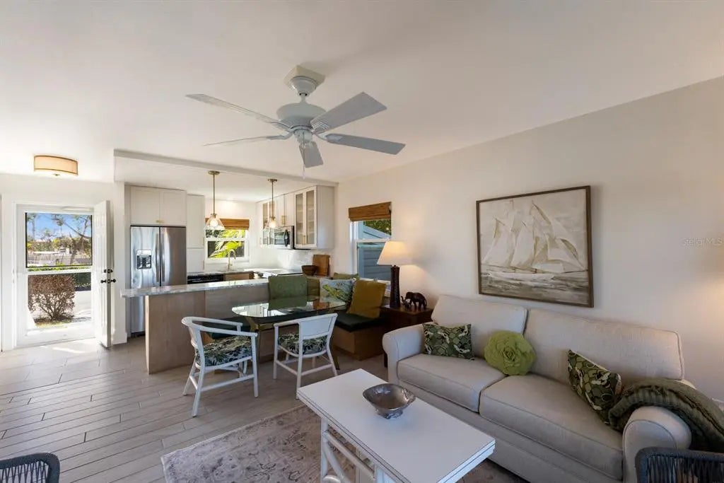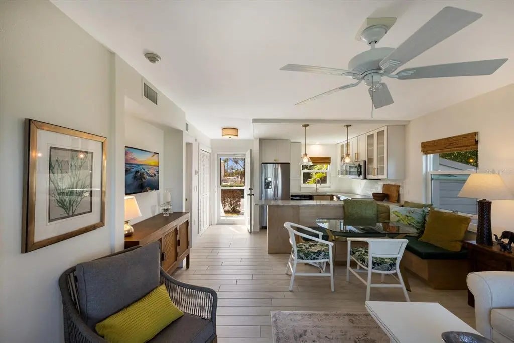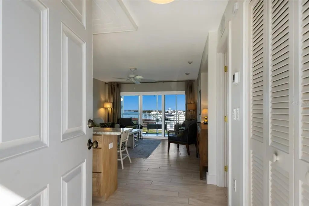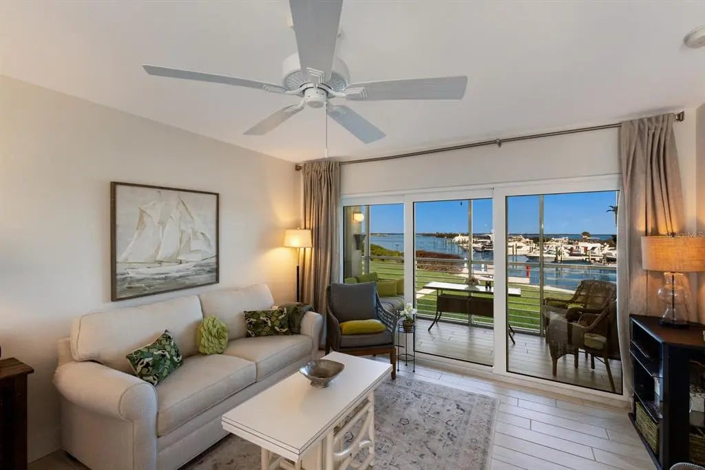 Enjoy a front row view of Charlotte Harbor! This one bedroom, one bath end unit was beautifully renovated in 2022. It boasts all new kitchen cabinets, custom built in bench seating with hidden locked owners’ storage, ocean beige dolomite kitchen counters( harder than marble and more heat resistant than quartz). The bathroom has Pompeii iscle quartz countertop. New AC in 2023! Hurricane impact windows and doors, tile floors, and updated lighting. Sit on your screened in lanai and watch dolphins, manatees, wildlife and yachts. Wake up to majestic sunrises! The Boca Grande Club is rich in amenities including private beach access, tiki bar pool side, 8 tennis courts, state of the art fitness center and 1st class Club House dining with panoramic beach views. Marina Village is a serene and all embracing community. Own your piece of paradise right here!