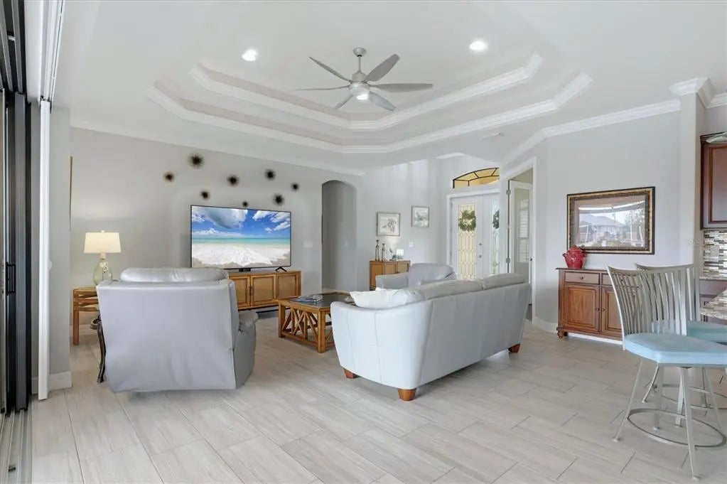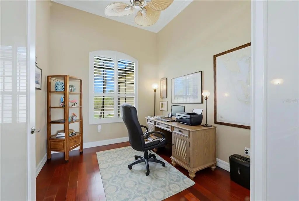 - Interior FeaturesCeiling Fan(s), Coffered Ceiling(s), Crown Molding, Eating Space In Kitchen, High Ceilings, Primary Bedroom Main Floor, Solid Wood Cabinets, Split Bedroom, Stone Counters, Tray Ceiling(s), Walk-In Closet(s)