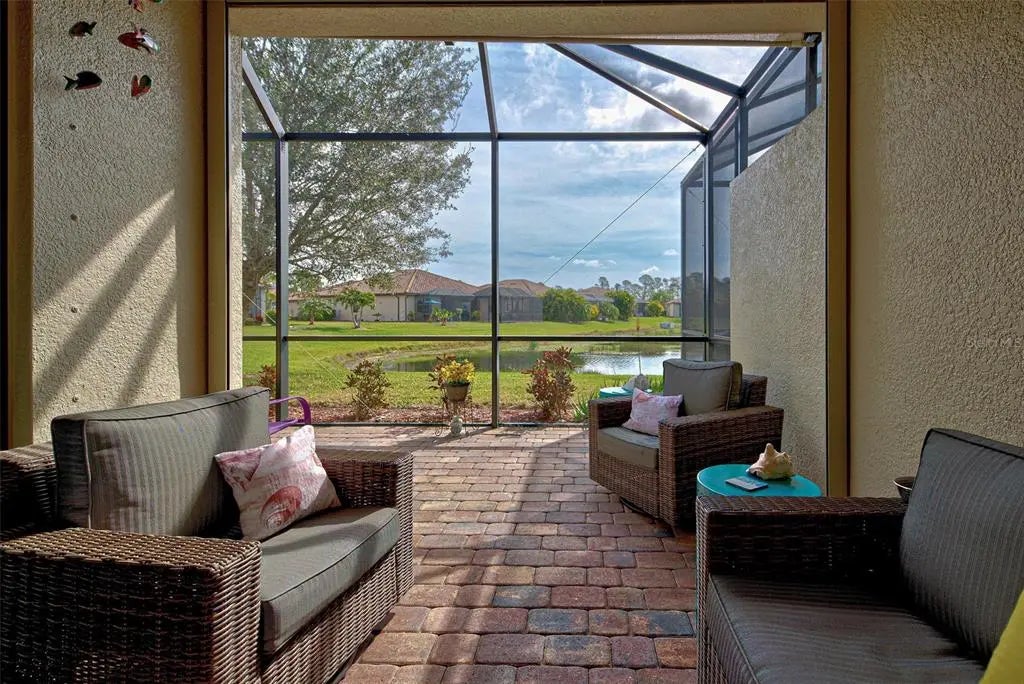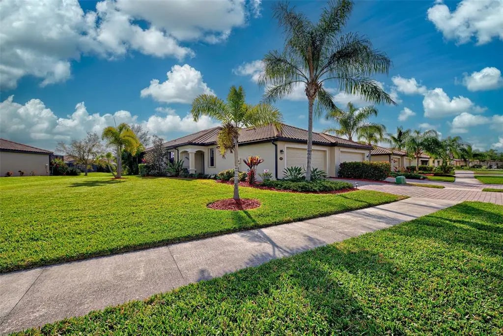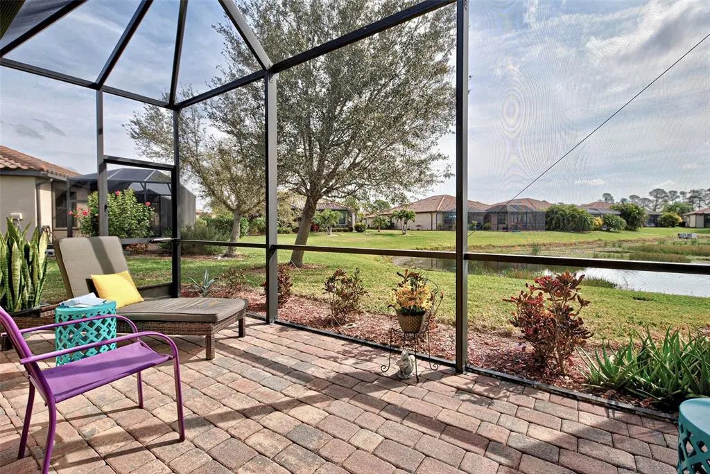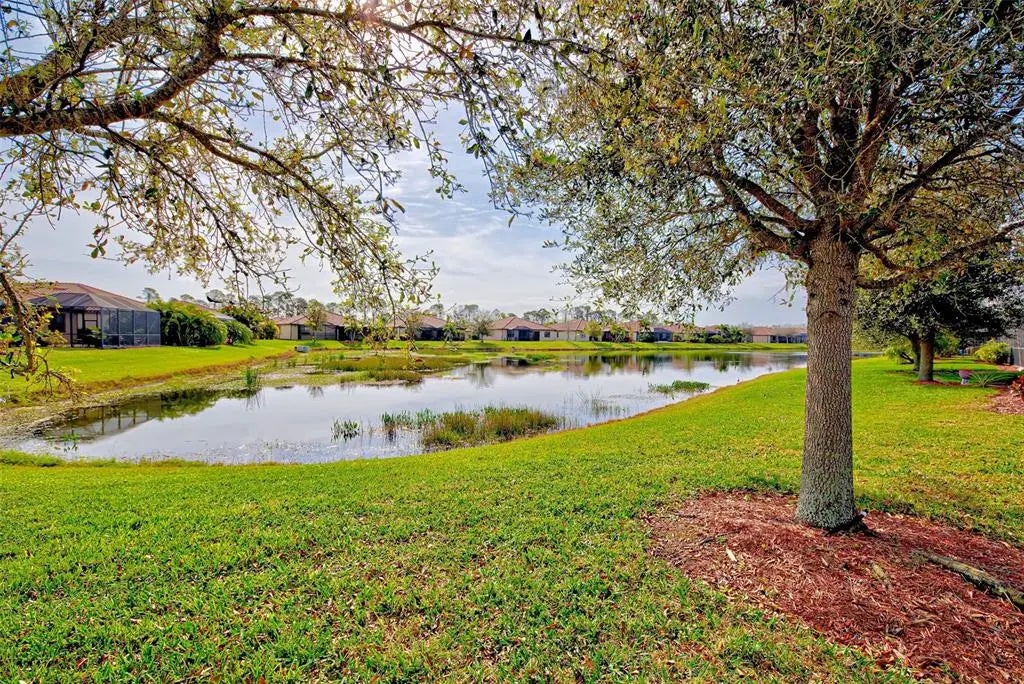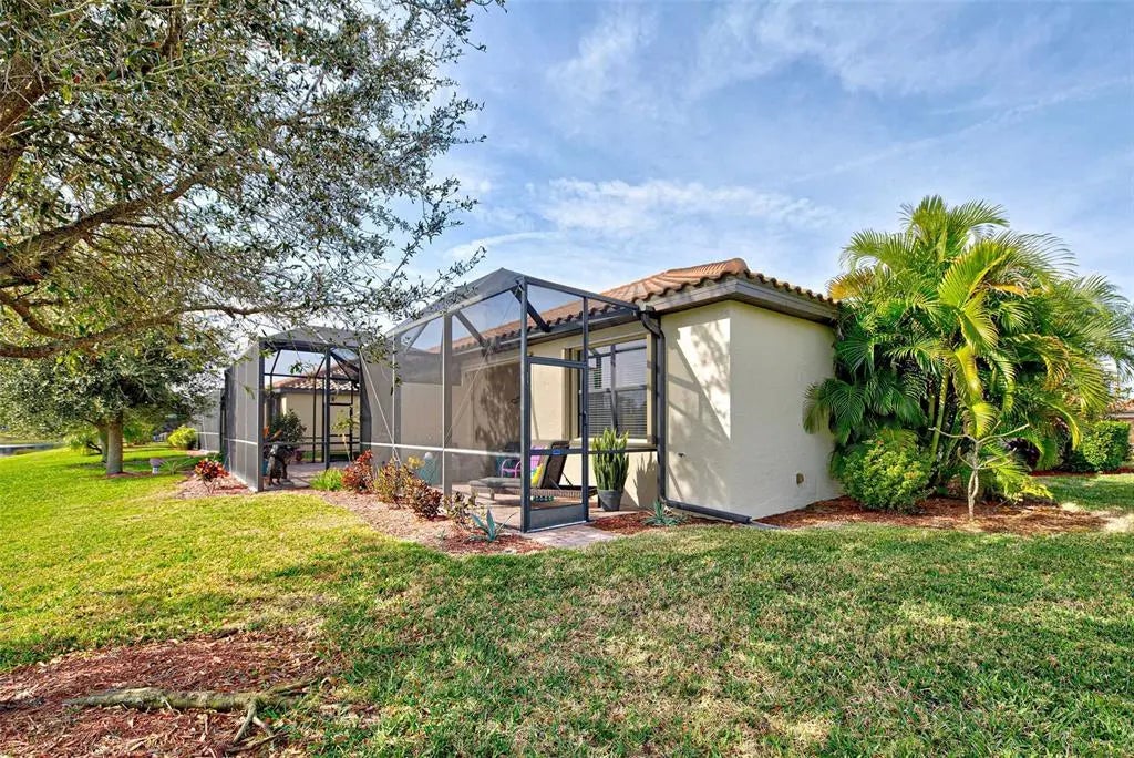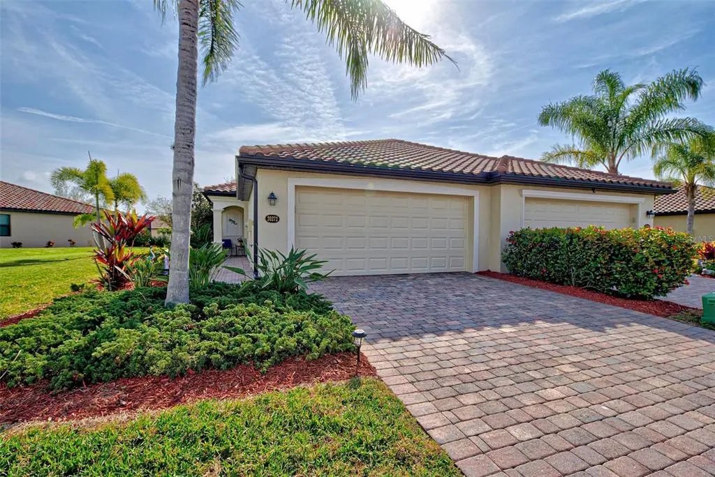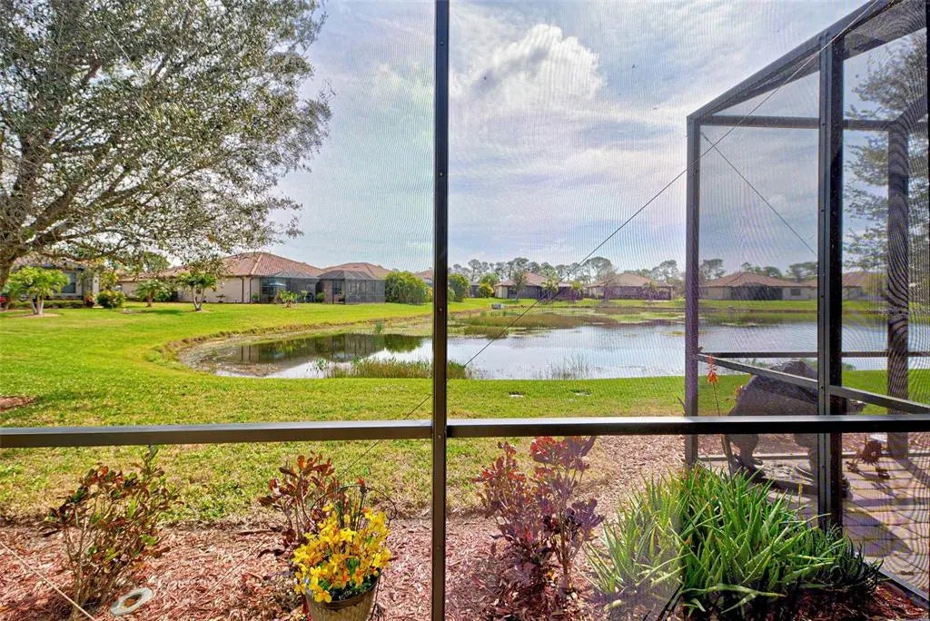 Check out the beautiful pond view and experience the ultimate in Florida living from the comfort of this exquisite villa within the maintenance-free resort community of Gran Paradiso. Embrace the Orchid model's thoughtful SPLIT FLOOR PLAN design, TWO BEDROOMS AND A DEN with French doors, two baths and 2 CAR GARAGE. Check out the Updated two-car garage that has a StorPro OVERHEAD STORAGE SHELF and a NewAge GARAGE STORAGE CABINET/WORK BENCH with TWO ROLLOUT TOOL BOXES. This home has beautiful finishes such as crown moldings, granite countertops, and diagonally tiled floors, complemented by stainless steel appliances in the kitchen. A new water heater was installed in 2023. NO WORRIES putting up HURRICANE SHUTTERS this villa is equipped with a ROLL DOWN SHUTTER ON the LANAI and ACCORDIAN SHUTTERS ON EACH WINDOW. Situated on one of the FEW OVERSIZED LOTS in Gran Paradiso, this villa offers ample green space and extra space between the villas. Indulge in the resort-like array of amenities, including community activities, a rejuvenating pool, saunas, steam rooms, gym and workout facilities, PICKLE BALL and tennis courts to name a few. Or simply unwind while admiring the pond and the beautiful array of birds from your lanai. Located close to Beaches, shopping, the Braves Winter Training facility and lots of great dining Choices! Call today for your private showing and elevate your living experience in Gran Paradiso's premier community.