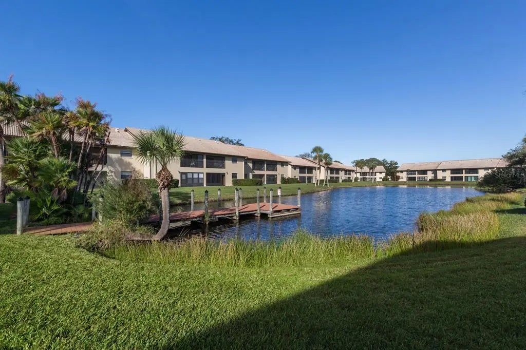 Welcome to Mission Lakes! Lovely updated upper unit overlooking the water being sold turnkey furnished. With gorgeous views of one of the community lakes from your screened balcony, this condominium is a must-see. Welcome to a clean home with an open floor plan that has been thoughtfully renovated and updated. Updated AC unit in 2020, new interior, stacked washer and dryer in 2020 and water heater in 2019. The kitchen update features new cabinetry and granite countertops with a spacious eat-in breakfast bar addition. The kitchen is open to the dinette space and living room creating an open and airy space. The living room boasts a new bar area with a stainless steel wine chiller and beautiful built-in cabinets and granite countertop ideal for entertaining. The primary bedroom offers access to the lanai and features a large walk-in closet and en-suite bath. The in-unit full-size washer and dryer will be greatly appreciated. The split floor plan allows guests their own space with access to a second bath with updated vanity. Two cars are allowed while parked tandem in the designated covered parking space complete with additional exterior storage for bikes and beach toys. Mission Lakes is a quaint community consisting of 265 units among three lakes, one of which features a day dock that residents can enjoy. Residents have the use of three separate heated swimming pools. Quarterly maintenance fees include cable TV, water, trash and recycling collection. Ideally near the Island of Venice, Mission Lakes is near shopping, upscale dining, arts and beaches, as well as the downtown Venice area which serves as the venue for community festivals, parades and activities. Mission Lakes is a pet-free community.