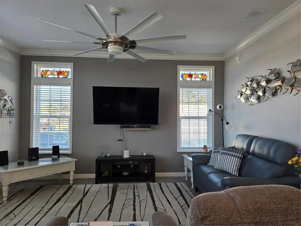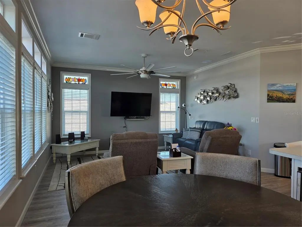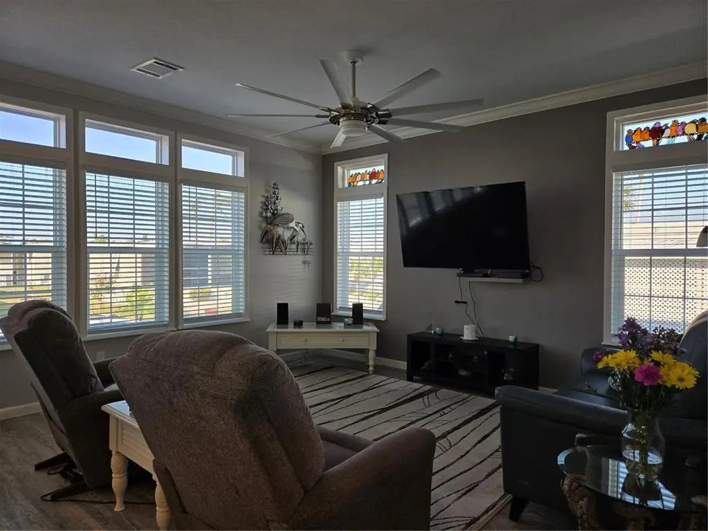 - Interior FeaturesCeiling Fan(s), Crown Molding, Eating Space In Kitchen, High Ceilings, Kitchen/Family Room Combo, Open Floorplan, Primary Bedroom Main Floor, Window Treatments