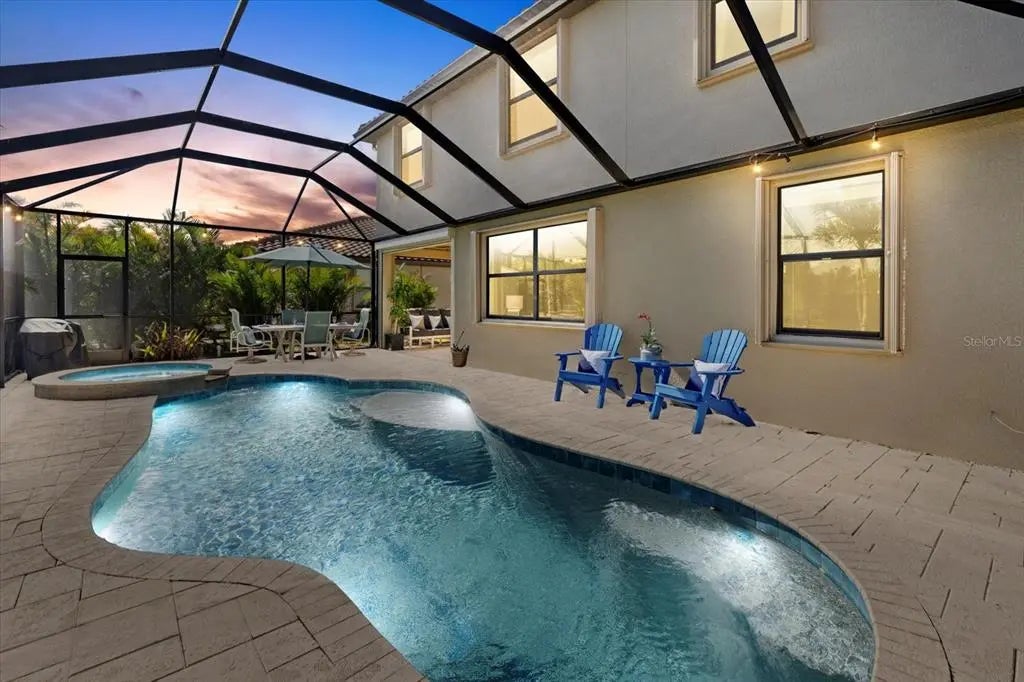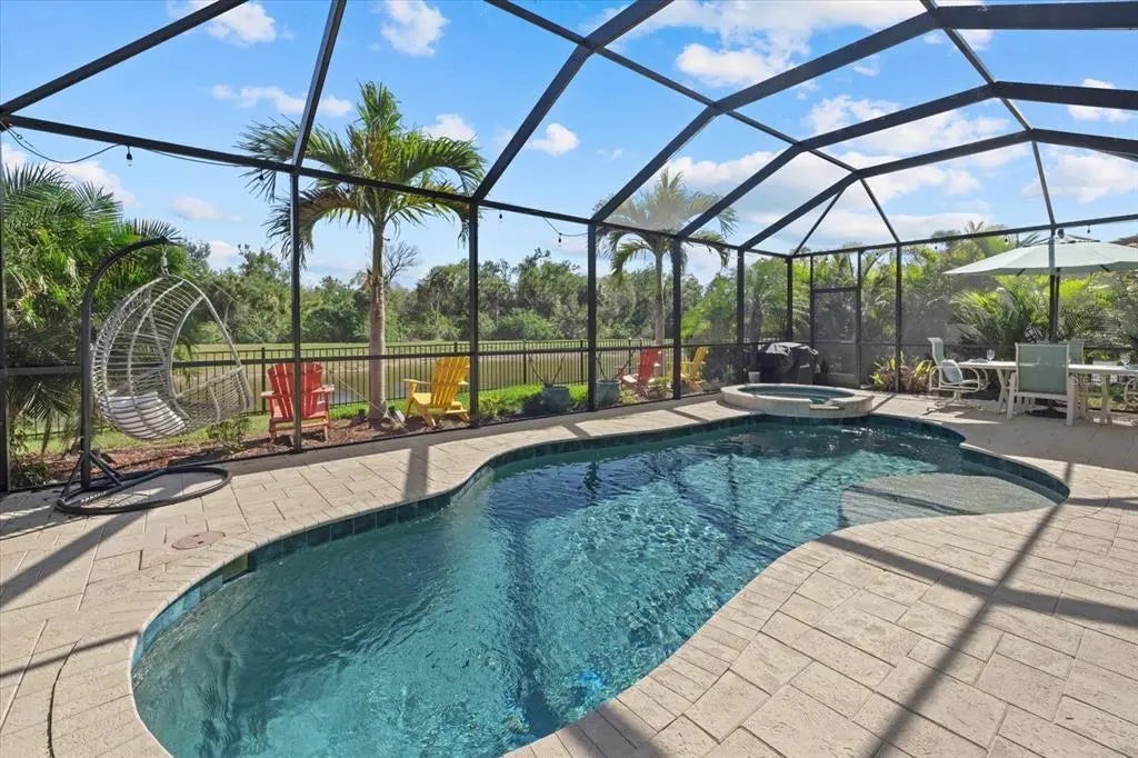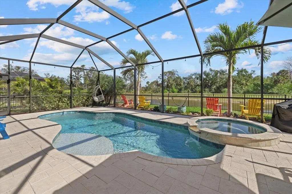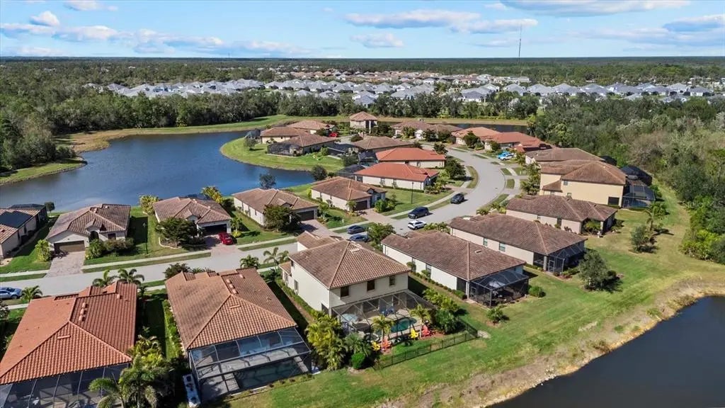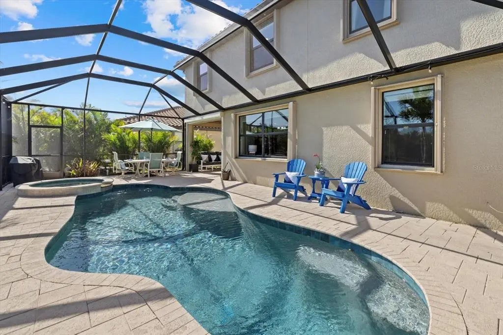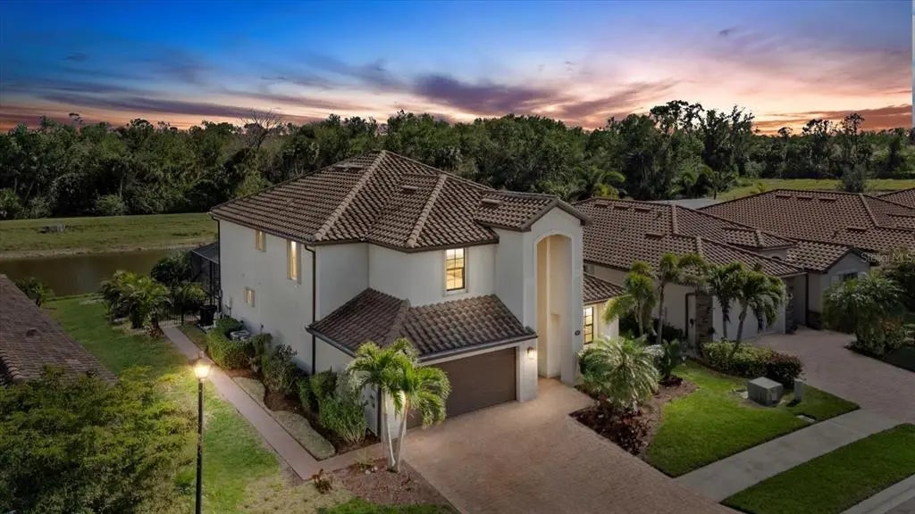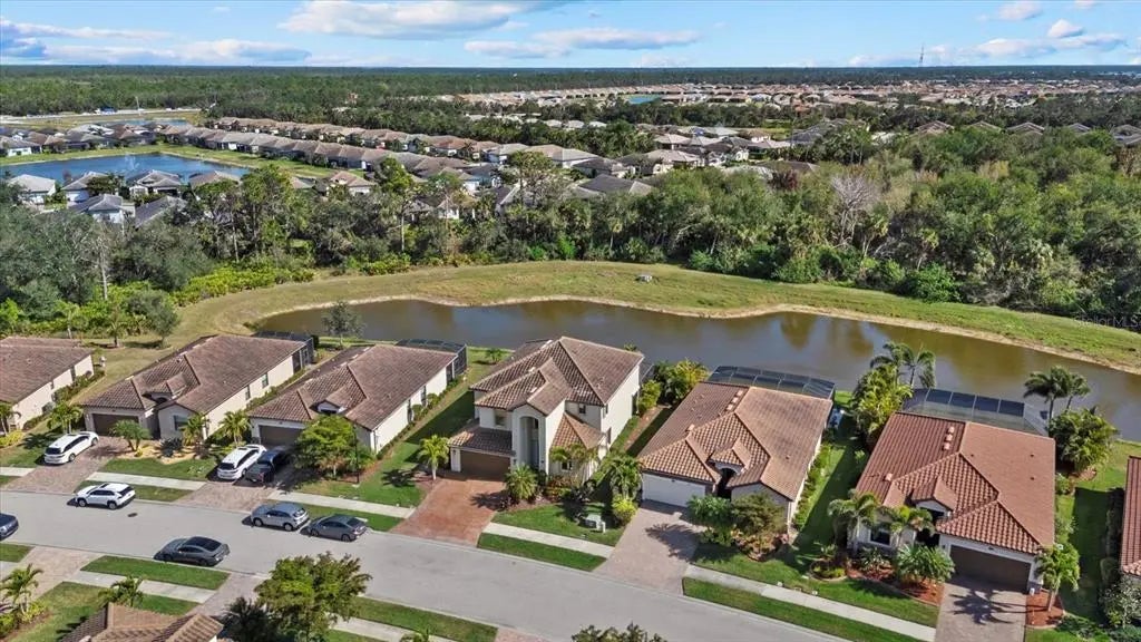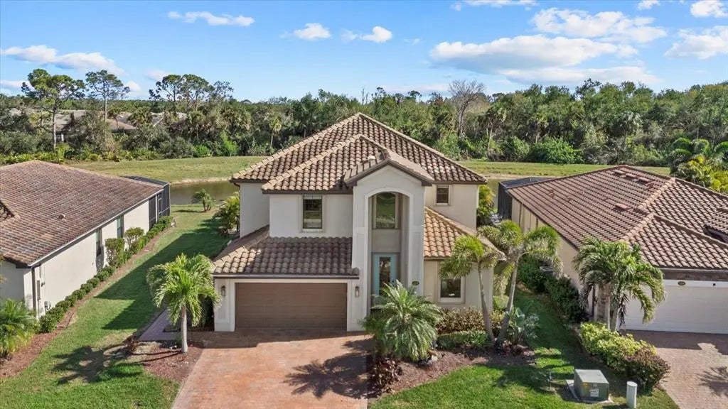 Under contract-accepting backup offers. Under contract-Accepting backup offers. Welcome to this exquisite designer home that seamlessly blends custom craftsmanship with personal style. This stunning residence features a bright and inviting kitchen, highlighted by a magnificent 84” x 80” Quartzite island that comfortably seats eight. The layout includes two spacious living rooms, as well as separate dining and living areas, making it perfect for both entertaining and everyday living. With five well-appointed bedrooms and three full bathrooms, this home offers ample space for relaxation and privacy. The main level boasts a luxurious custom shower that complements the downstairs bedroom. Step outside to your custom travertine patio, where you can unwind by the designer heated saltwater pool, complete with a serene waterfall, a heated spa, and a generous tanning ledge. Additional features include a tandem three-car garage with an expanded paver driveway, leading to a private paver sidewalk that enhances access to the backyard. The home is equipped with accordion hurricane shutters on all windows and doors for added security, as well as a power/electric remote control rolling lanai hurricane enclosure on the back lanai for convenience. Newly installed recessed lighting throughout the second level adds a modern touch. Nestled in a picturesque setting within Gran Paradiso, this immaculately maintained home offers breathtaking lake views and a serene non-buildable preserve. It is truly move-in ready. Gran Paradiso fosters a vibrant, family-friendly atmosphere, complete with a full-time Activities Director who curates a diverse array of events. From luaus and corn hole tournaments to holiday celebrations and themed parties, there’s something for everyone to enjoy. Residents can take advantage of a resort-style pool, fitness center, basketball courts, playground, walking trails, billiard/poker game room, library, and clubhouse featuring a spa, sauna, steam room, tennis courts, and pickleball. Conveniently located in the Wellen Park area, this community is close to beautiful beaches, restaurants, shopping, and the Atlanta Braves Cool Today Stadium. Gran Paradiso offers a unique blend of natural beauty and active-living amenities that cater to all lifestyles. Come and experience the exceptional lifestyle this remarkable home and community have to offer!
