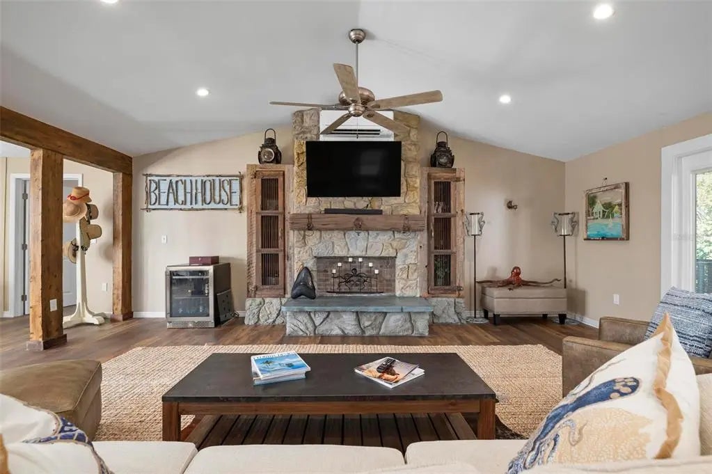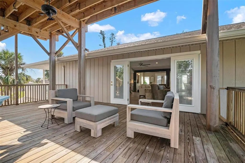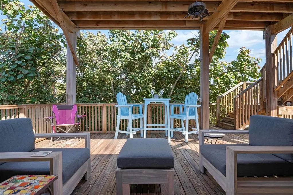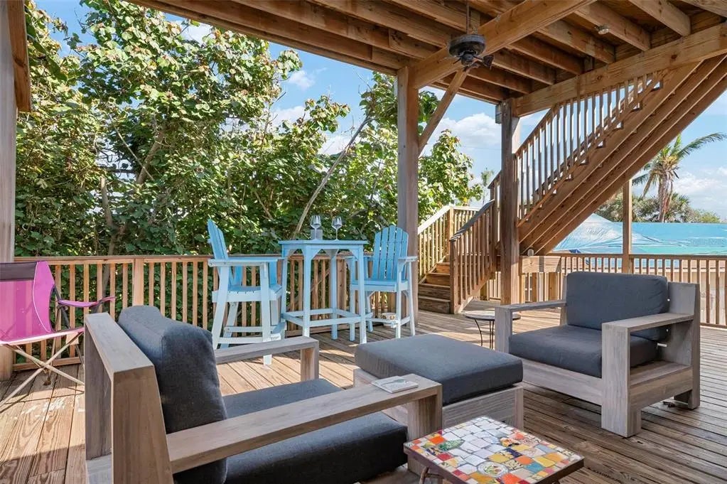 Welcome to your Beach House! This beautifully renovated home offers serene views of the Gulf of Mexico and is just a short walk to Golden Beach easement. This Key-West inspired elevated home has a complete wrap around walkway! The remodeled kitchen, includes an amazing brick floor, stainless appliances, custom cabinets with soft close, a coffee bar and a pantry. The quaint dinette area is just off the kitchen and is part of the Great Room. Check out the vaulted ceilings, a decorative floor to ceiling fireplace, ample space for lounging and double French doors which open to the large covered deck built to hurricane codes, allowing the gulf breeze flow thru! Each bedroom has its own renovated bath for privacy. Laminate wood flooring runs throughout the living and bedrooms. The huge covered deck off the back of the house is additional exterior living space as you will spend many hours relaxing amongst nature. Ascend to the upper deck and take in the Gulf view! Both spaces are amazing for entertaining as well as kicking back! The ground floor houses a one car garage with another two bays for a workshop, work out room or storage. No water damage from hurricanes! The front and back French doors are hurricane rated and there is protection for the remaining windows. Very quiet, innovative 3 mini split system for the a/c and heat pump which cools and heats evenly and is very energy efficient. Just set the temp and forget it. Should you join the Golden Beach HOA for $50/yr, additional benefits are: parking for cars and carts, bicycle racks, guest privileges, beach access benches, and Gazebo with picnic tables and beach shower. Enjoy the Island lifestyle with its quaint shops, outside cafes, live theater, and much more.