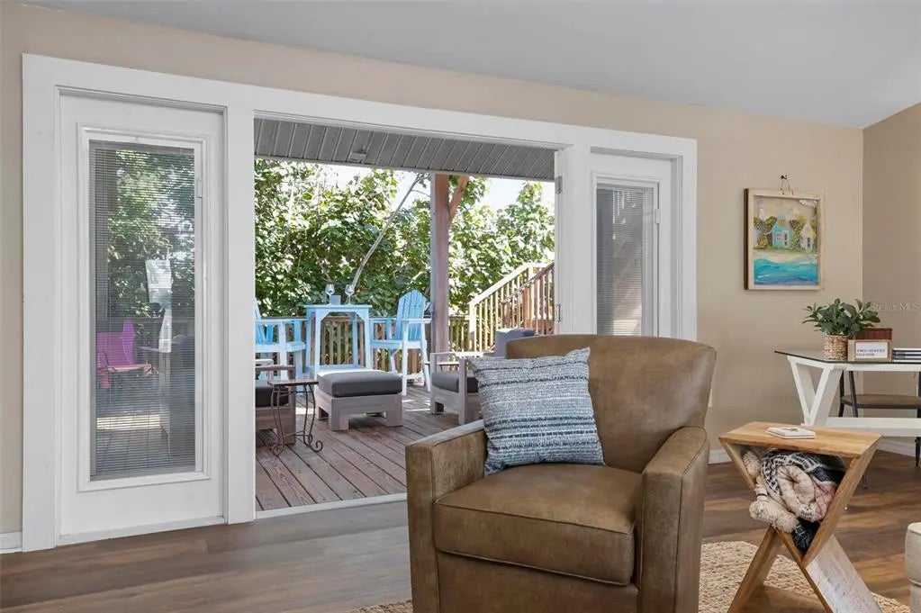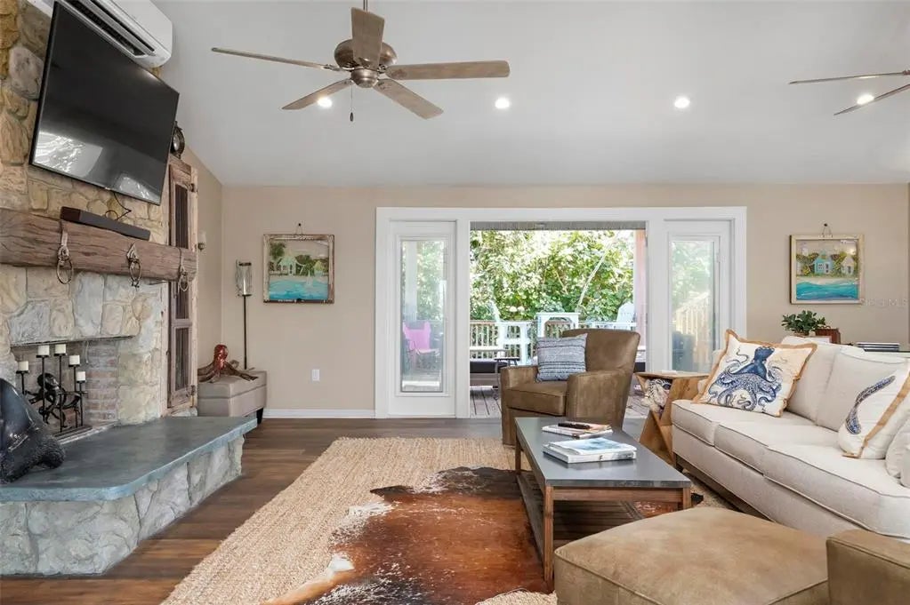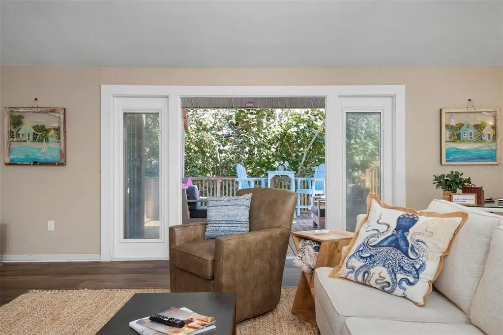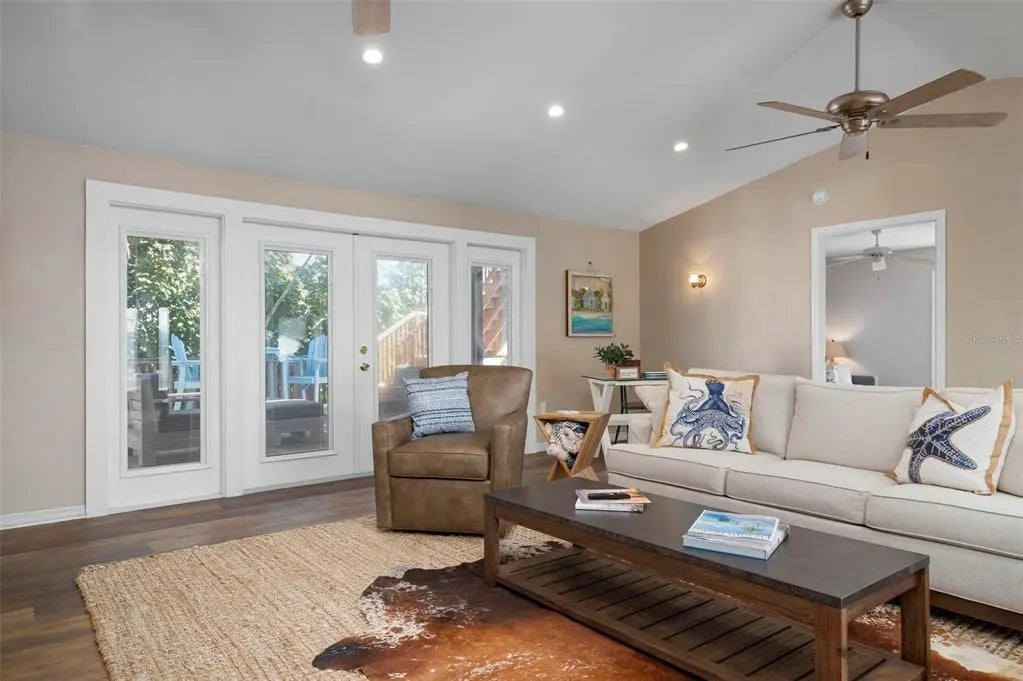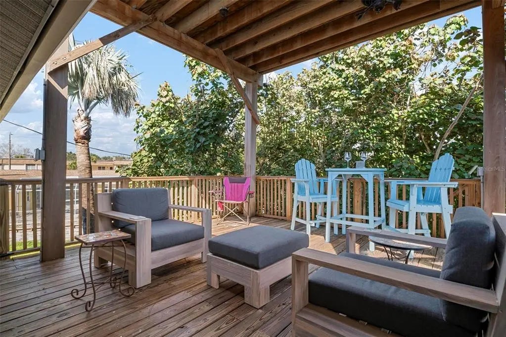 Welcome to your Beach House! This beautifully renovated home offers serene views of the Gulf of Mexico and is just a short walk to Golden Beach easement. This Key-West inspired elevated home has a complete wrap around walkway! The remodeled kitchen, includes an amazing brick floor, stainless appliances, custom cabinets with soft close, a coffee bar and a pantry. The quaint dinette area is just off the kitchen and is part of the Great Room. Check out the vaulted ceilings, a decorative floor to ceiling fireplace, ample space for lounging and double French doors which open to the large covered deck built to hurricane codes, allowing the gulf breeze flow thru! Each bedroom has its own renovated bath for privacy. Laminate wood flooring runs throughout the living and bedrooms. The huge covered deck off the back of the house is additional exterior living space as you will spend many hours relaxing amongst nature. Ascend to the upper deck and take in the Gulf view! Both spaces are amazing for entertaining as well as kicking back! The ground floor houses a one car garage with another two bays for a workshop, work out room or storage. No water damage from hurricanes! The front and back French doors are hurricane rated and there is protection for the remaining windows. Very quiet, innovative 3 mini split system for the a/c and heat pump which cools and heats evenly and is very energy efficient. Just set the temp and forget it. Should you join the Golden Beach HOA for $50/yr, additional benefits are: parking for cars and carts, bicycle racks, guest privileges, beach access benches, and Gazebo with picnic tables and beach shower. Enjoy the Island lifestyle with its quaint shops, outside cafes, live theater, and much more.
