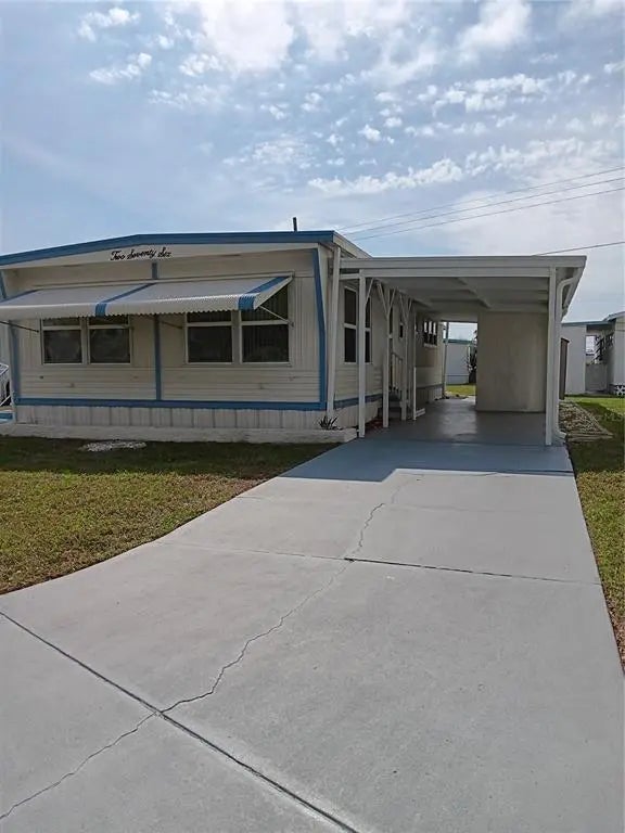 Great Opportunity for a Handyman, flipper or Investor. Just reduced the price. Lots of potential here! This is a small 55+ Community. 2 Bedr 1.1 bath 840 SF Mobile home in quiet subdivision with low assessments. No hurricane damage to house and there is a New carport. A/C 2018. A shed / workshop for your tools, garden supplies, projects, bikes & more with an additional shed out back for the garbage cans. Community offers a Heated Pool, suffleboard a small Clubhouse with a billard & laundry room, plenty of activities. $195 monthly Association fees include water, trash removal, sewer, pool & ground maintenance. It is just minutes from downtown shopping and beaches. Sorry, No Pets here!