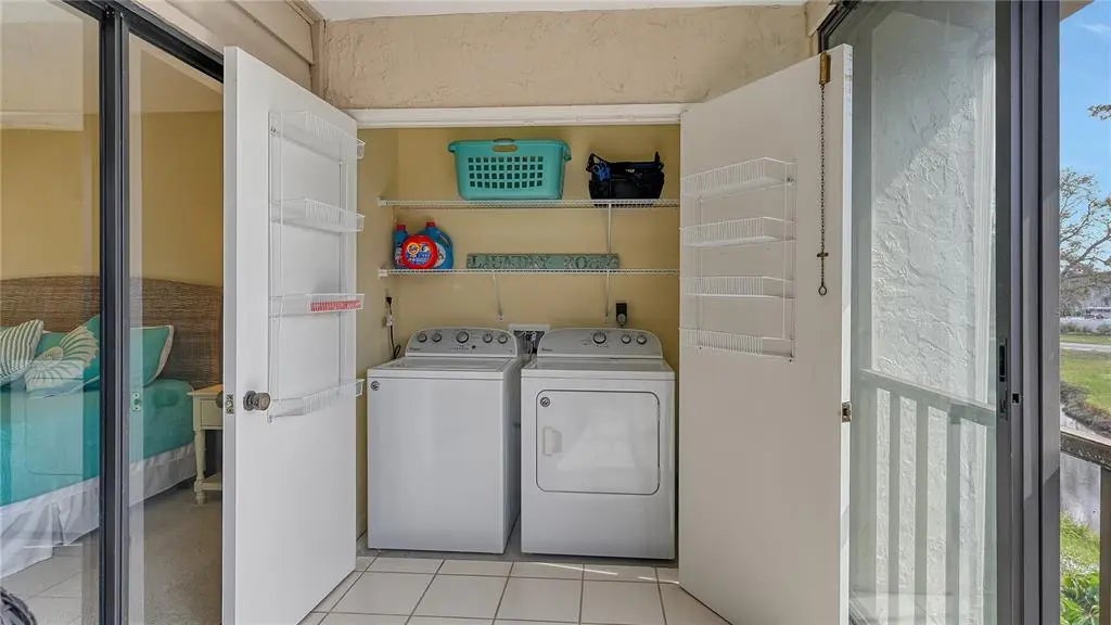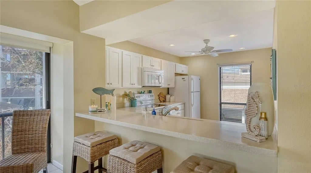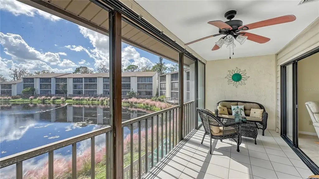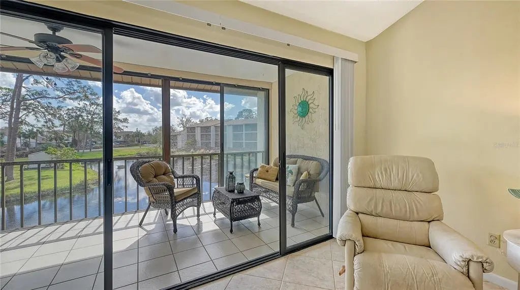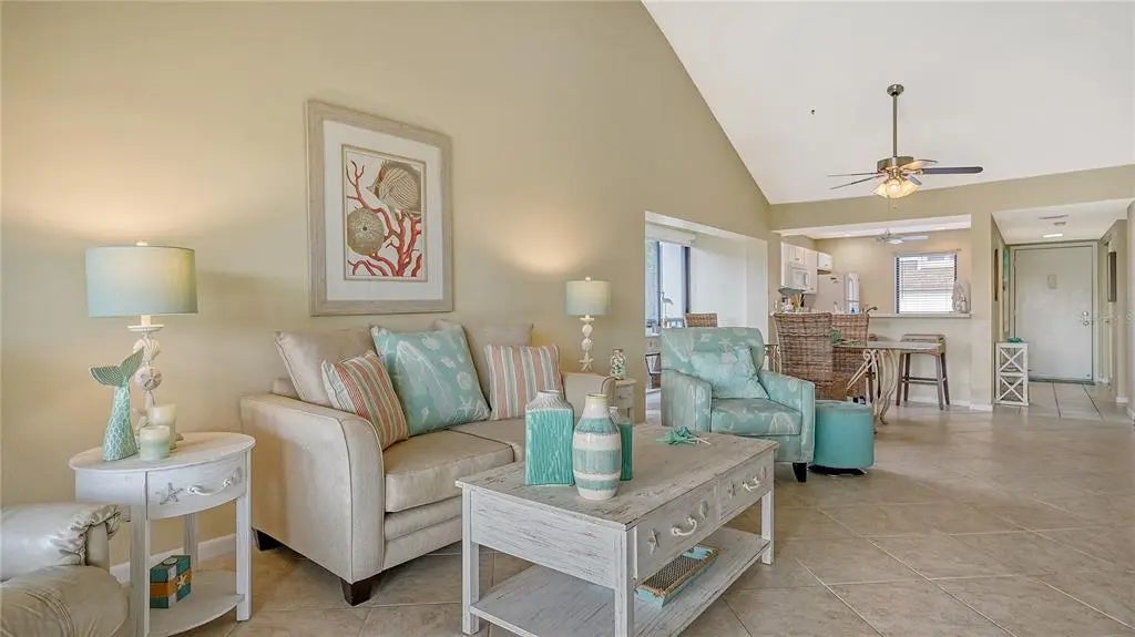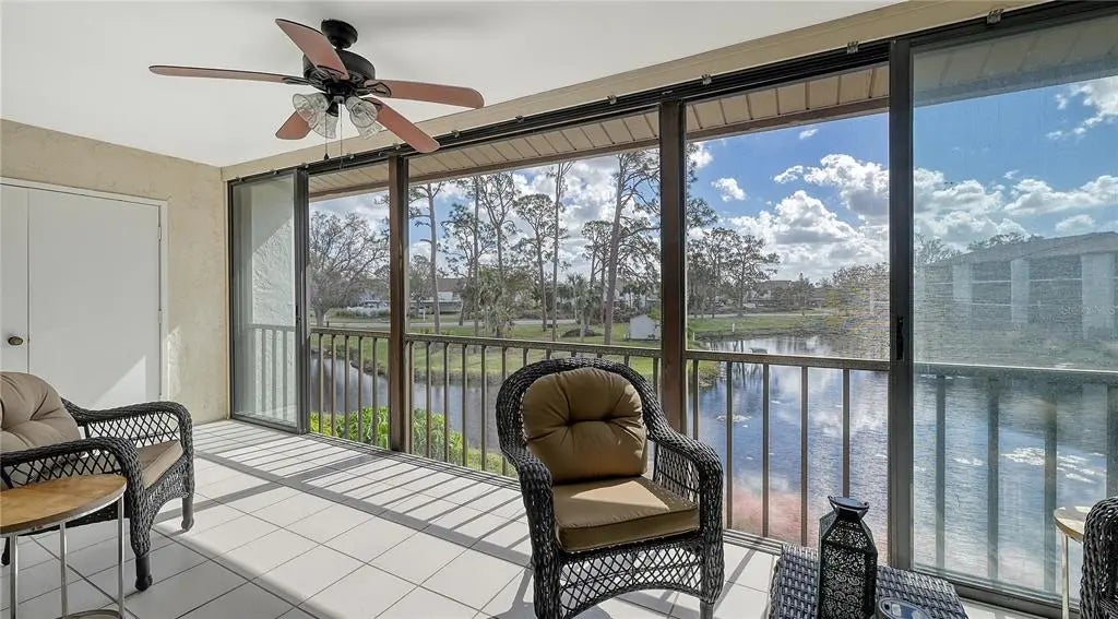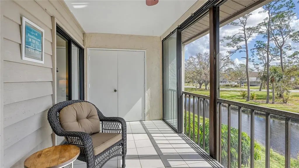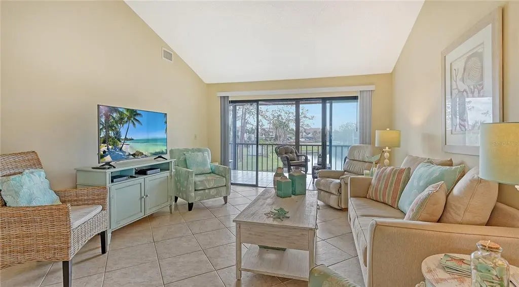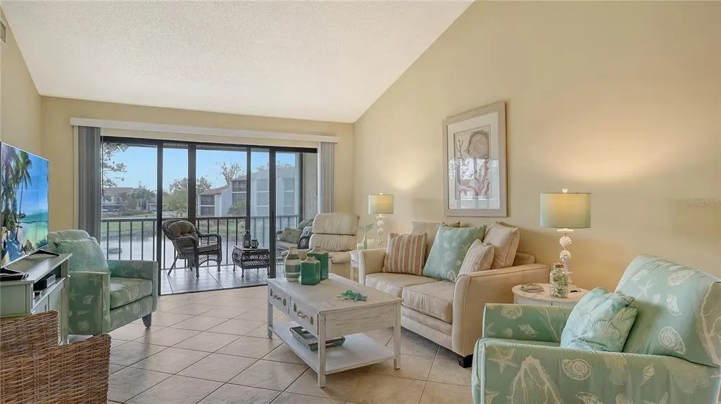 The minute you enter this STUNNING 2 bed, 2 bath end unit condo you'll notice the beautifully UPDATED kitchen with solid surface counters and pass through breakfast bar to the dining area. Plenty of natural light inside from the many patio doors and windows along with a vaulted ceiling in the living/dining room area that makes this space seem larger and airy. The covered, glassed in and screened lanai will be your new favorite place. It runs the entire back of the condo and overlooks a TRANQUIL POND with relaxing water fountain view. Enjoy the warm breezes and lush tropical landscaping while making new memories with family and friends here. Tile flooring in the kitchen, open concept dining/living room and lanai. The primary bedroom has private patio sliding doors to the lanai with more water views. Both bedrooms have walk in closets and both bathrooms are nicely UPDATED. Beautiful designer inspired tropical theme carried all throughout the condo with carefully selected decor and furniture that's ALL included! PLUS you also have your own full sized washer and dryer within the lanai of this unit. Great rental potential here with a minimum of 3 months rental possible with Association approval. NEW roof on condo building in 2024. One pet welcome! Bird Bay is a resort style community in a fabulous location with all kinds of amenities to enjoy from community pools, many pickleball and tennis courts, fitness room, shuffleboard, active Clubhouse and much more! Only a few miles to Venice Beach and Venice Island with delicious restaurants, boutique shoppes, festivals, golfing, boating, fishing and much, much more to discover! The Legacy Bike Trail and Venetian Waterway park are close by and a great way to explore the area and stay fit! Time to "Live on vacation" everyday and make this wonderful second floor TURNKEY FURNISHED condo yours!