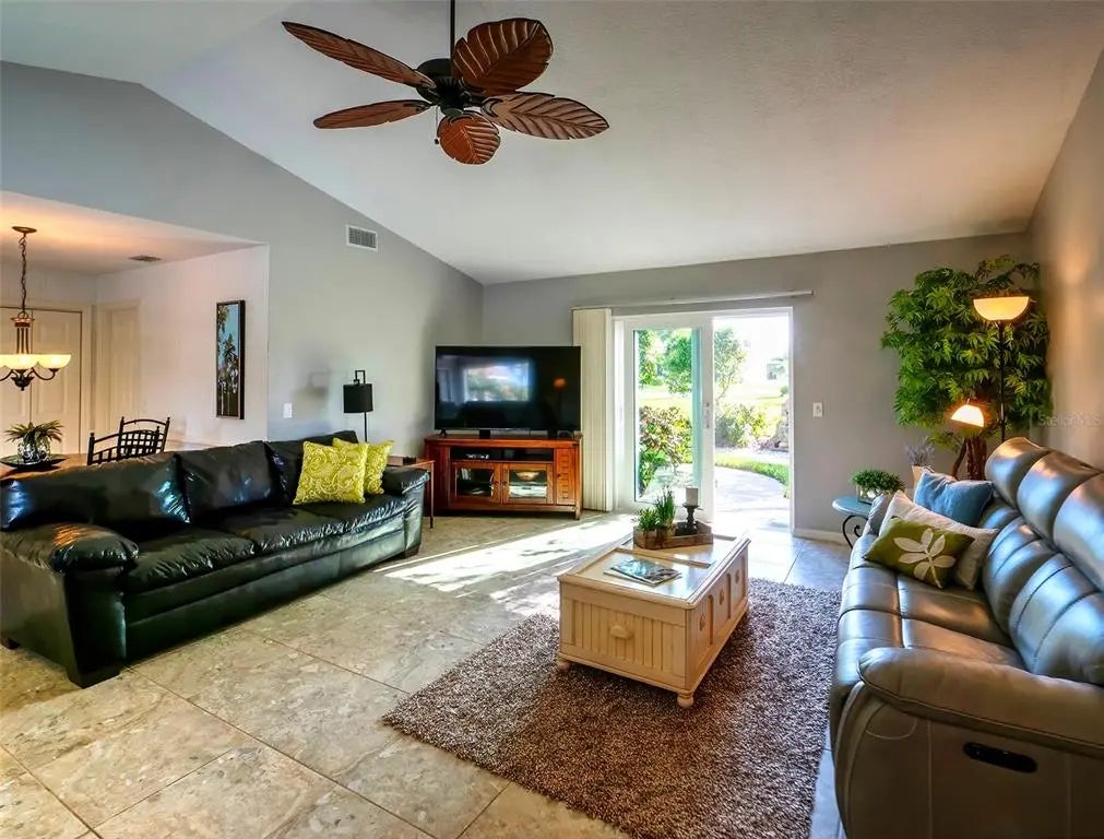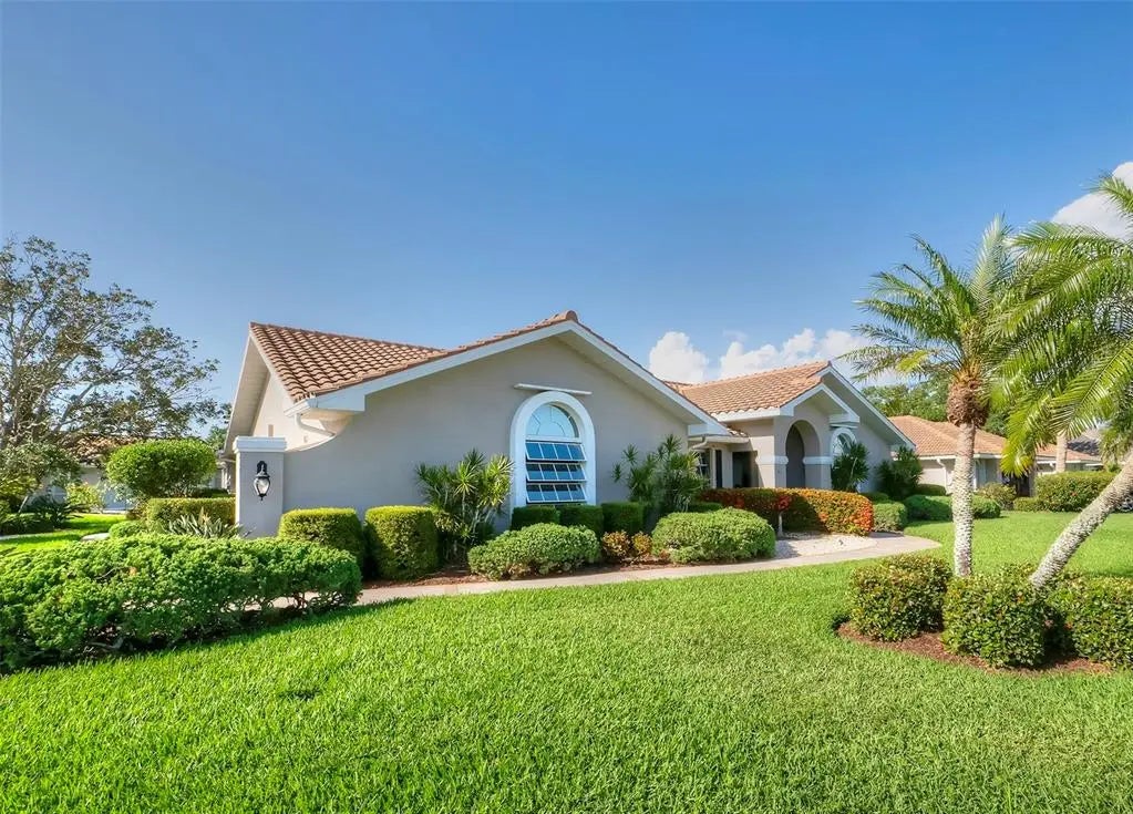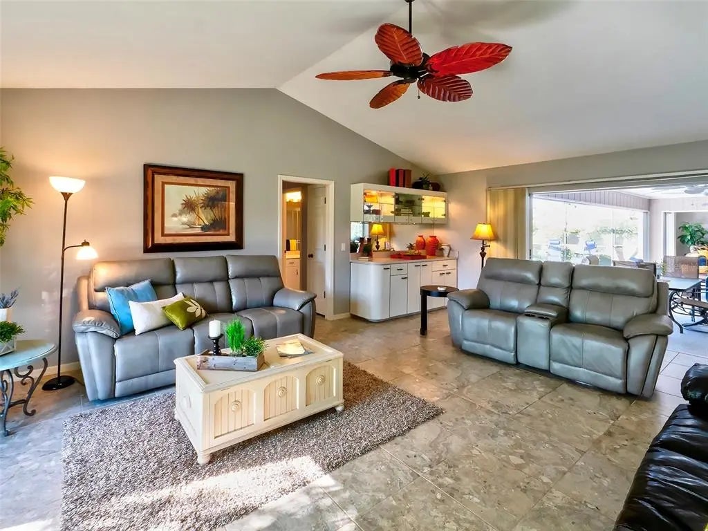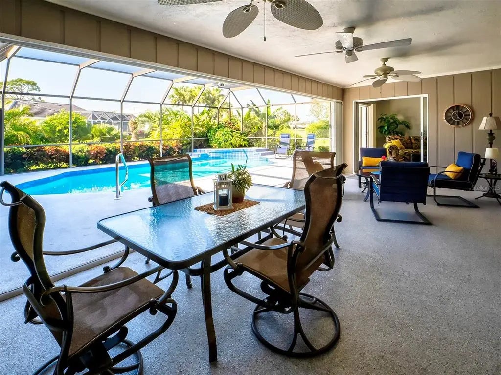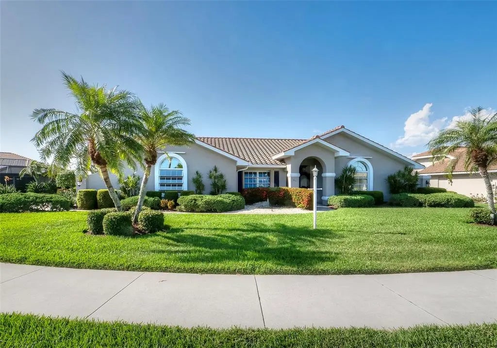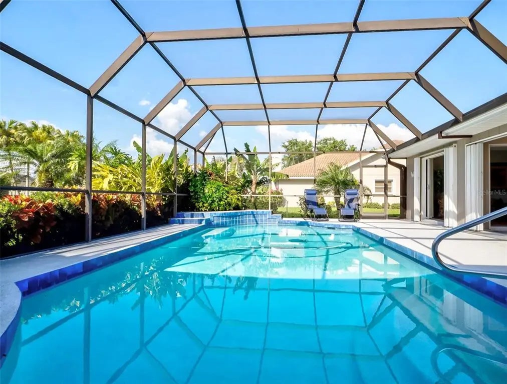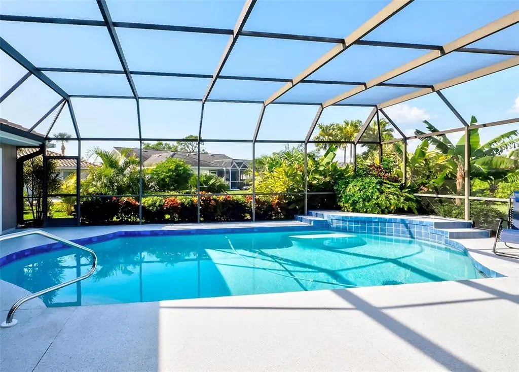 Spacious and thoughtfully designed, this 3 bedroom, 2 bath saltwater pool home features an expansive layout with generously sized rooms throughout. With over 90 feet of frontage and a side-entry garage, the home offers fantastic curb appeal. The spacious master suite features sliding doors that open directly to the pool deck, creating a seamless indoor-outdoor retreat. The en-suite bath offers a jetted garden tub, a walk-in shower, and dual vanities, providing both luxury and convenience. This home is filled with exceptional features, including a double-door entry, soaring cathedral ceilings, and a spacious eat-in kitchen with a breakfast bar and convenient pool pass-through. Additional highlights include elegant plantation shutters, a central vacuum system, separate living and family rooms, and a well-designed split-floor plan for added privacy and functionality. Hurricane shutters throughout provide added security. Step outside to your private oasis, where the sparkling heated saltwater pool overlooks the tropical lush landscape, providing both tranquility and privacy. Nestled in an outstanding gated golf course community with clubhouse, pool & spa, pickleball, tennis, and library, you'll enjoy easy access to shopping, medical facilities, downtown Venice, and the beautiful Gulf beaches. This home comes turnkey furnished- all you need to bring is your tooth brush. Luxurious entertainment room: watch your favourite sports and movies on the 65” tv with two high-end recliner sofas. Don't miss this exceptional opportunity!