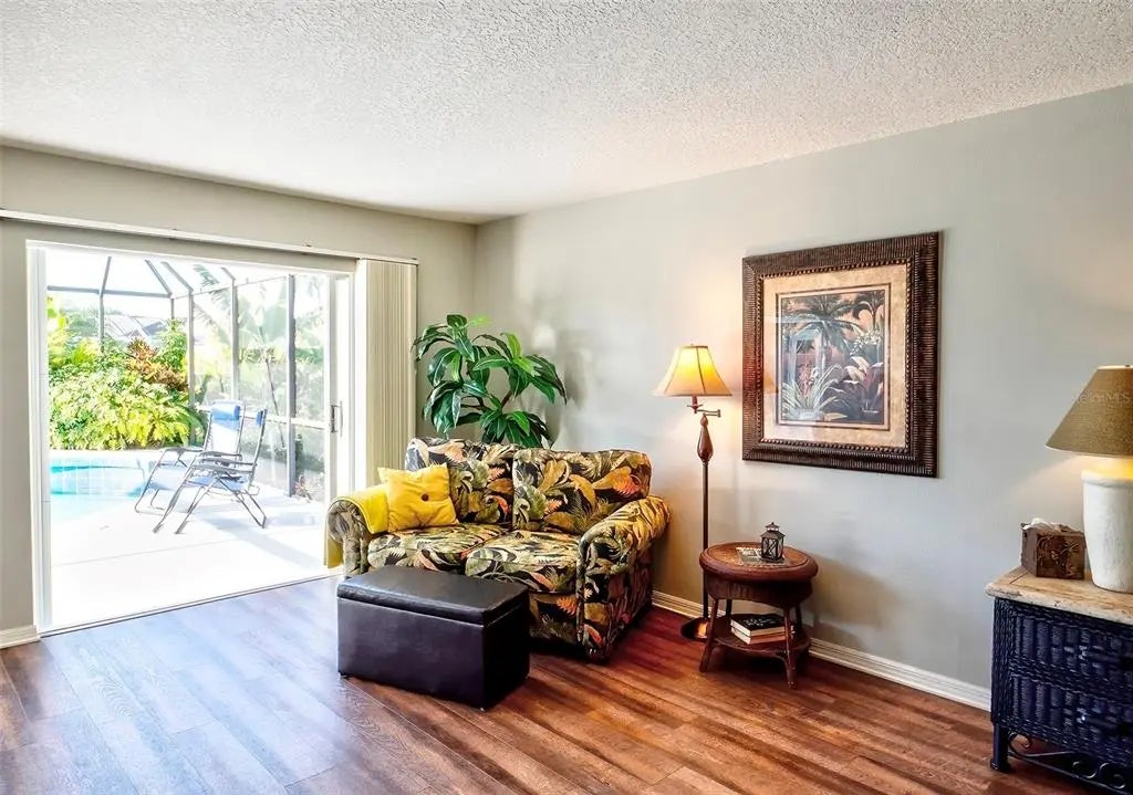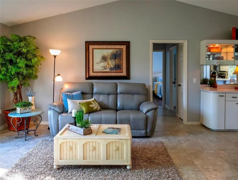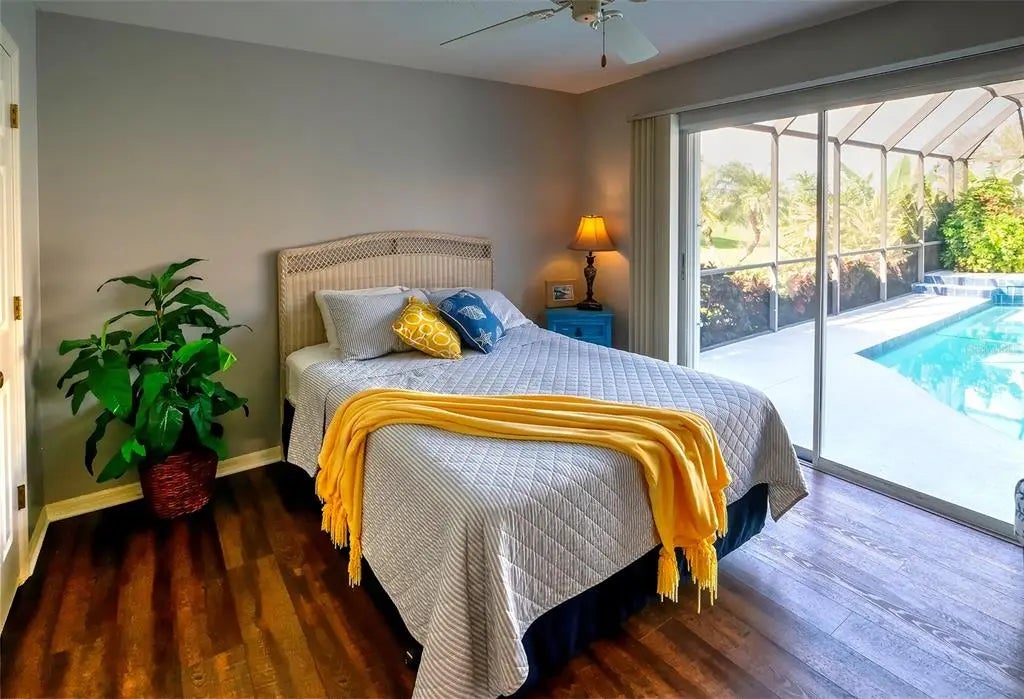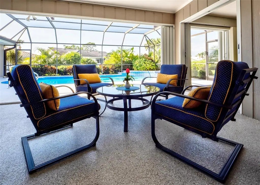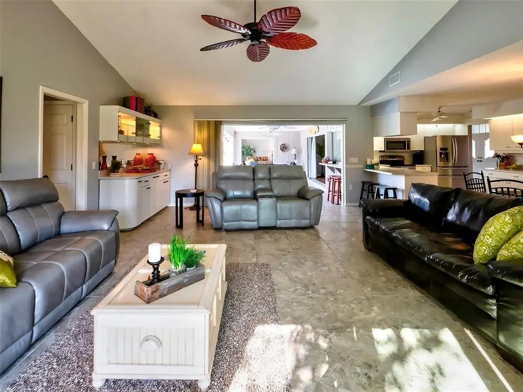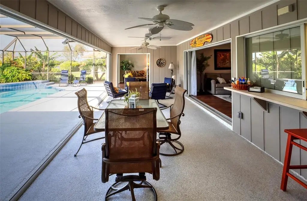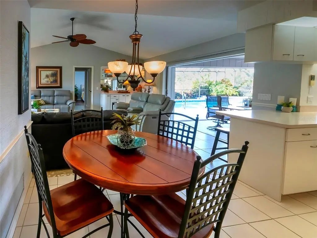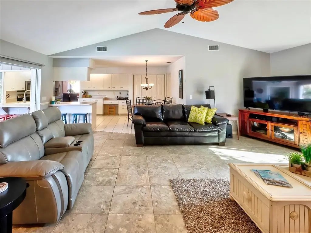 Spacious and thoughtfully designed, this 3 bedroom, 2 bath saltwater pool home features an expansive layout with generously sized rooms throughout. With over 90 feet of frontage and a side-entry garage, the home offers fantastic curb appeal. The spacious master suite features sliding doors that open directly to the pool deck, creating a seamless indoor-outdoor retreat. The en-suite bath offers a jetted garden tub, a walk-in shower, and dual vanities, providing both luxury and convenience. This home is filled with exceptional features, including a double-door entry, soaring cathedral ceilings, and a spacious eat-in kitchen with a breakfast bar and convenient pool pass-through. Additional highlights include elegant plantation shutters, a central vacuum system, separate living and family rooms, and a well-designed split-floor plan for added privacy and functionality. Hurricane shutters throughout provide added security. Step outside to your private oasis, where the sparkling heated saltwater pool overlooks the tropical lush landscape, providing both tranquility and privacy. Nestled in an outstanding gated golf course community with clubhouse, pool & spa, pickleball, tennis, and library, you'll enjoy easy access to shopping, medical facilities, downtown Venice, and the beautiful Gulf beaches. This home comes turnkey furnished- all you need to bring is your tooth brush. Luxurious entertainment room: watch your favourite sports and movies on the 65” tv with two high-end recliner sofas. Don't miss this exceptional opportunity!