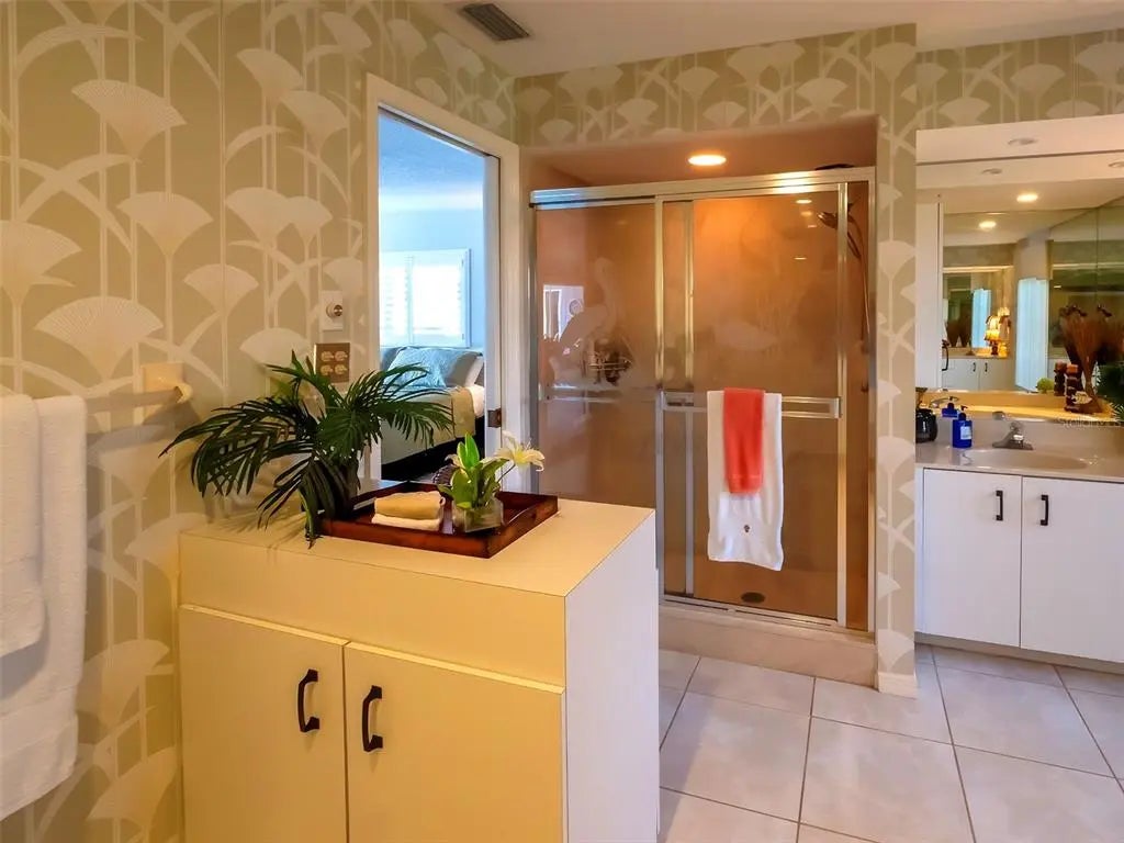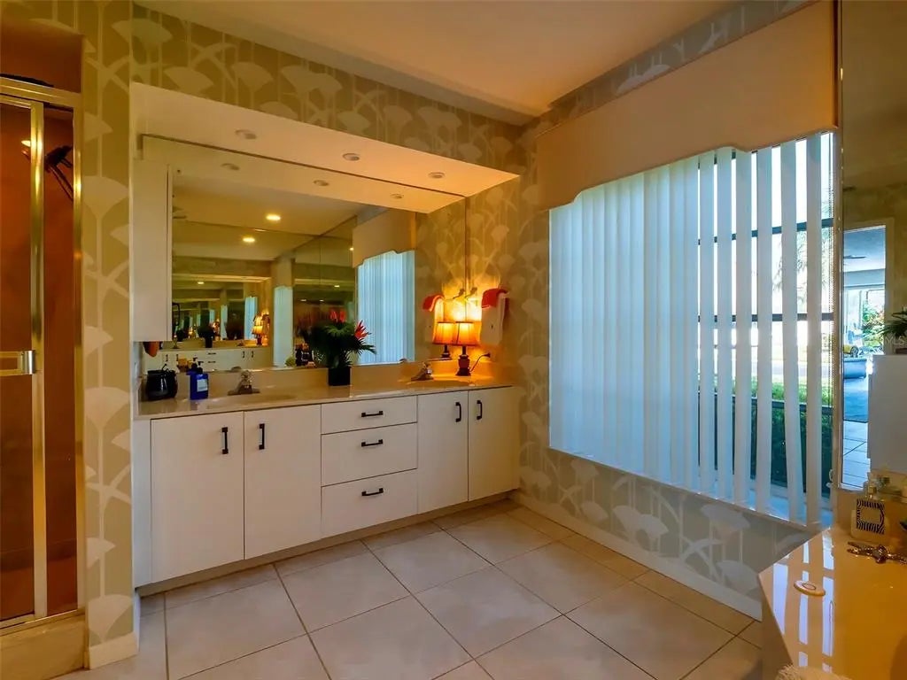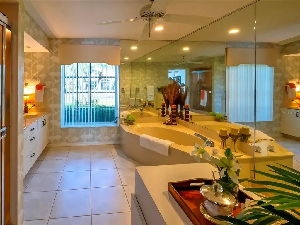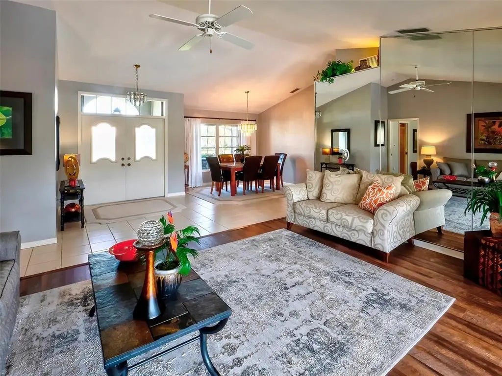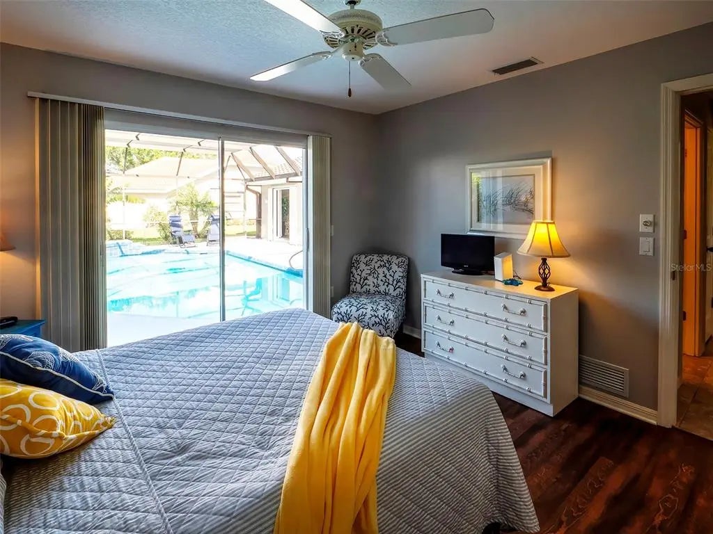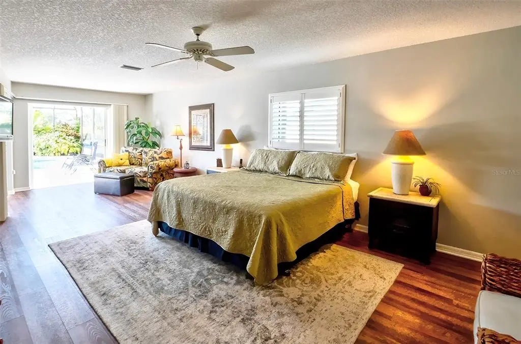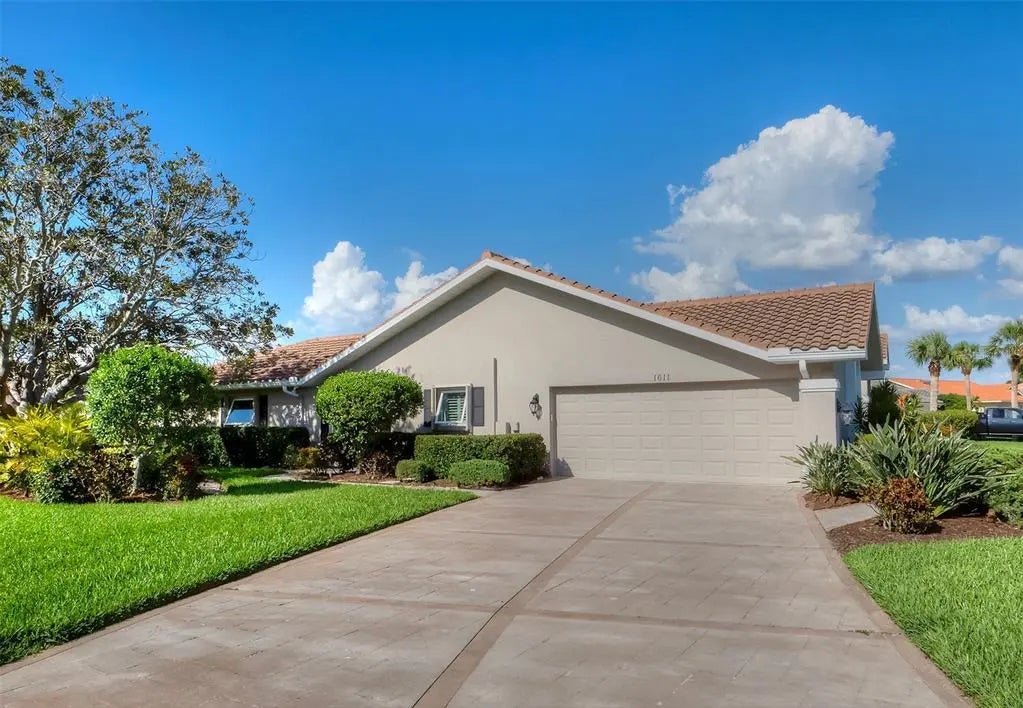 Spacious and thoughtfully designed, this 3 bedroom, 2 bath saltwater pool home features an expansive layout with generously sized rooms throughout. With over 90 feet of frontage and a side-entry garage, the home offers fantastic curb appeal. The spacious master suite features sliding doors that open directly to the pool deck, creating a seamless indoor-outdoor retreat. The en-suite bath offers a jetted garden tub, a walk-in shower, and dual vanities, providing both luxury and convenience. This home is filled with exceptional features, including a double-door entry, soaring cathedral ceilings, and a spacious eat-in kitchen with a breakfast bar and convenient pool pass-through. Additional highlights include elegant plantation shutters, a central vacuum system, separate living and family rooms, and a well-designed split-floor plan for added privacy and functionality. Hurricane shutters throughout provide added security. Step outside to your private oasis, where the sparkling heated saltwater pool overlooks the tropical lush landscape, providing both tranquility and privacy. Nestled in an outstanding gated golf course community with clubhouse, pool & spa, pickleball, tennis, and library, you'll enjoy easy access to shopping, medical facilities, downtown Venice, and the beautiful Gulf beaches. This home comes turnkey furnished- all you need to bring is your tooth brush. Luxurious entertainment room: watch your favourite sports and movies on the 65” tv with two high-end recliner sofas. Don't miss this exceptional opportunity!