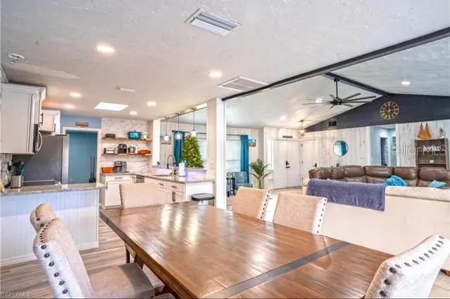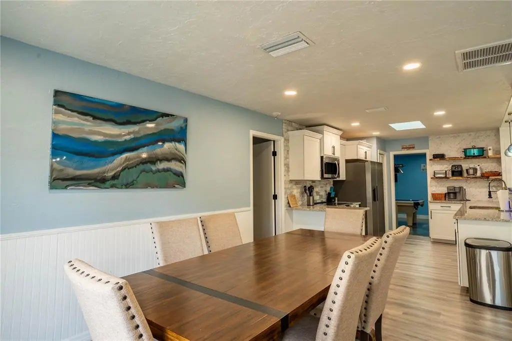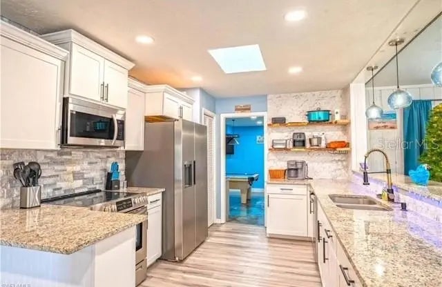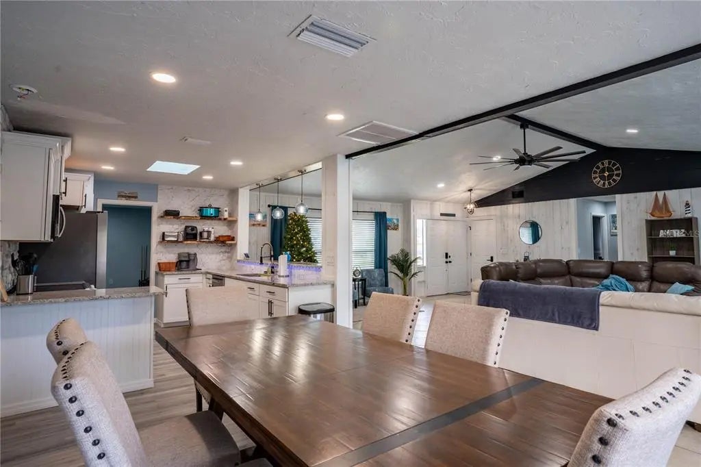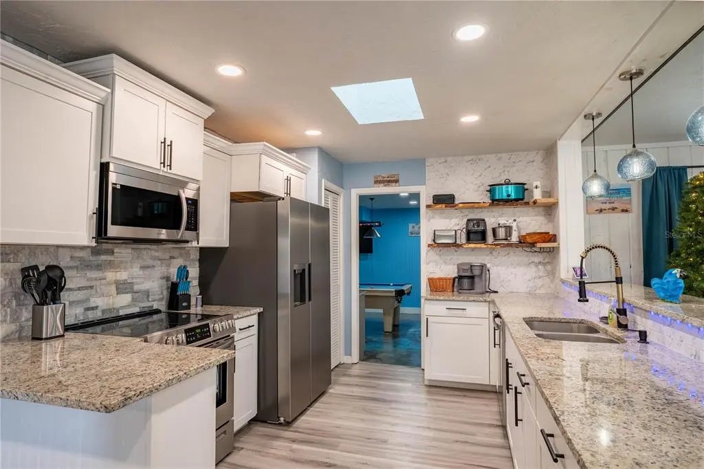 Stunning Fully Remodeled Home with High Ceilings & Backyard Oasis! Step into this beautifully updated 3-bedroom, 2-bathroom home, offering 1,685 sqft of open and airy living space. With cathedral ceilings and soaring high ceilings in every room, this home feels bright and spacious from the moment you walk in. Completely remodeled in 2023, the kitchen is a chef’s dream, featuring brand-new cabinets, granite countertops, a stylish stone wall backsplash, and a 4-person countertop bar—perfect for casual dining or entertaining. The bathrooms have been tastefully upgraded with modern vanities, granite counters, and sleek walk-in showers. A spacious dining area provides plenty of room for gatherings. The living room is the heart of the home, boasting a dramatic 70” ceiling fan and abundant natural light. A new roof was installed in 2019, complete with a skylight to enhance the home’s airy feel. Step outside to your private backyard retreat, where a fully fenced 6’ privacy fence surrounds a stunning PebbleTec-finished swimming pool, completely refinished in 2023—ready for endless summer fun. The oversized 2-car garage is currently a game room, complete with a pool table, dart board, large TV, and a wet bar—an entertainer’s paradise! If needed, it can easily be converted back to a functional garage. This move-in-ready home is packed with modern updates and thoughtful details. Home is currently a short term rental and come come furnished or unfurnished. Don’t miss out on this one—schedule a tour today!