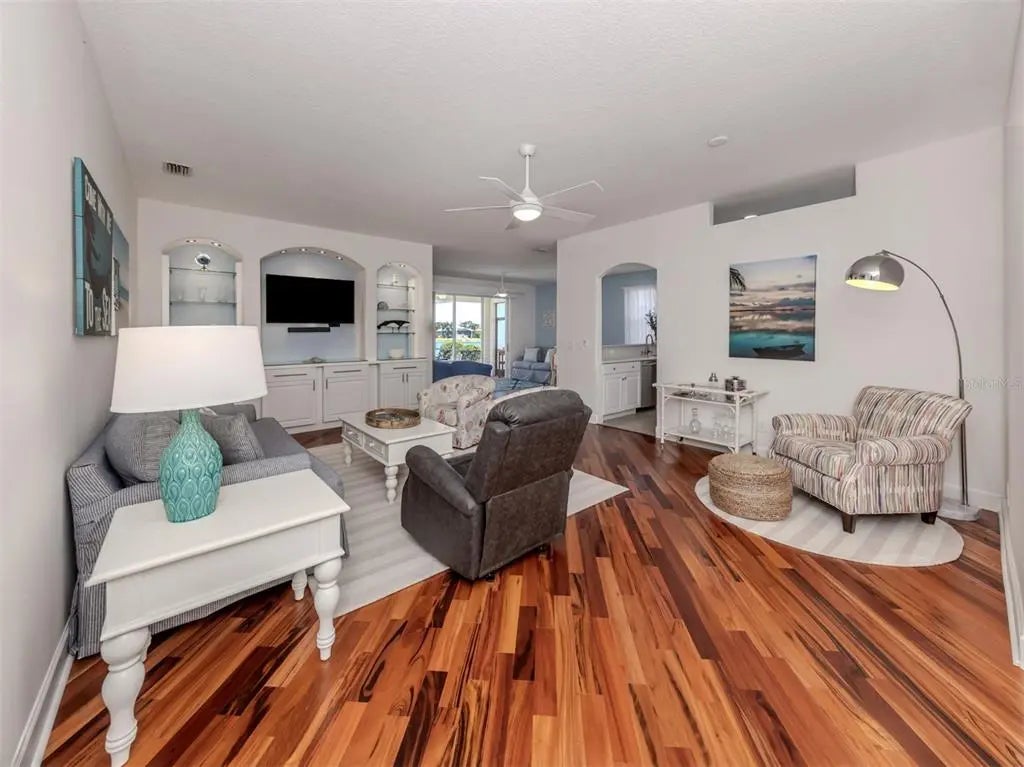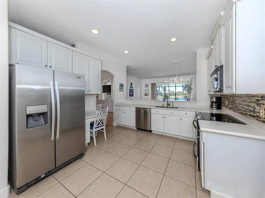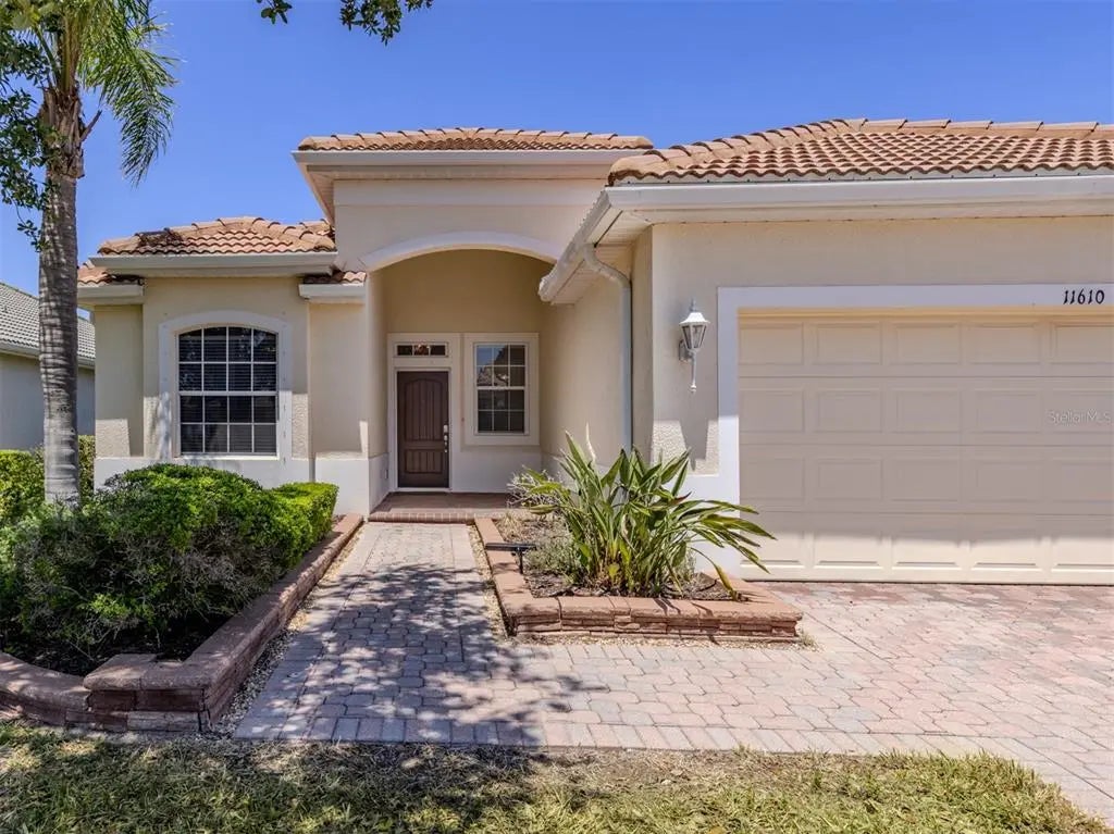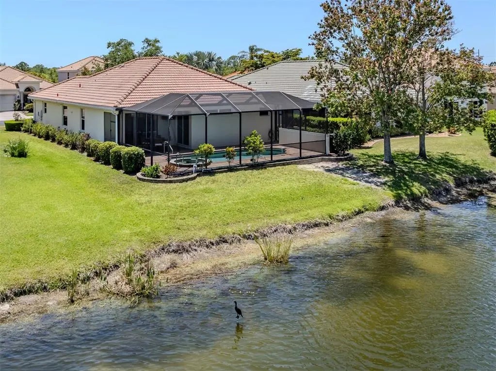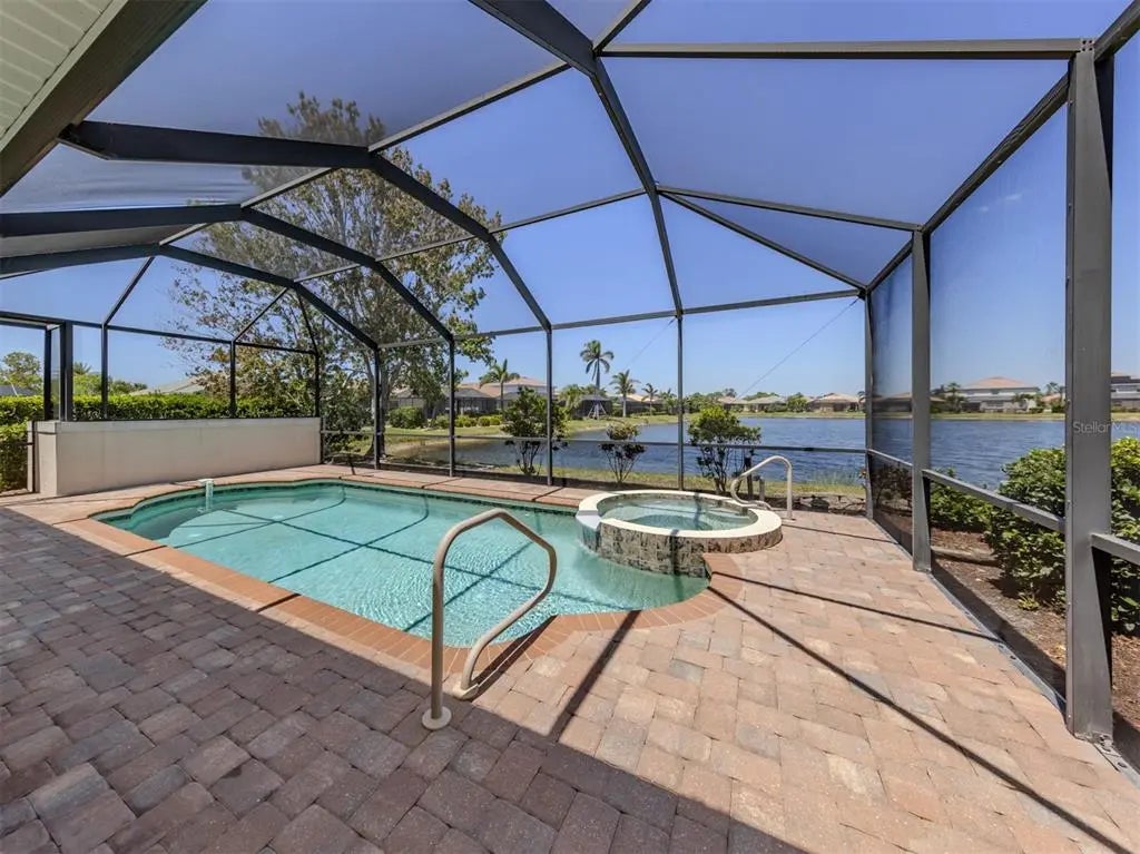 Under contract-accepting backup offers. STUNNING WATER VIEWS!!! Discover the epitome of Florida living in this 1,680-square-foot, hurricane-protected, beautifully appointed, with two bedrooms, two baths, den, turnkey, heated pool home in the gated community of Stoneybrook at Venice. This long-water view home combines modern upgrades, elegant wood and tile flooring throughout, and serene north-facing lanai with long water views, ideal for everyday enjoyment of the pool and lanai. The open concept layout features a living room, family room, versatile den, all enhanced by stylish wood and tile flooring that adds warmth and easy maintenance. The family room boasts sliding glass doors that open to a screened lanai complete with heated pool and spa creating a seamless indoor-outdoor living experience. The primary suite, at the back of the home offers tranquil lake views, walk-in closet, a private en suite with dual sinks and walk-in shower. The second bedroom at the front of the home near the second full bath is ideal for guests or family, while the den provides flexible space for a home office or hobby room. The gourmet kitchen shines with a breakfast nook, pantry, built-in desk, raised opaque panel cabinetry, stainless steel appliances, reverse osmosis filtration system and breakfast bar that overlooks the family room. The laundry room with extra cabinetry for storage leads to the two-car garage featuring extended storage space for bikes, beach chairs and more. Modern upgrades include 2022 air conditioner, 2017 photovoltaic solar system (paid in full), 2024 pool heater, Rinnai tankless water heater with Culligan sediment filter, ensuring efficiency and comfort. Delivered fully furnished in turnkey condition, this home is move-in ready. Stoneybrook at Venice is a family-friendly community with many amenities such as a guarded gate, community center, fitness center, CATV, gathering room with kitchen, movie room, resort-style pool, hot tub, splash pool, sand volleyball, playground, ball fields, splash park and pickleball courts coming soon as monies have been allocated. Close to Interstate 75 and downtown Venice, the newly built Sarasota Memorial Hospital, shopping, dining, pristine Gulf beaches, Sarasota County's A-rated schools and Atlanta Braves spring training ballpark.