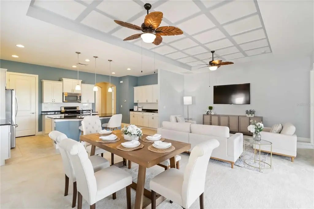 - Interior FeaturesCeiling Fan(s), High Ceilings, Kitchen/Family Room Combo, Living Room/Dining Room Combo, Open Floorplan, Solid Surface Counters, Solid Wood Cabinets, Split Bedroom, Thermostat, Tray Ceiling(s), Walk-In Closet(s), Window Treatments