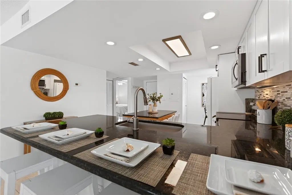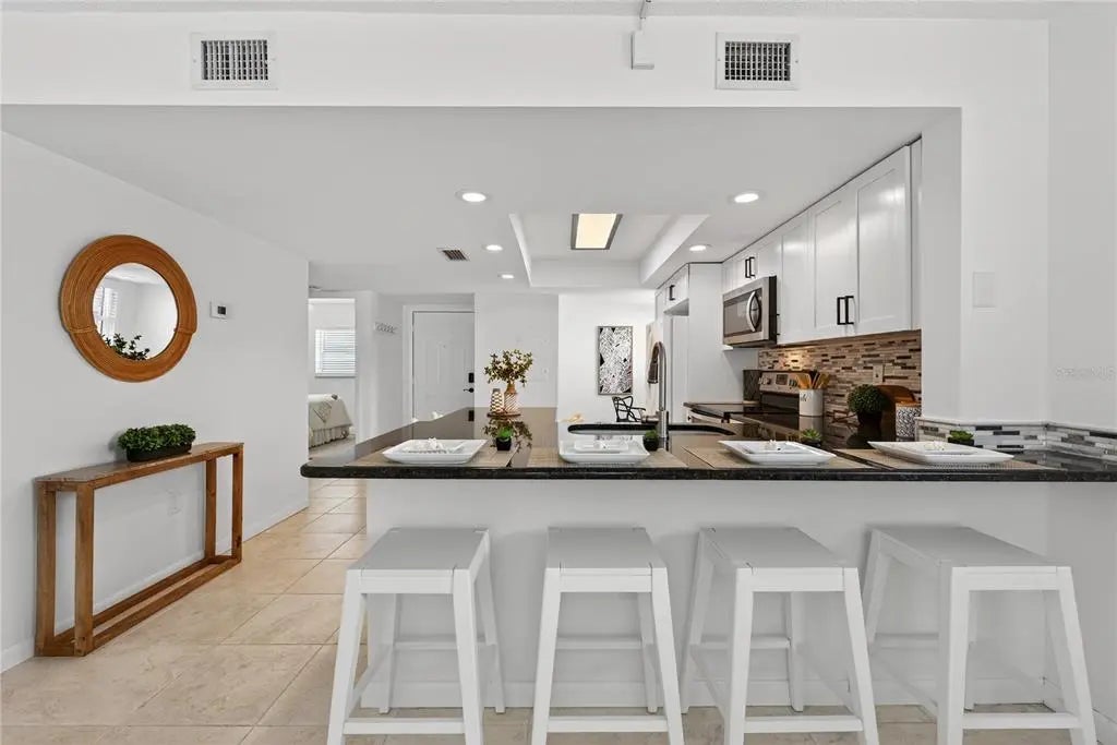 WELCOME TO YOUR BEACHSIDE BLISS ON MANASOTA KEY WHERE EVERYDAY FEELS LIKE A VACATION! This 2 bedroom, 2 bathroom, 1,046 sq ft condo can be used as a seasonal rental with a minimum 30 rental and is located in the heart of the laid-back Manasota Key lifestyle, where you're just a short walk or bike ride from popular local spots like The Waverly, Lock 'N Key, SandBar Tiki & Grille, and the White Elephant Pub—perfect for enjoying fresh seafood, tropical cocktails, and live music by the water. Spend the day exploring beach shops, grabbing a sweet treat from one of the ice cream shops, or renting a boat or kayak to explore the bay. Embark on a dolphin tour or unwind with a sunset cruise as the day winds down. Just steps away enjoy deeded beach access—grab your chair and stroll across the street to unwind in the sand or toast the sunset with a glass of wine. Prefer a quiet day closer to home? Relax by the heated community pool. Additional highlights include ground-level storage unit for your beach and fishing gear and covered assigned parking. Your sun-drenched condo is the epitome of stylish coastal living, where you can wake up and take in the sunrise overlooking Lemon Bay from your screened lanai or community dock. Inside, an open-concept layout seamlessly blends the kitchen, dining, and living areas, extending out to the lanai and bringing the outdoors in. You'll love the freshly painted interior, ceramic tile flooring throughout, granite countertops, marble tile backsplash, and crisp white cabinetry. The breakfast bar and granite-topped dining table perfect for casual meals or entertaining guests. The primary suite is a serene retreat with private lanai access, a spacious walk-in closet, and an updated ensuite bathroom. A stackable washer and dryer, A BRAND NEW ELECTRICAL PANEL 2025, hurricane-impact windows and motorized roll-down shutters along with a one-year American Home Shield Warranty add everyday convenience and peace of mind. Just a short drive away, historic Dearborn Street in downtown Englewood offers farmers markets, art walks, boutiques, and lively community events, adding even more charm and culture to your coastal lifestyle. Your beach life awaits! Schedule your showing today!